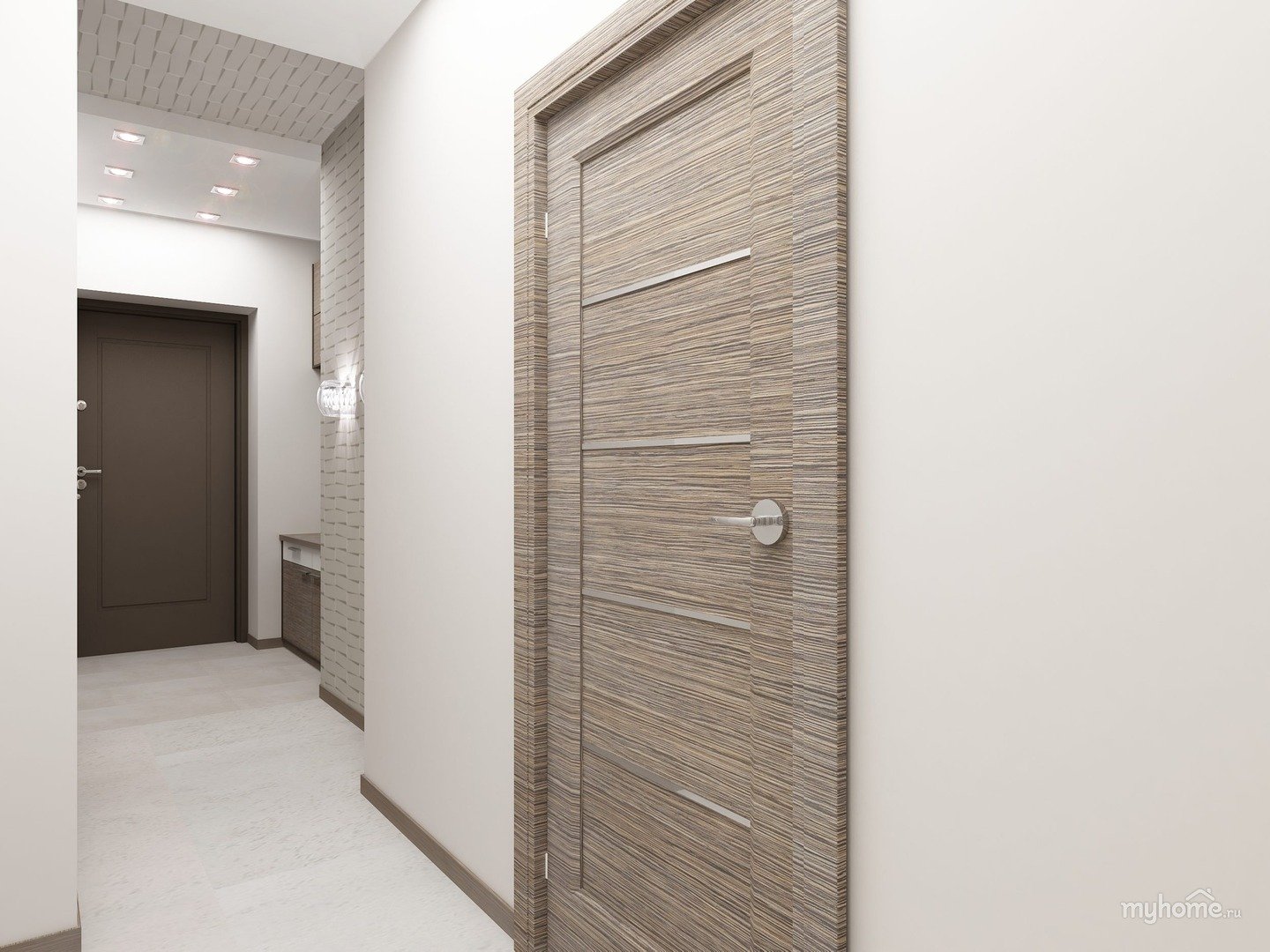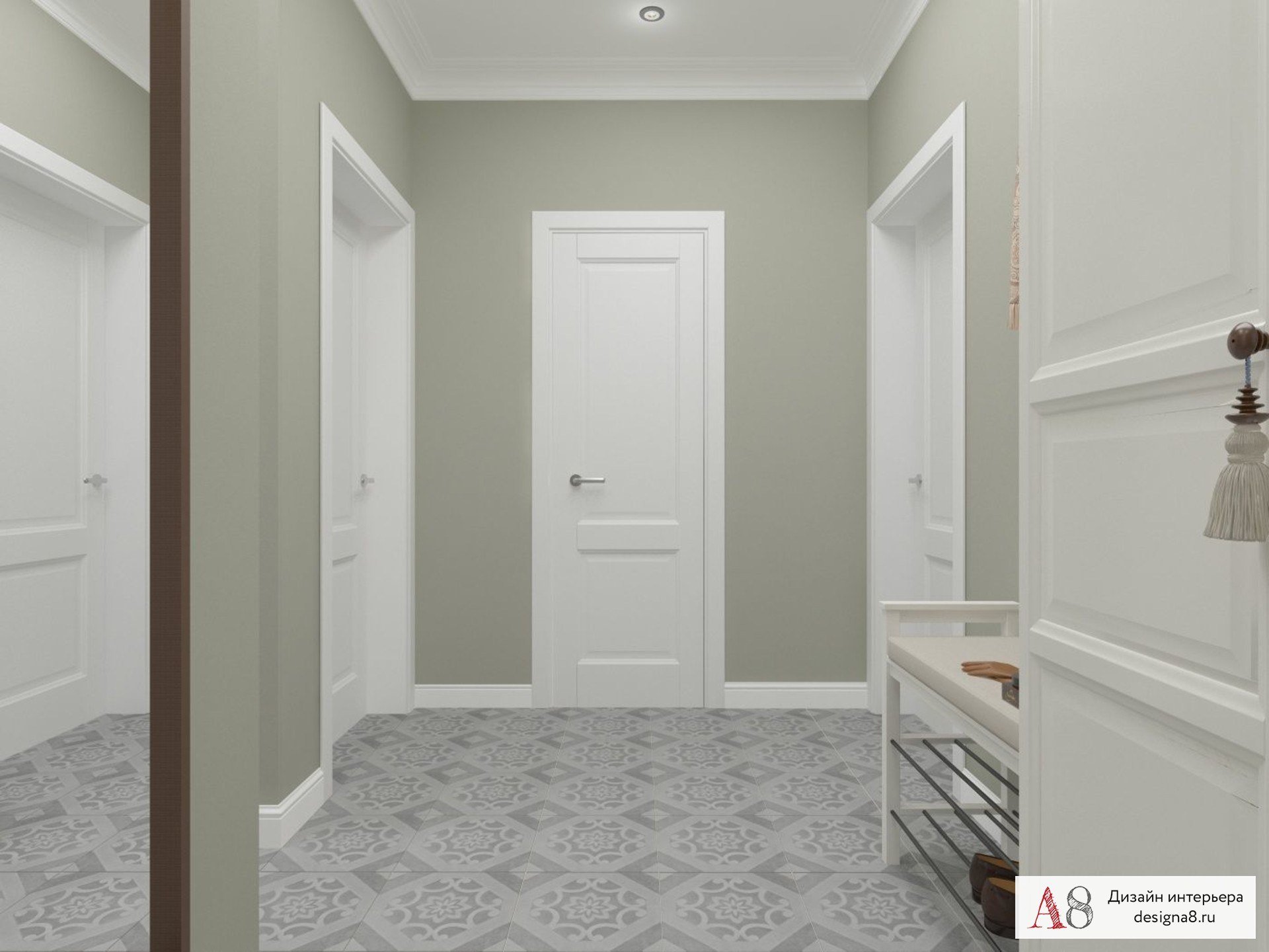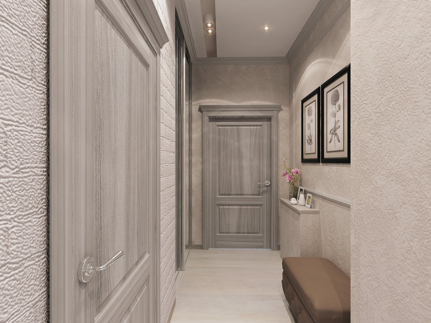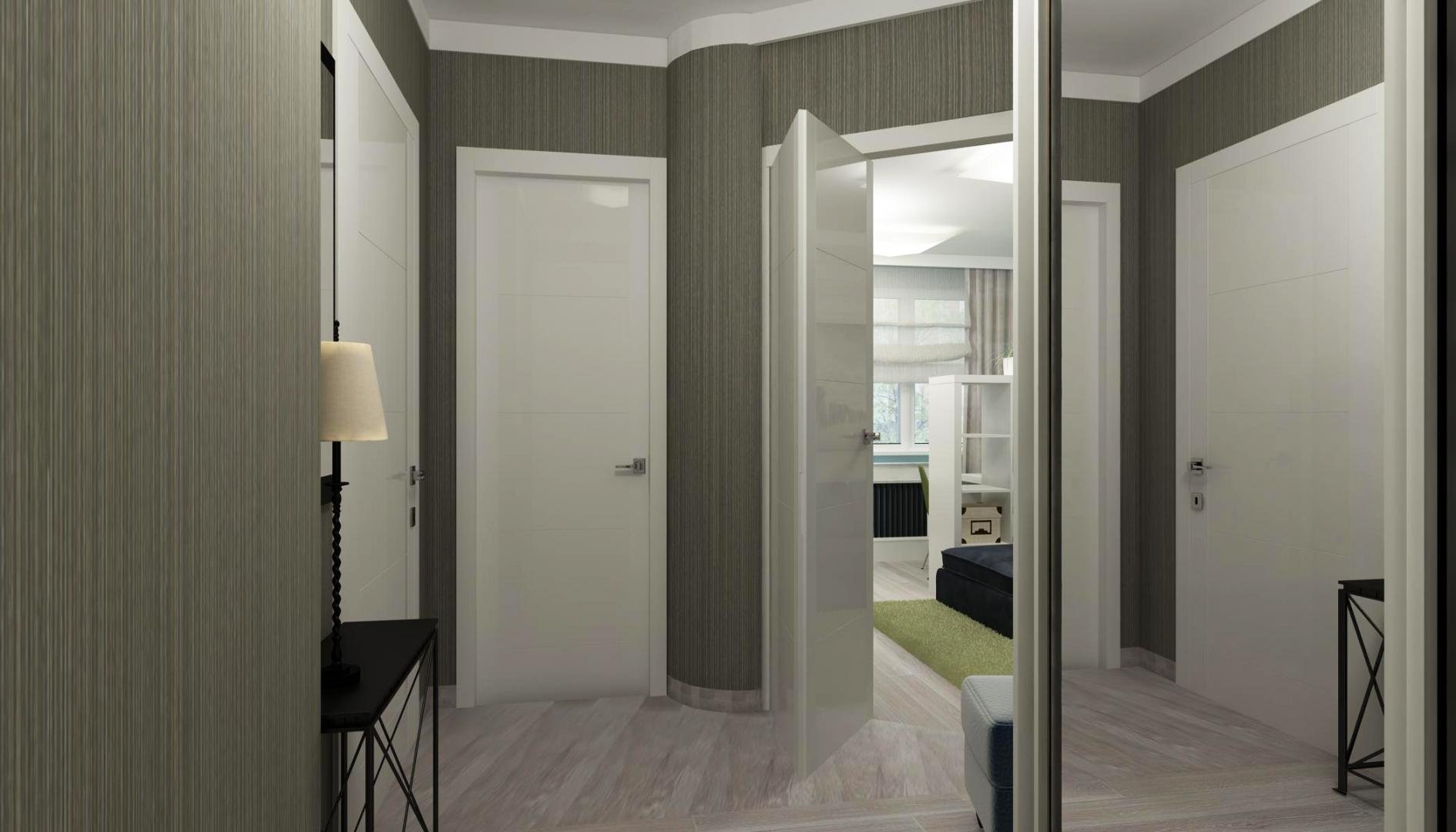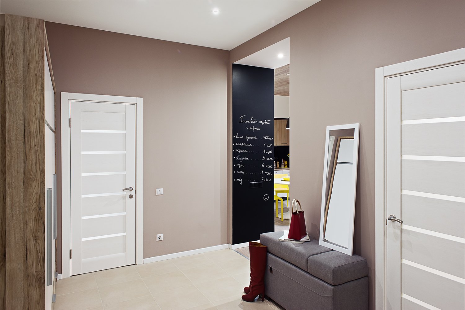 Интерьер в серых тонах с белыми плинтусами и дверями