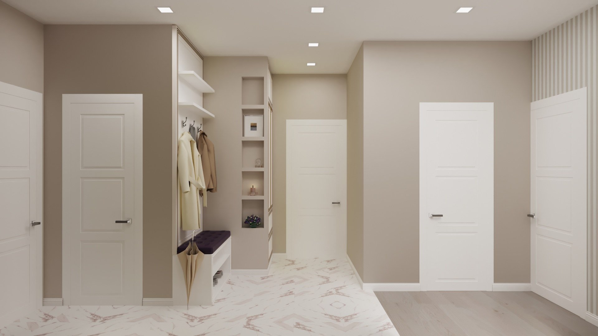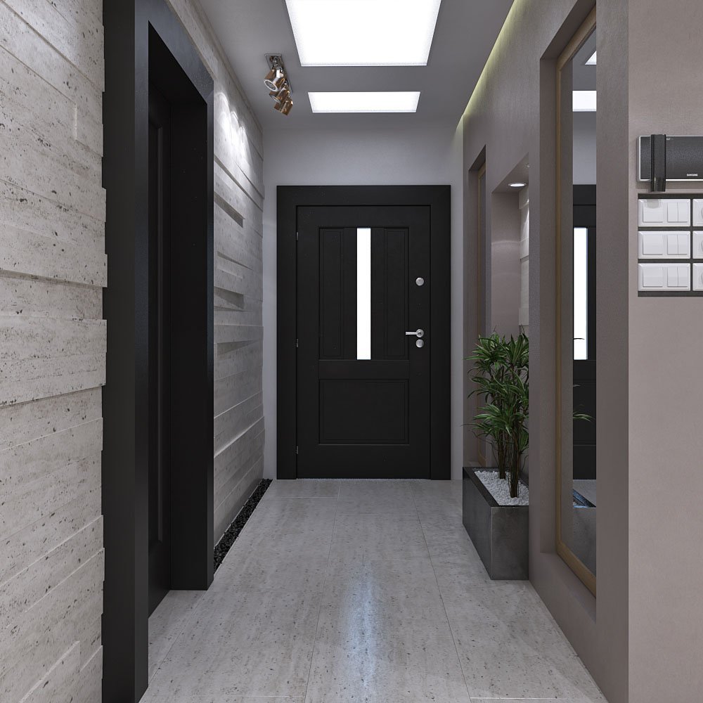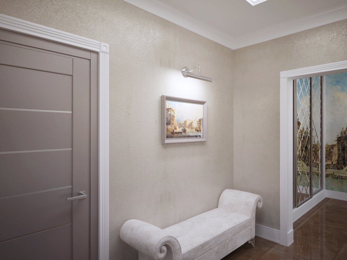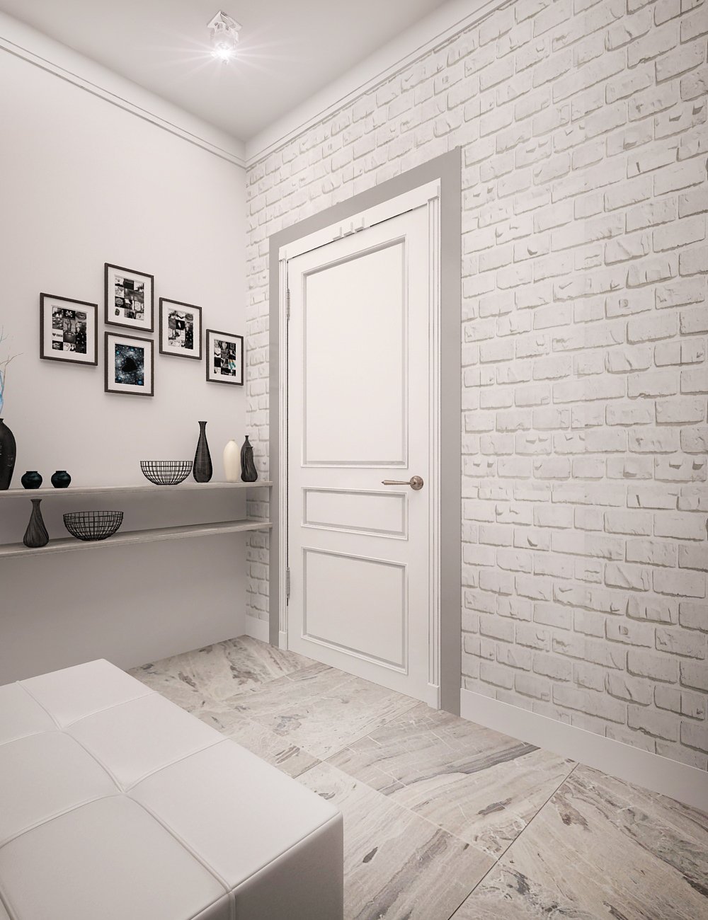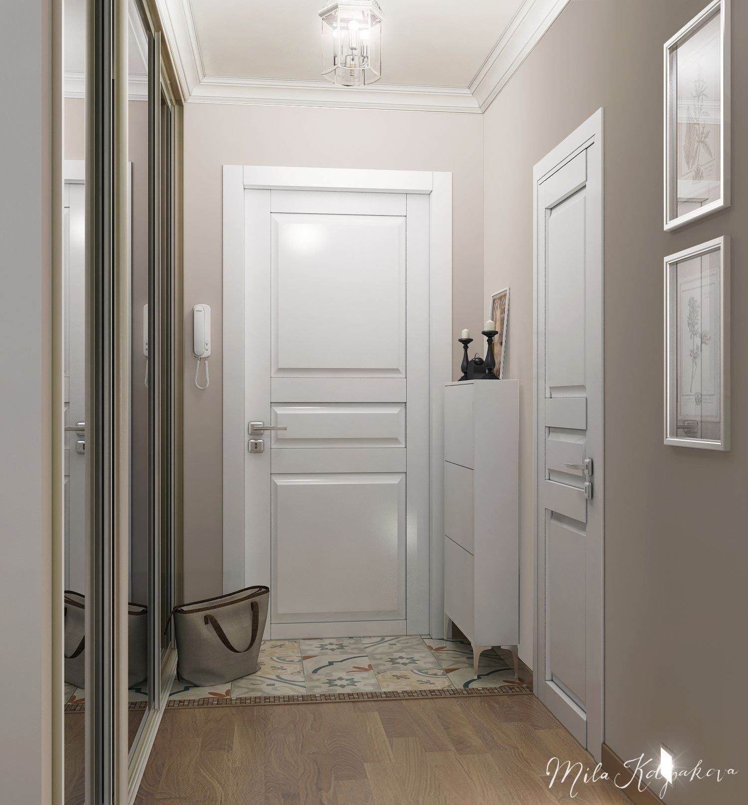 Интерьер в серых тонах с белыми плинтусами и дверями