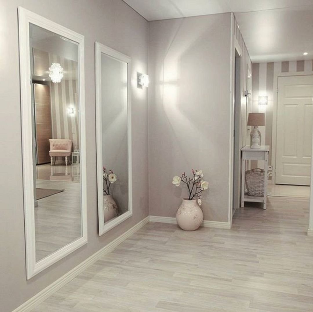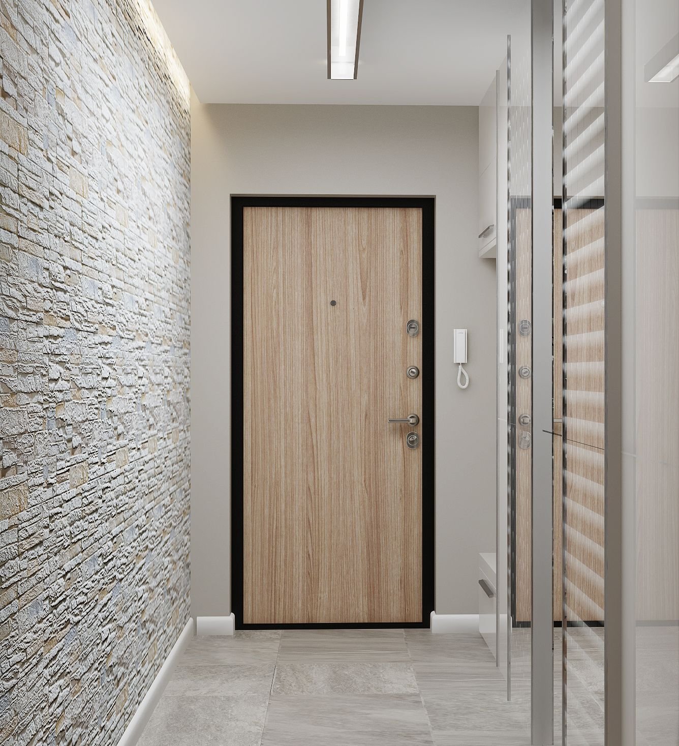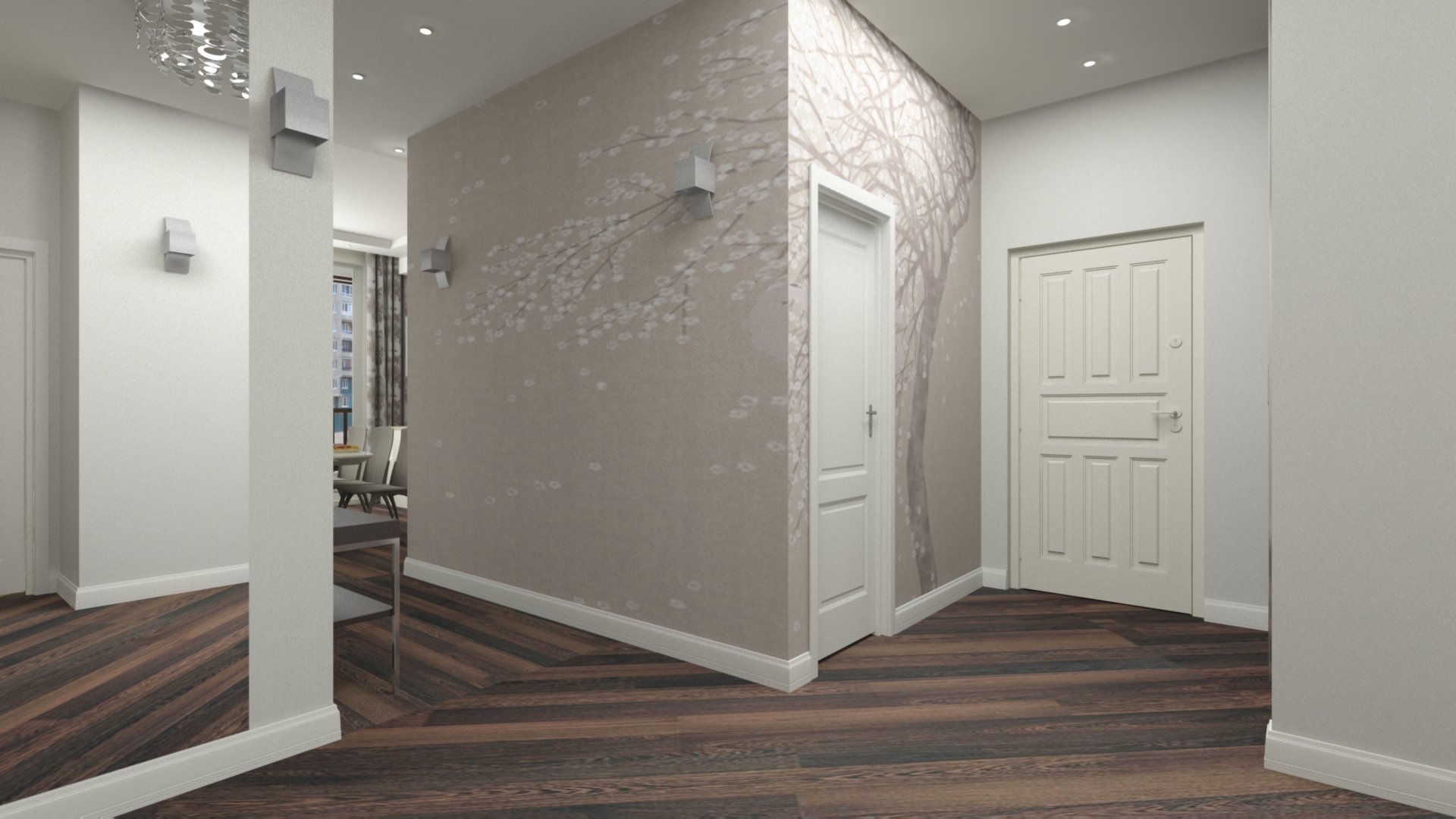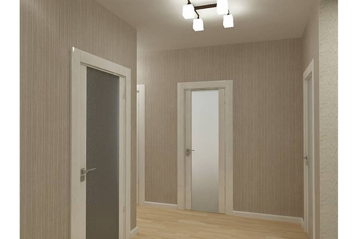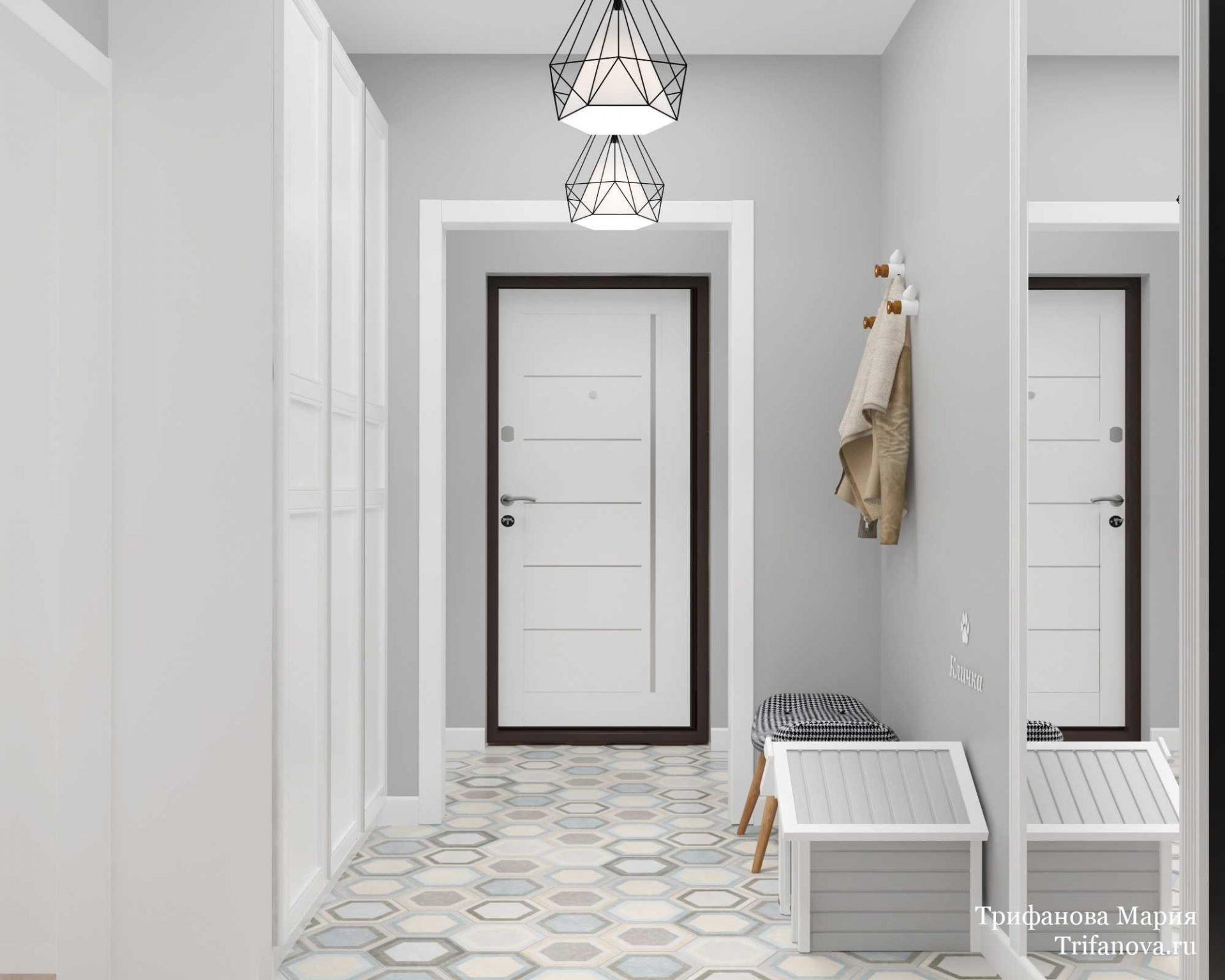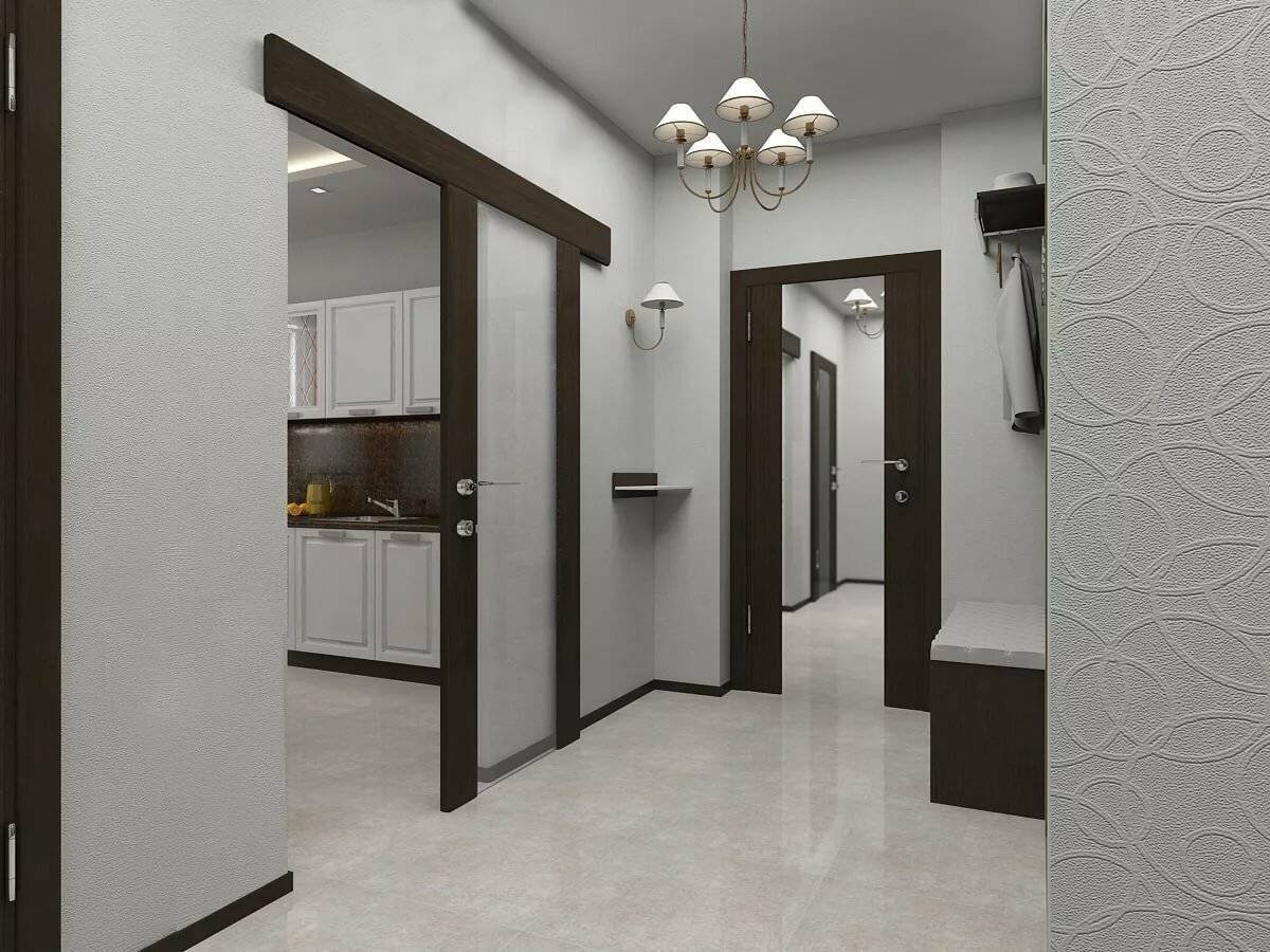 Интерьер в серых тонах с белыми плинтусами и дверями