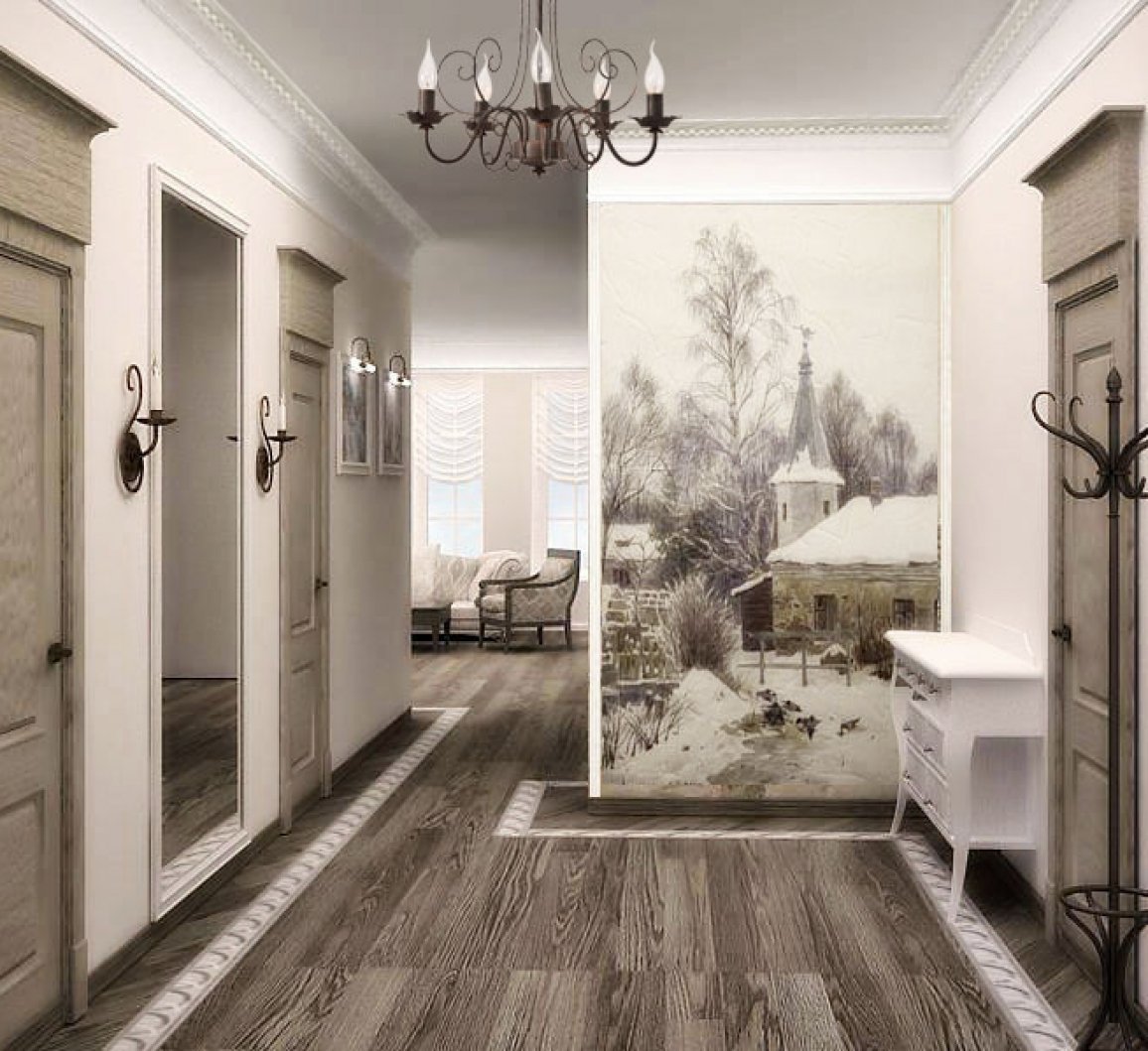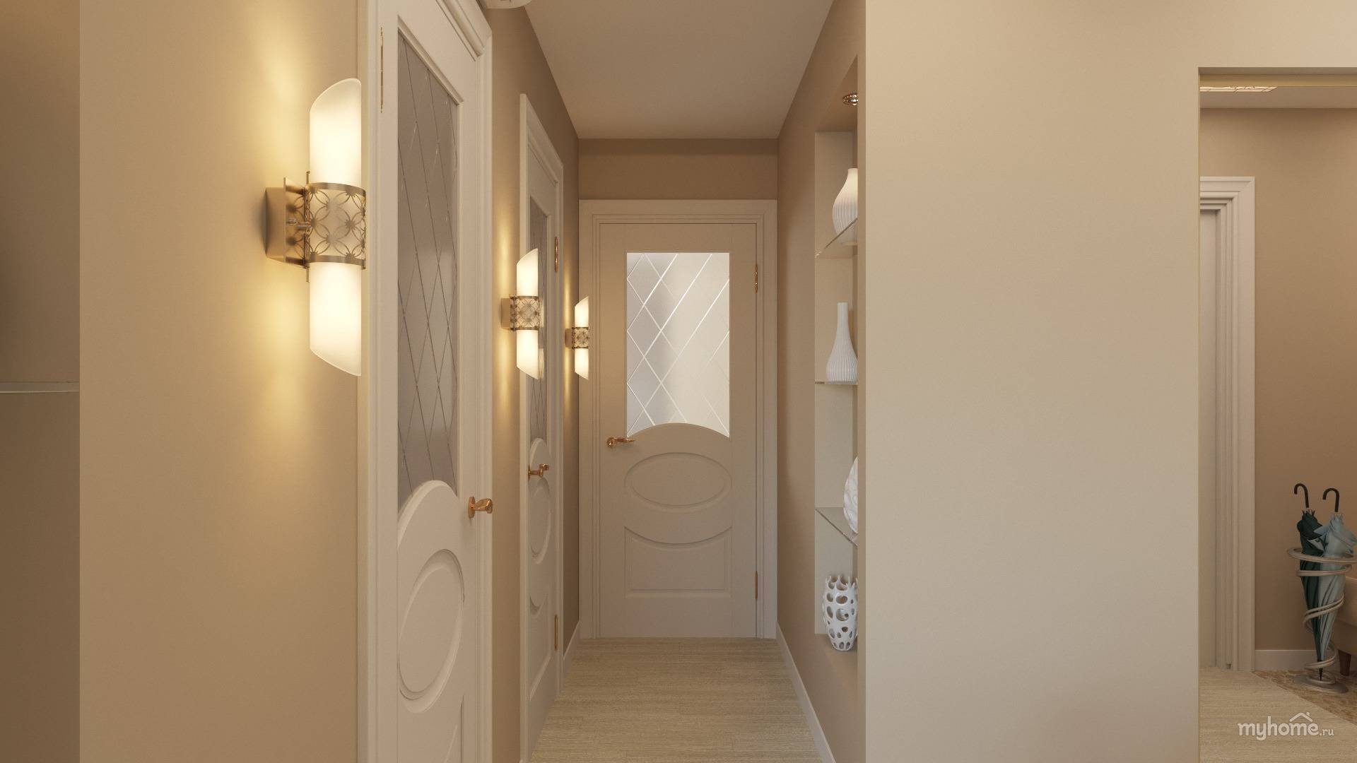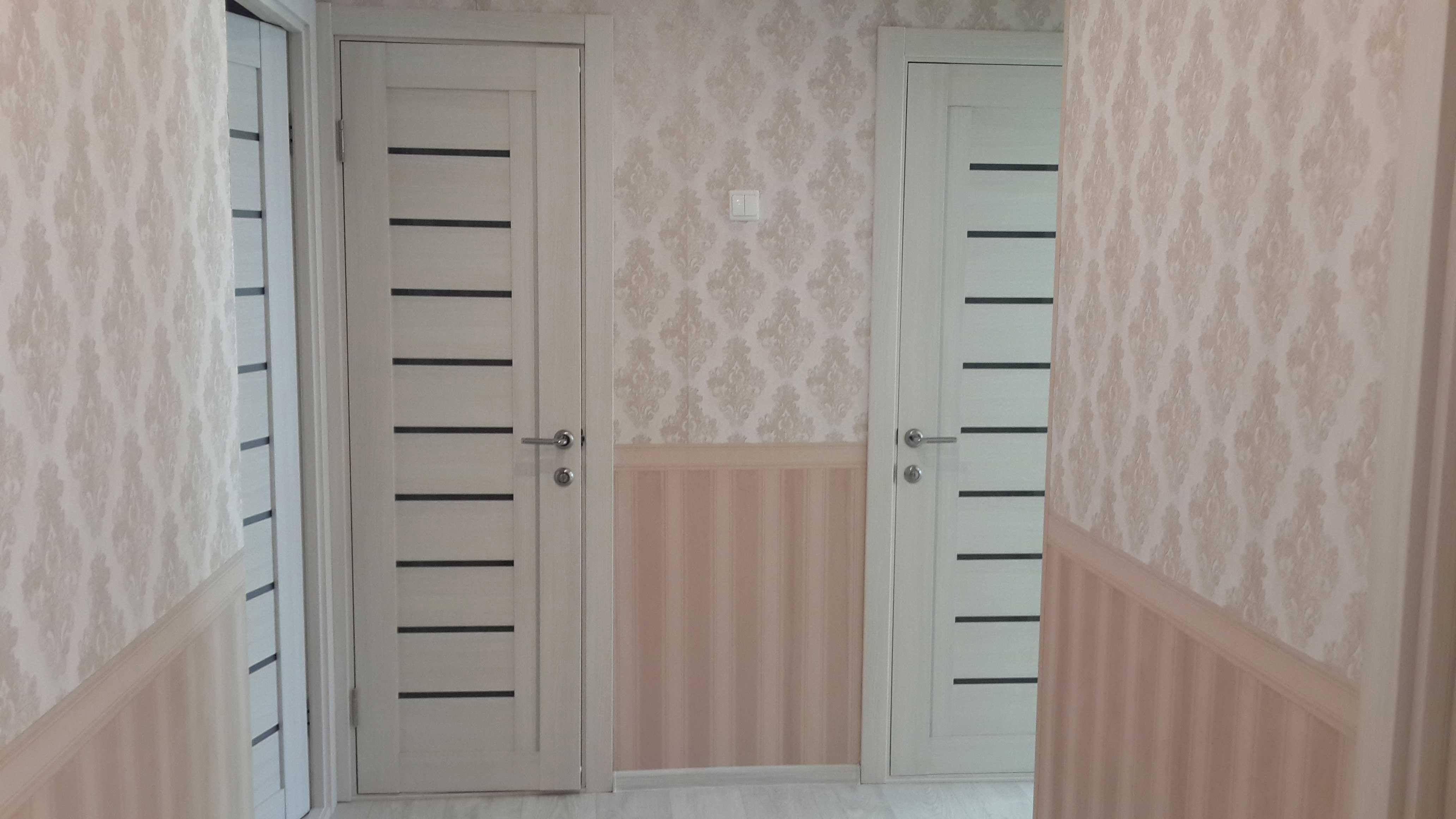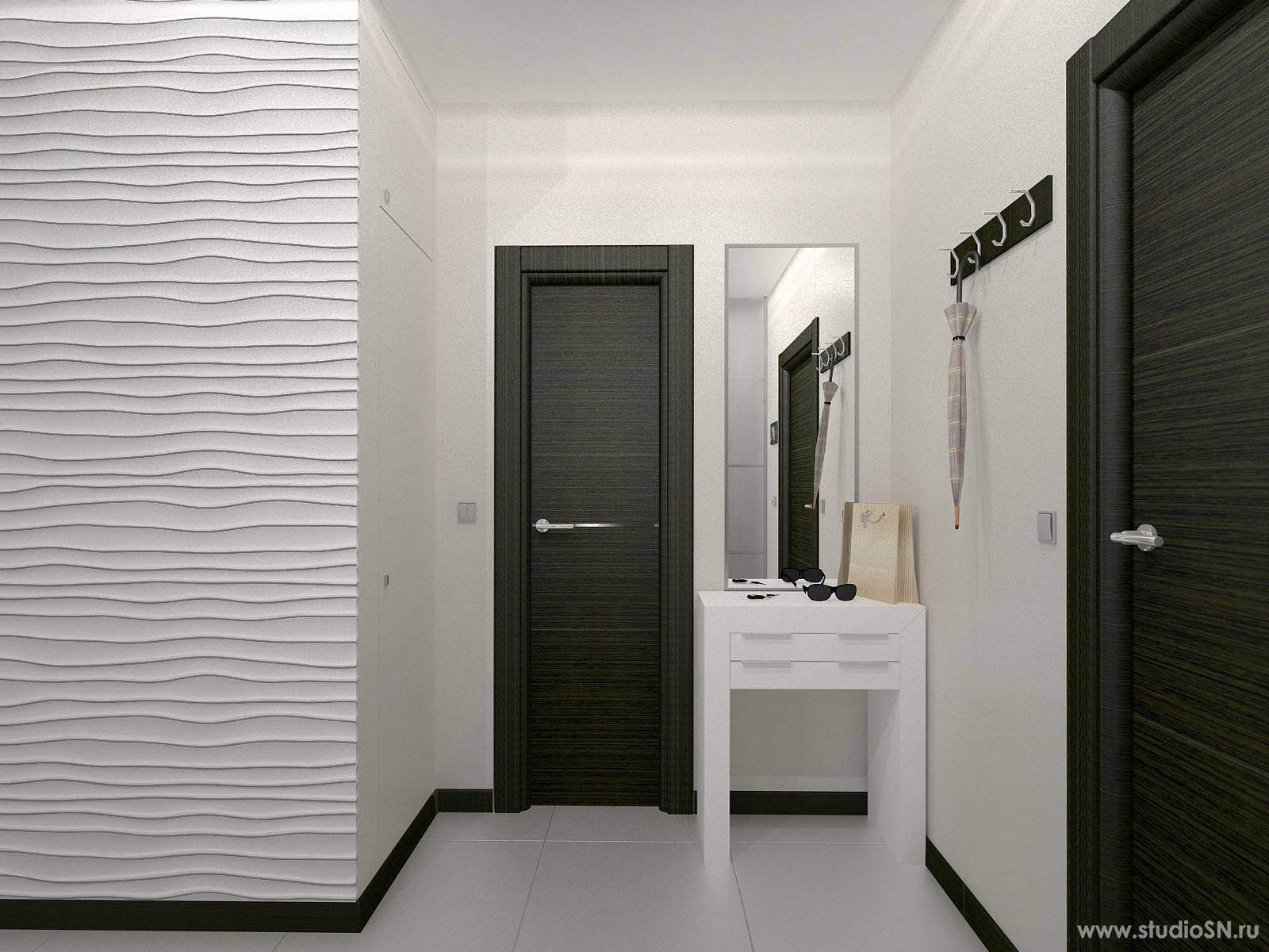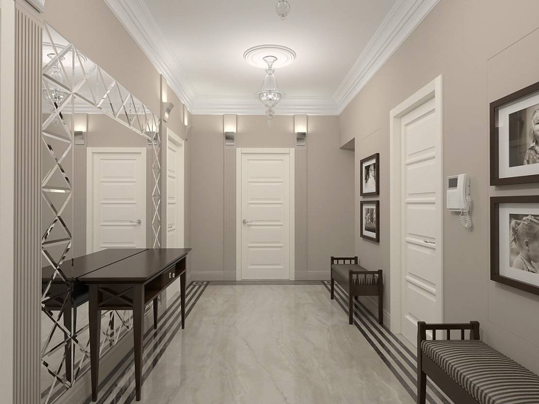 Интерьер в серых тонах с белыми плинтусами и дверями