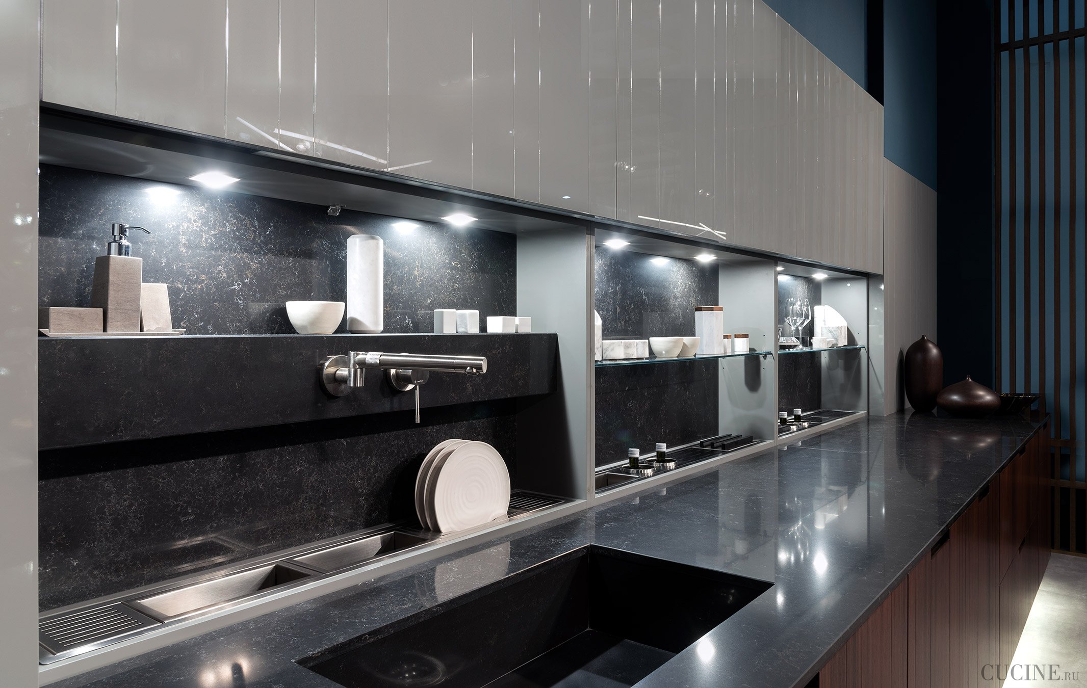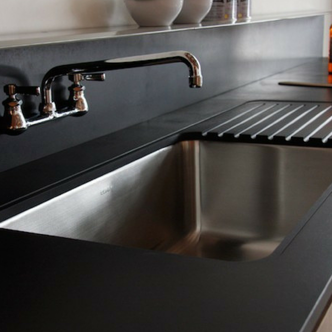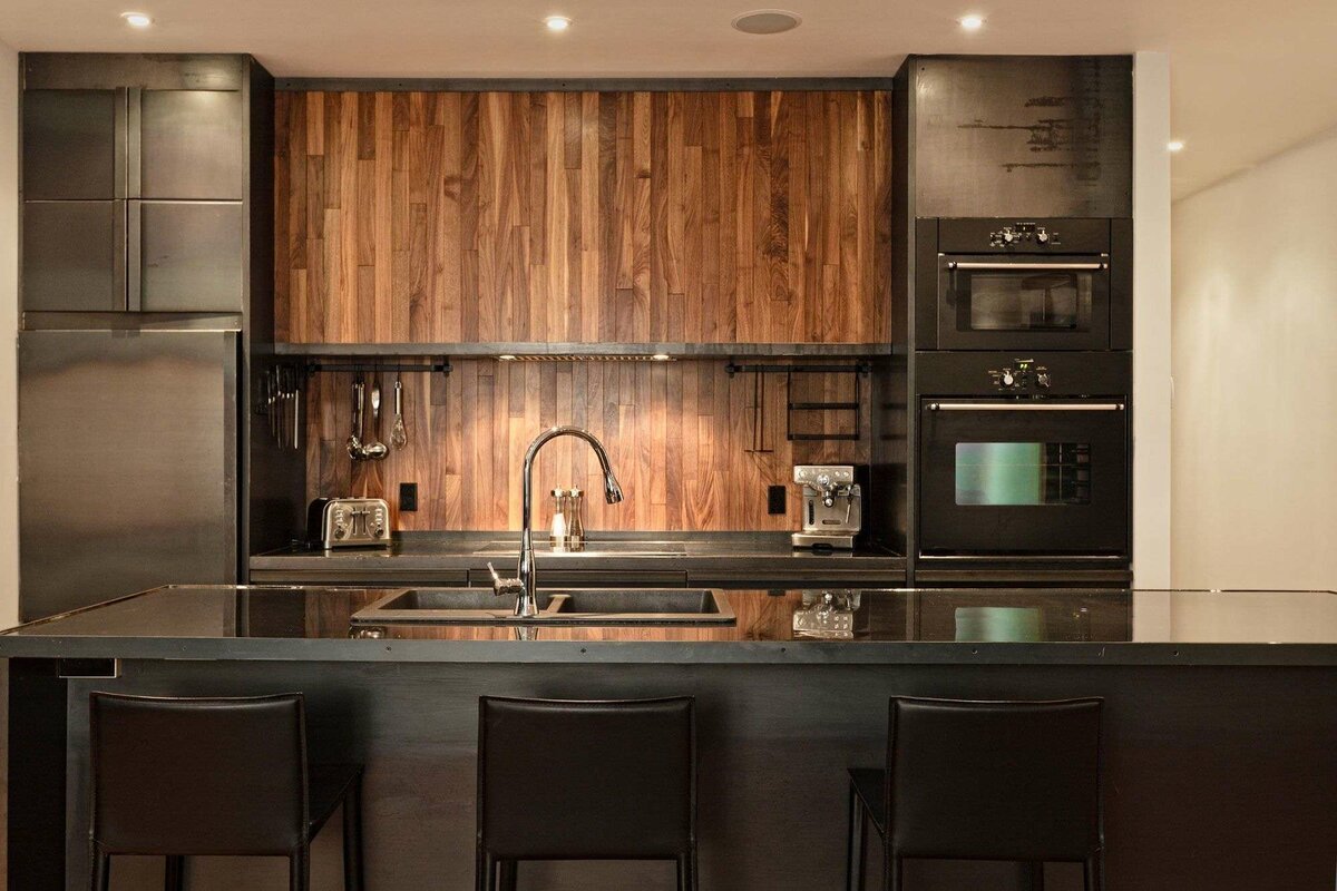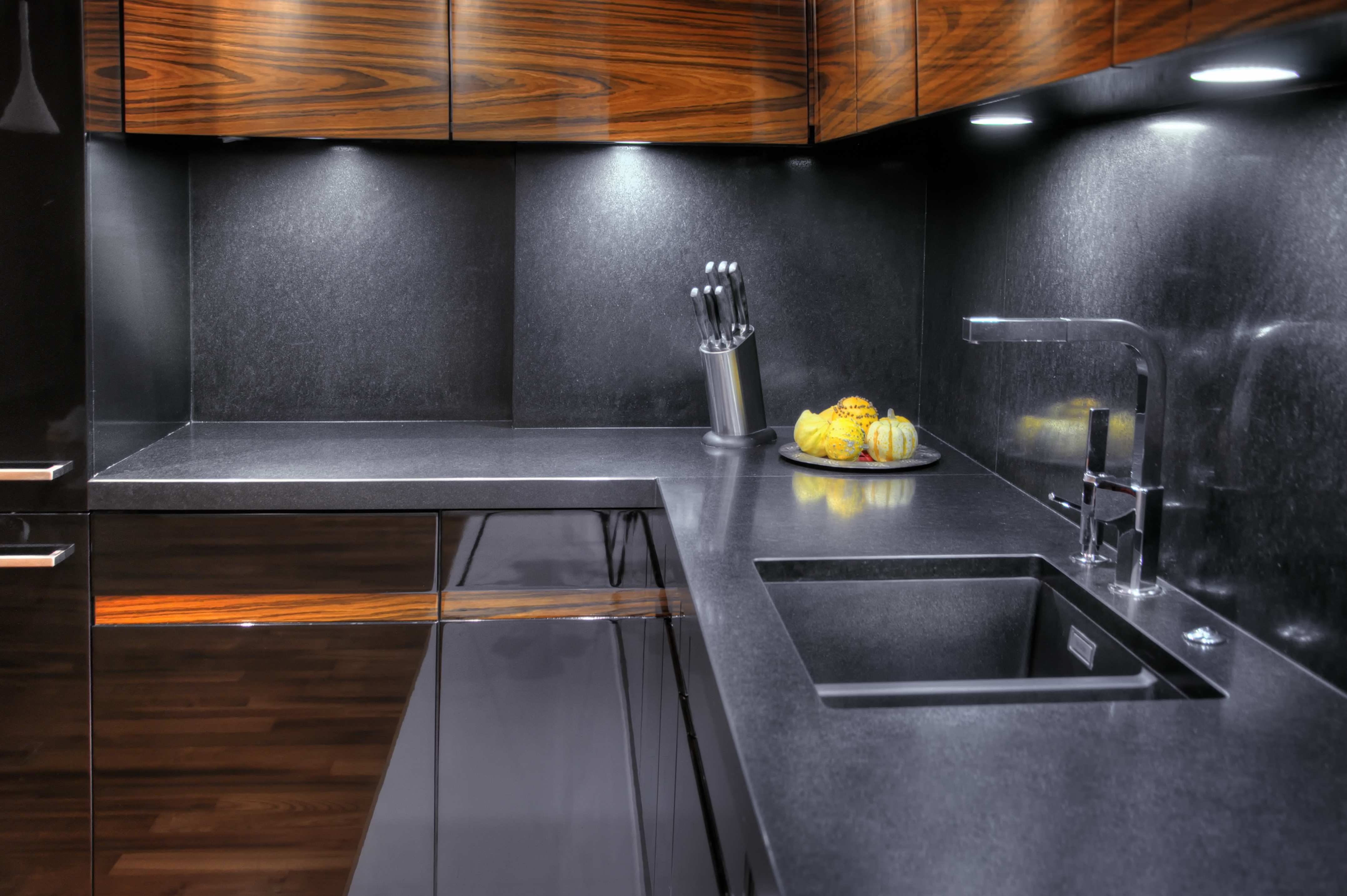 Кухня с черной столешницей и фартуком