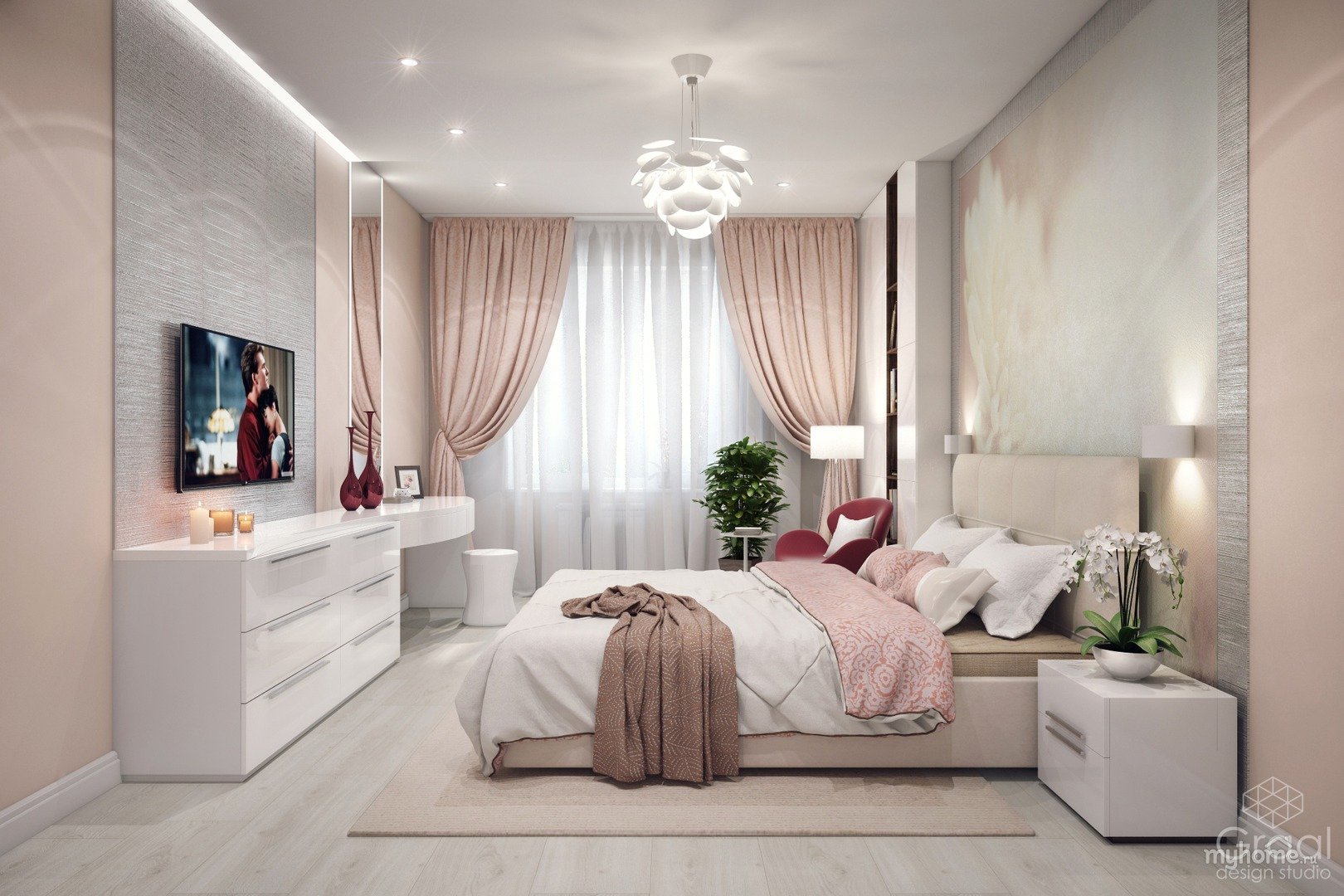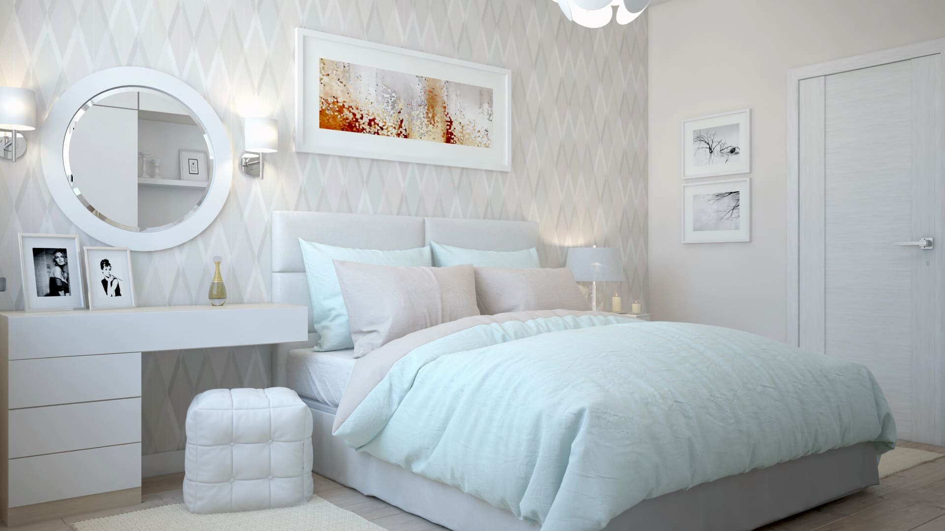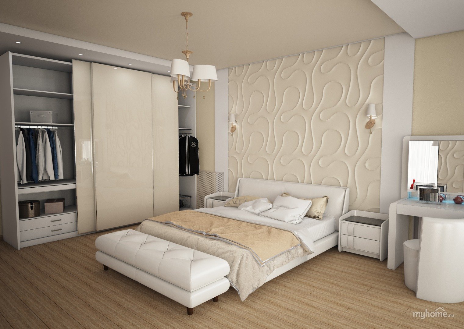 Планировка спальни со светлой мебелью