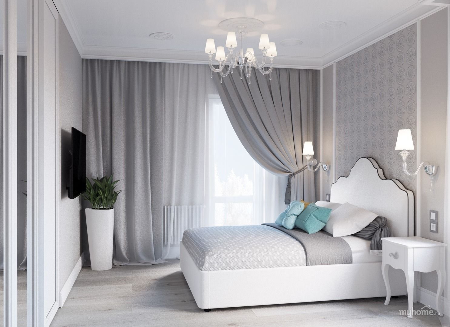 Белая кровать в интерьере спальни