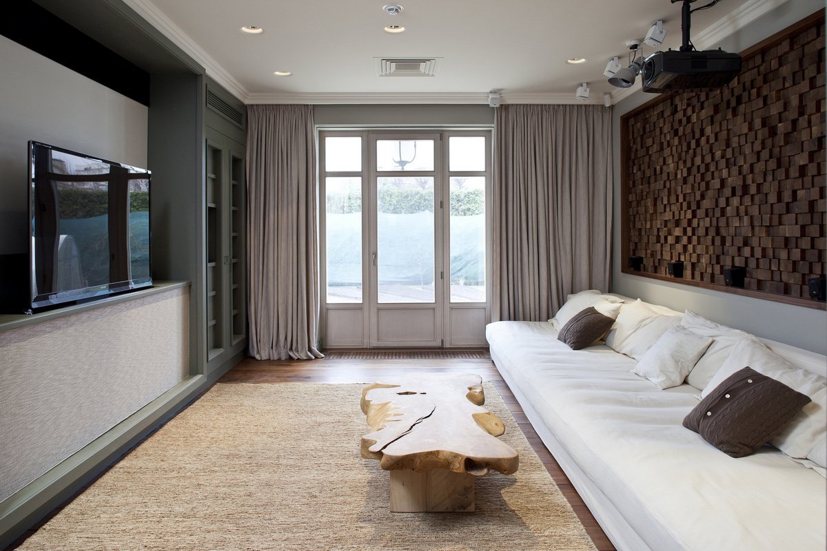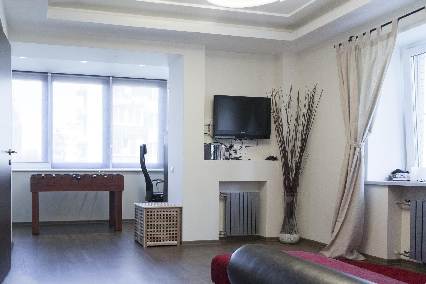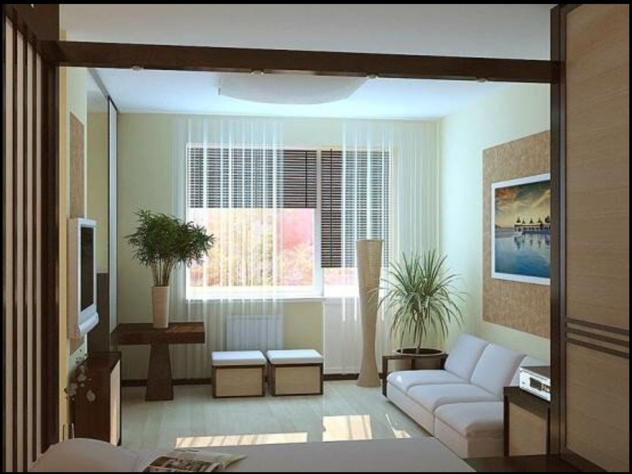 Телевизор перед окном в интерьере