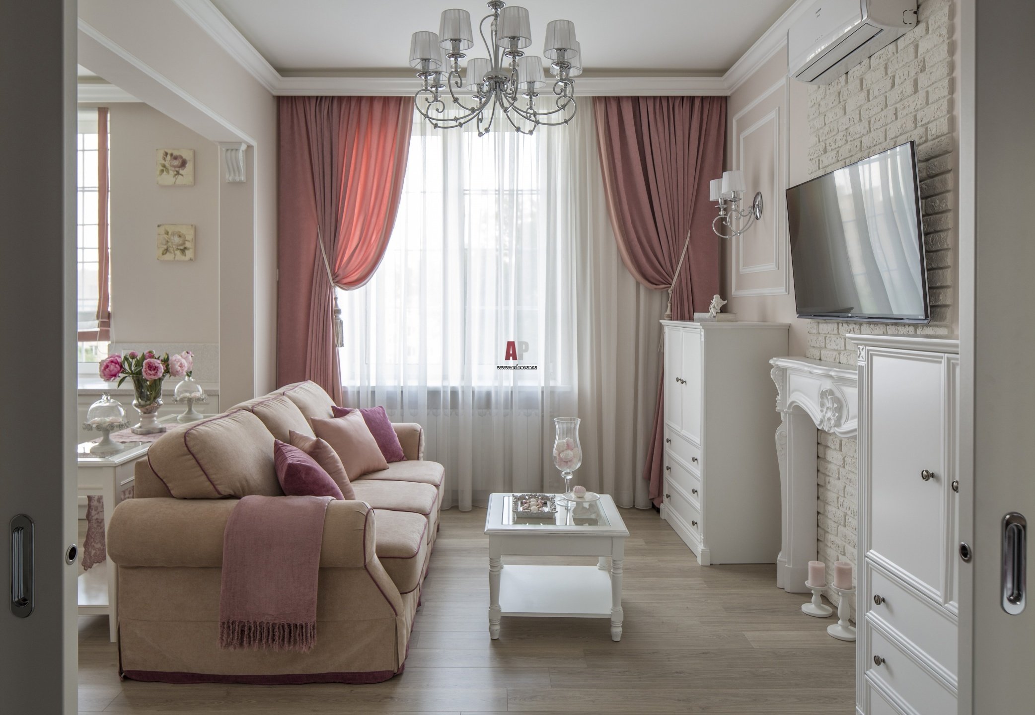 Розовые шторы в интерьере гостиной