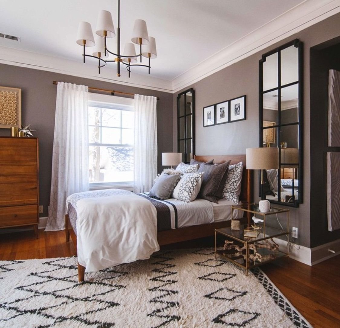 Спальня с серыми стенами и коричневой мебелью