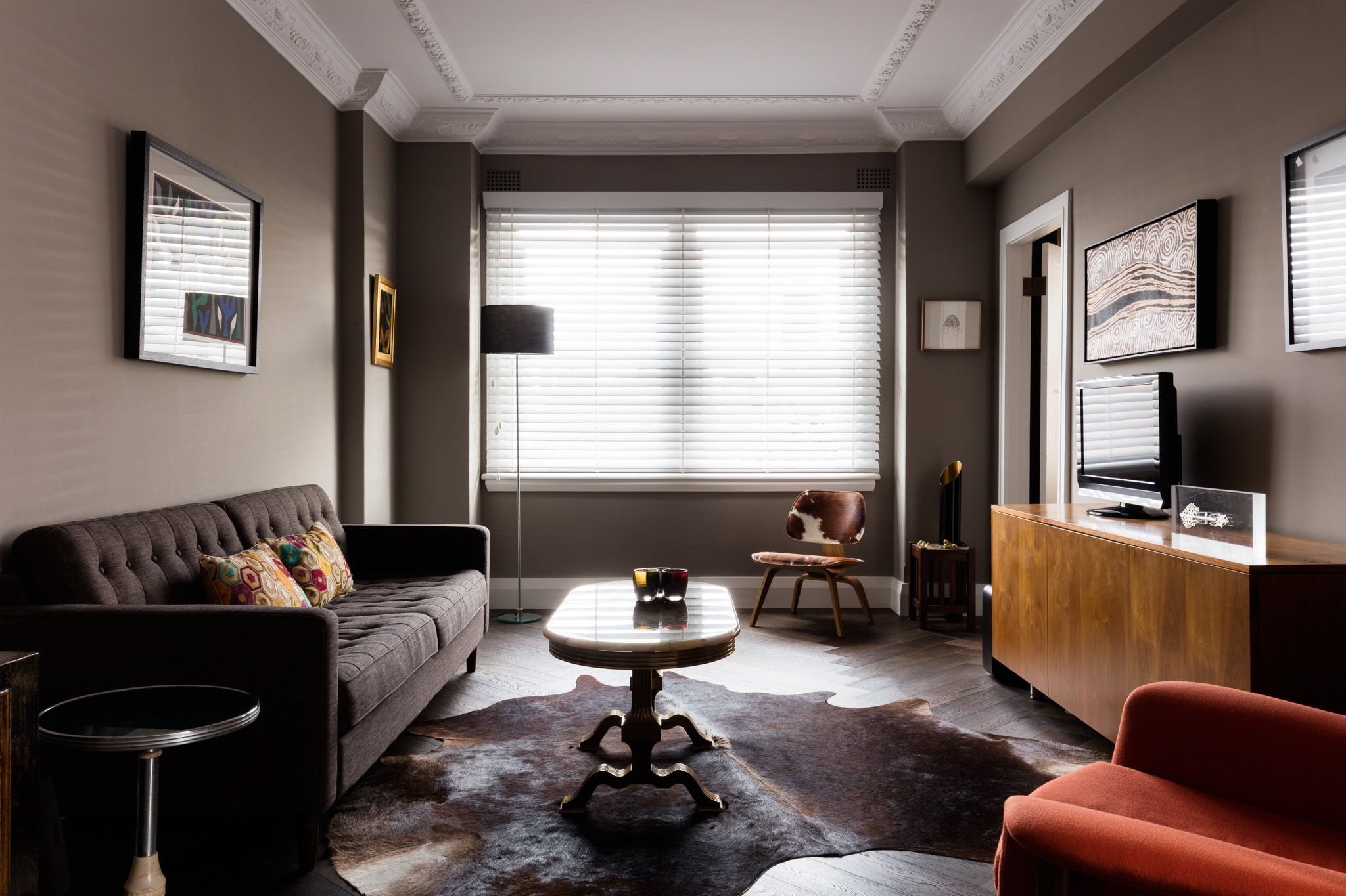 Гостиная в коричневых тонах с яркими акцентами