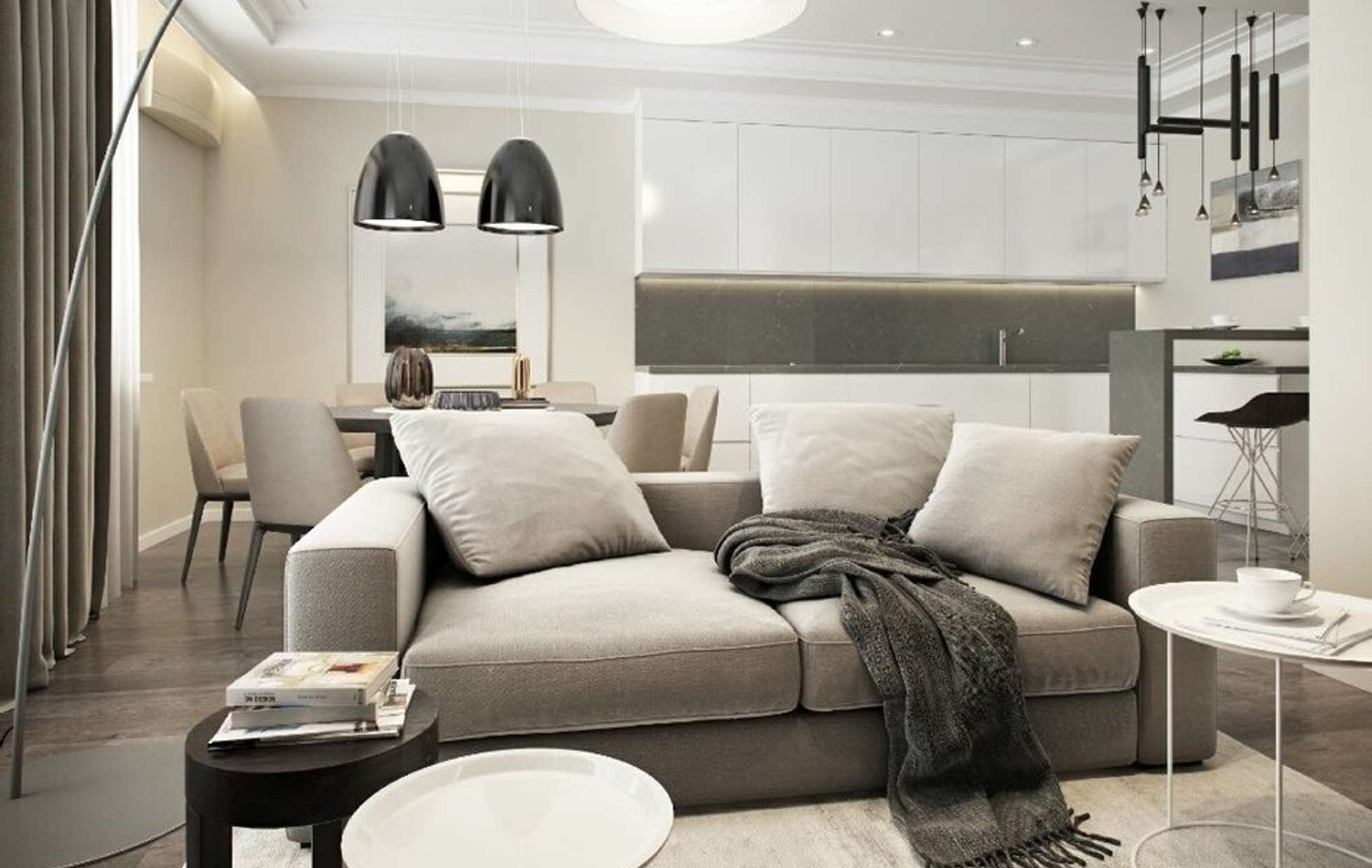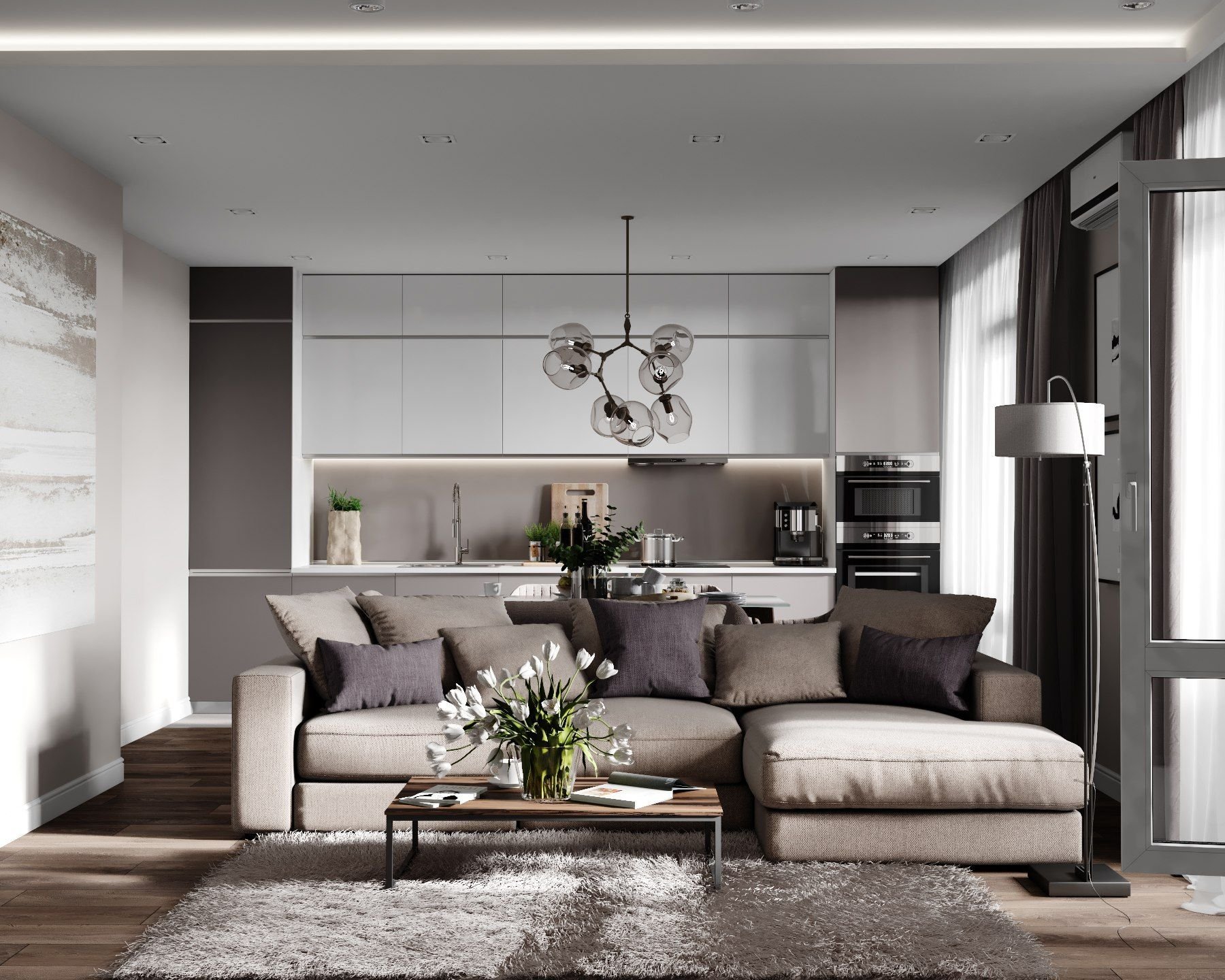 Серо бежевая кухня гостиная