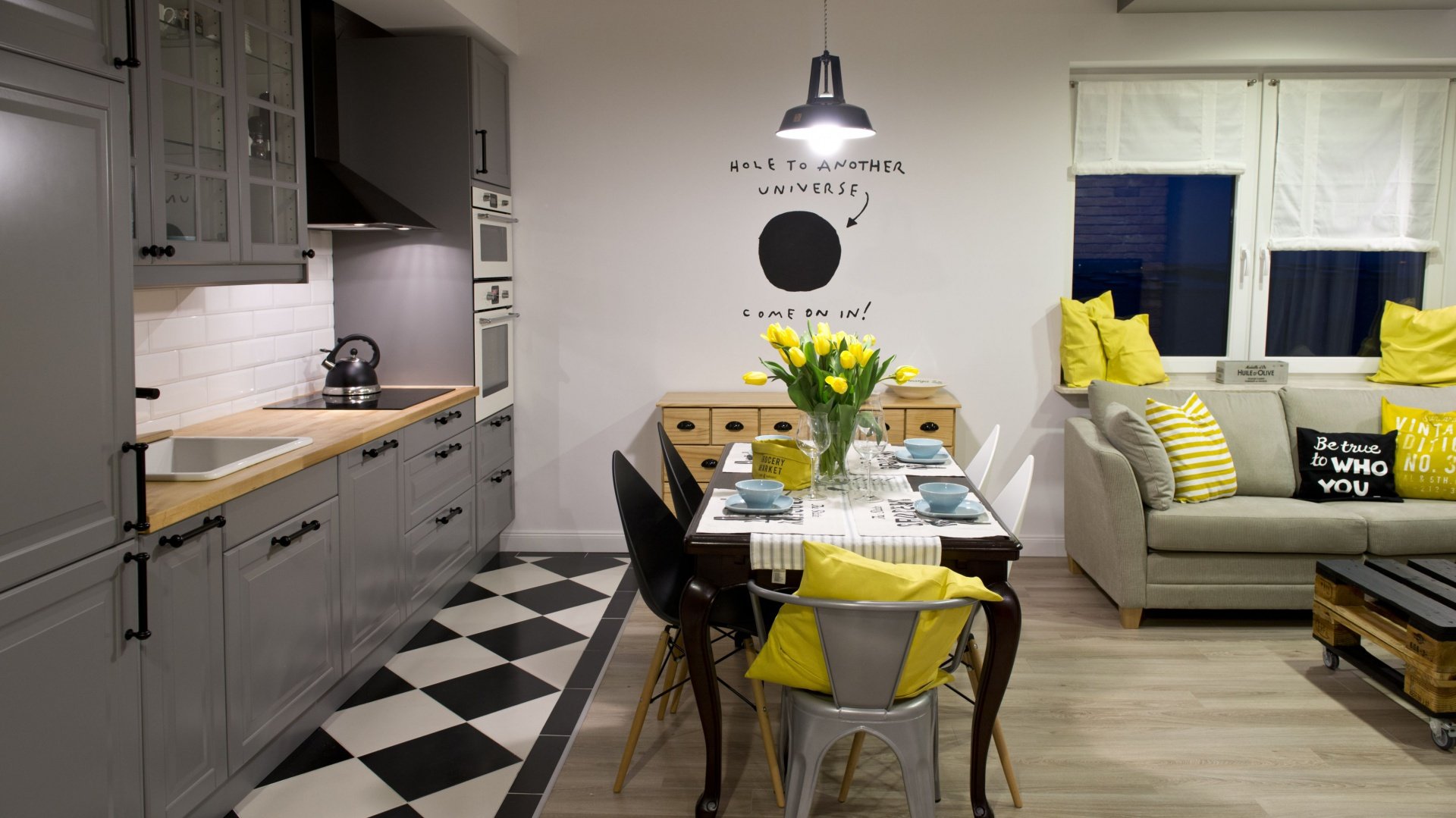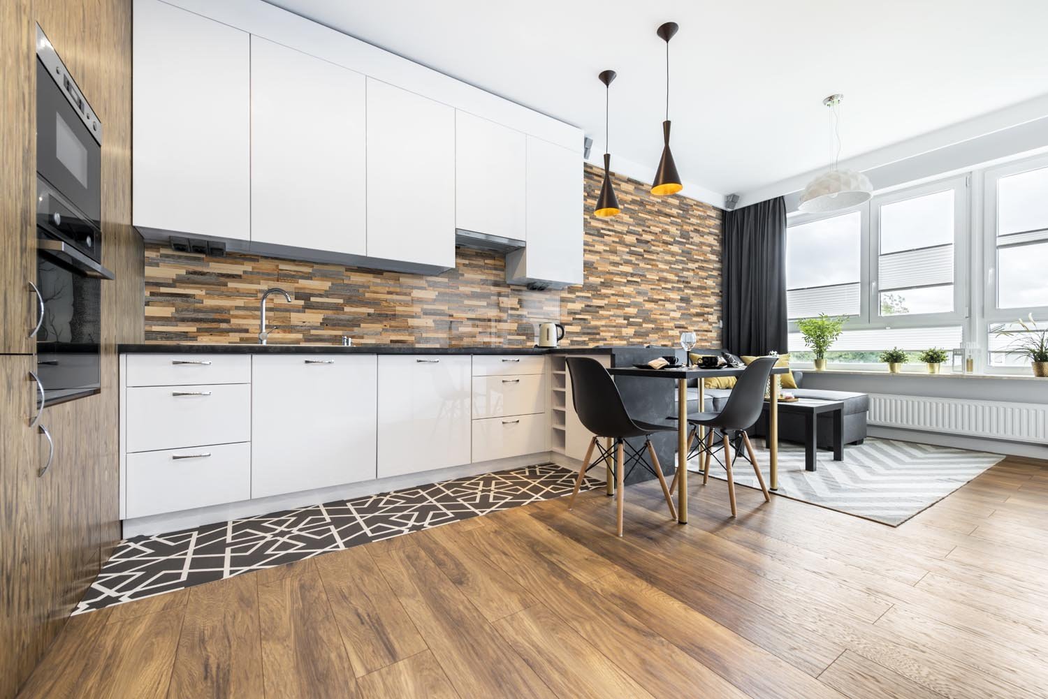 Плитка и ламинат в кухне гостиной