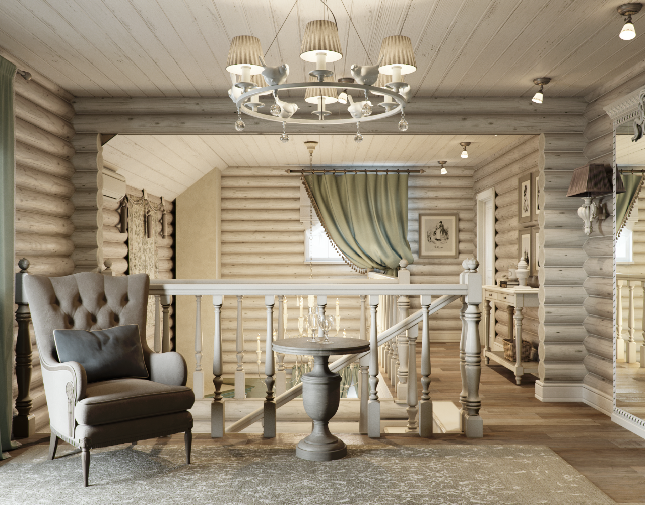 Интерьер дома из оцилиндрованного бревна со вторым светом