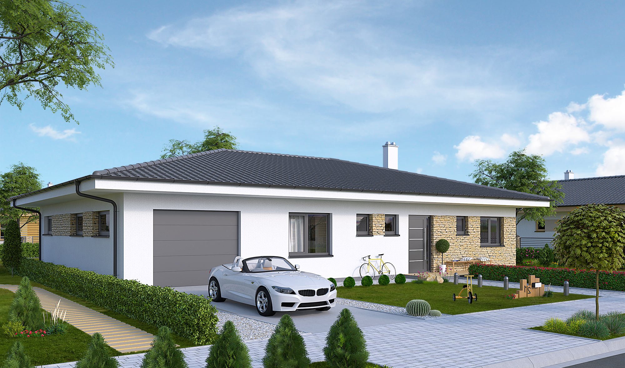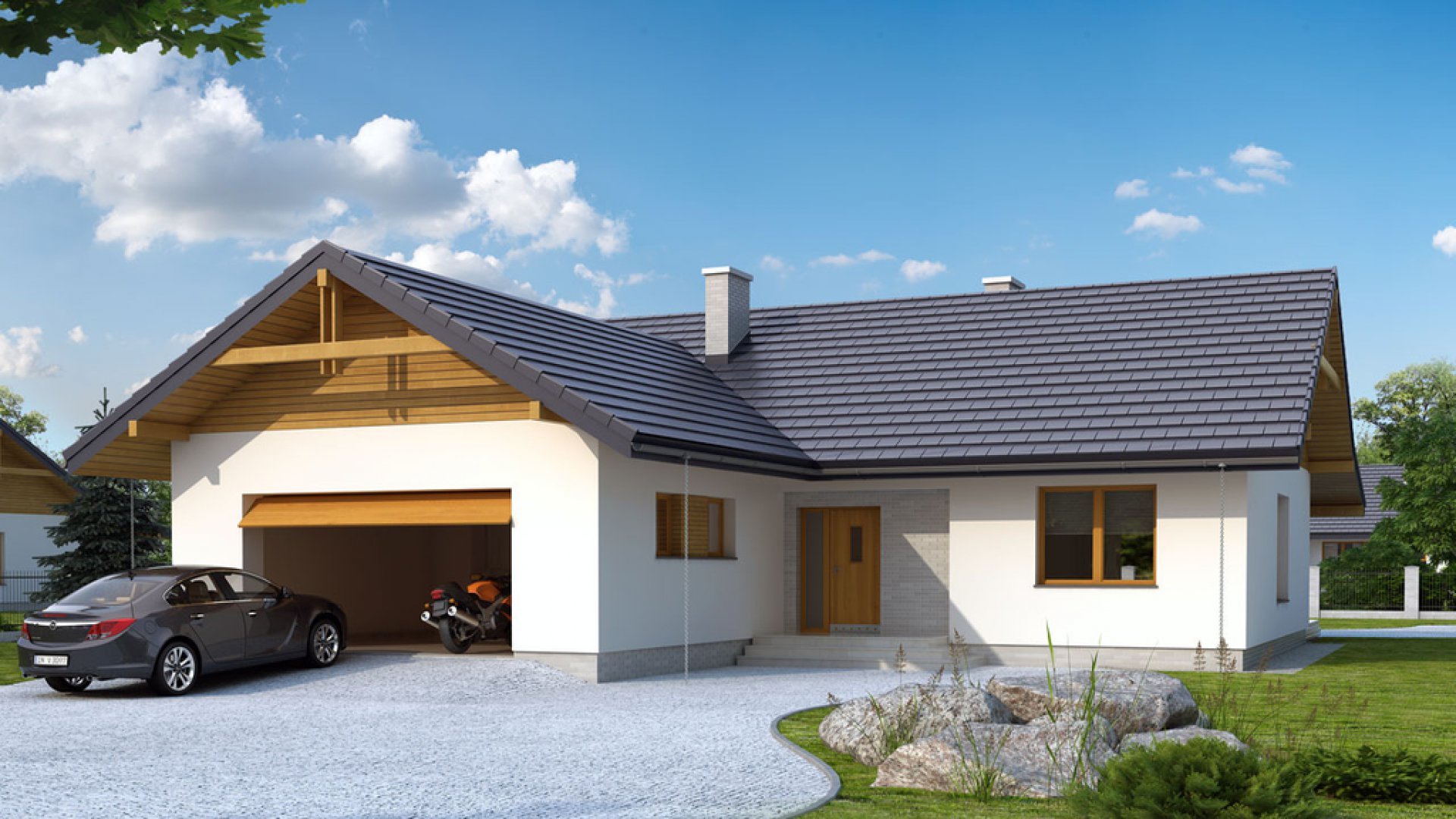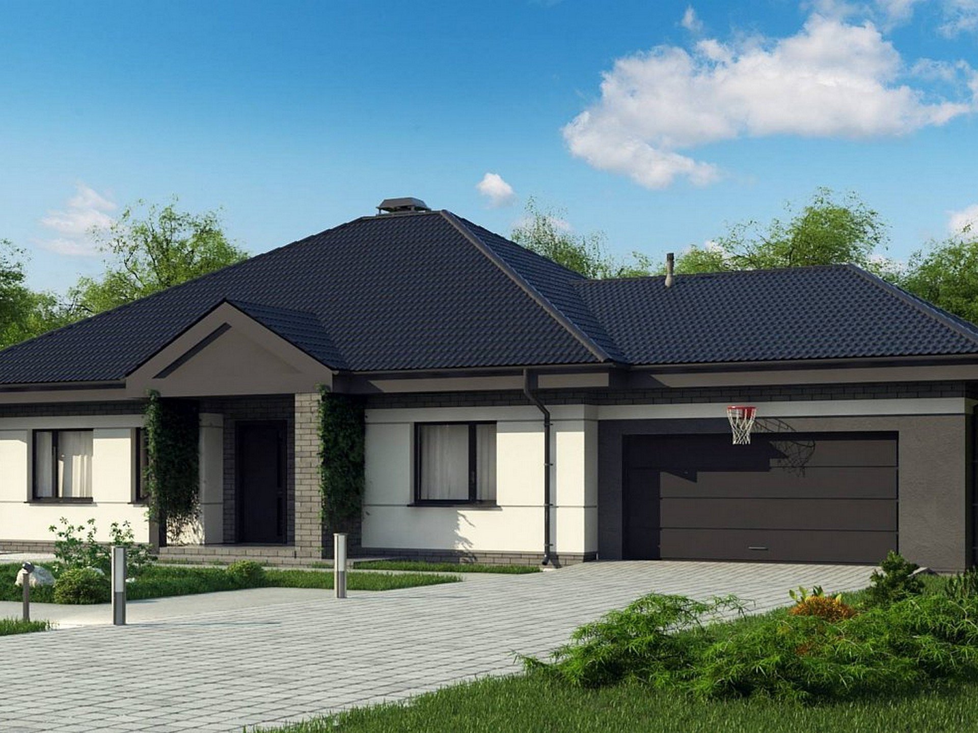 Одноэтажный дом с гаражом и навесом