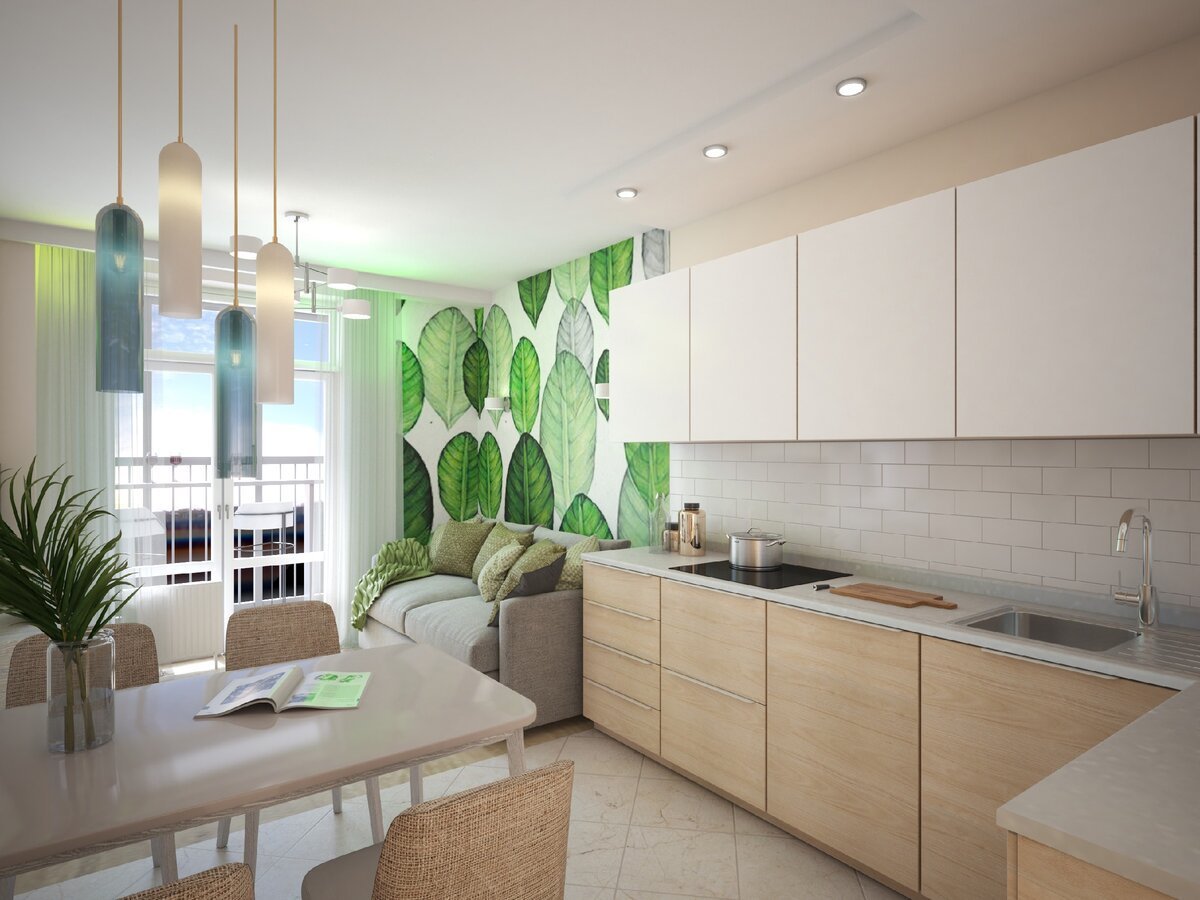 Кухня гостиная с акцентной стеной