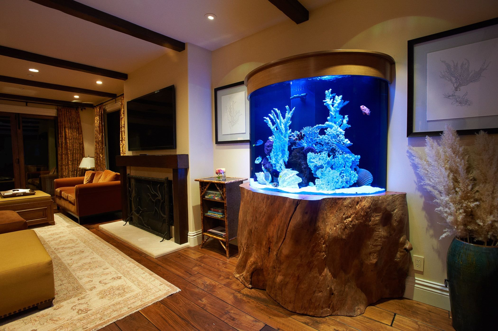 Гостиная с аквариумом и камином