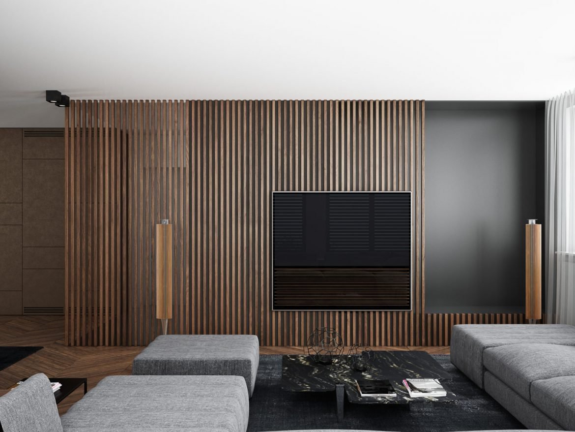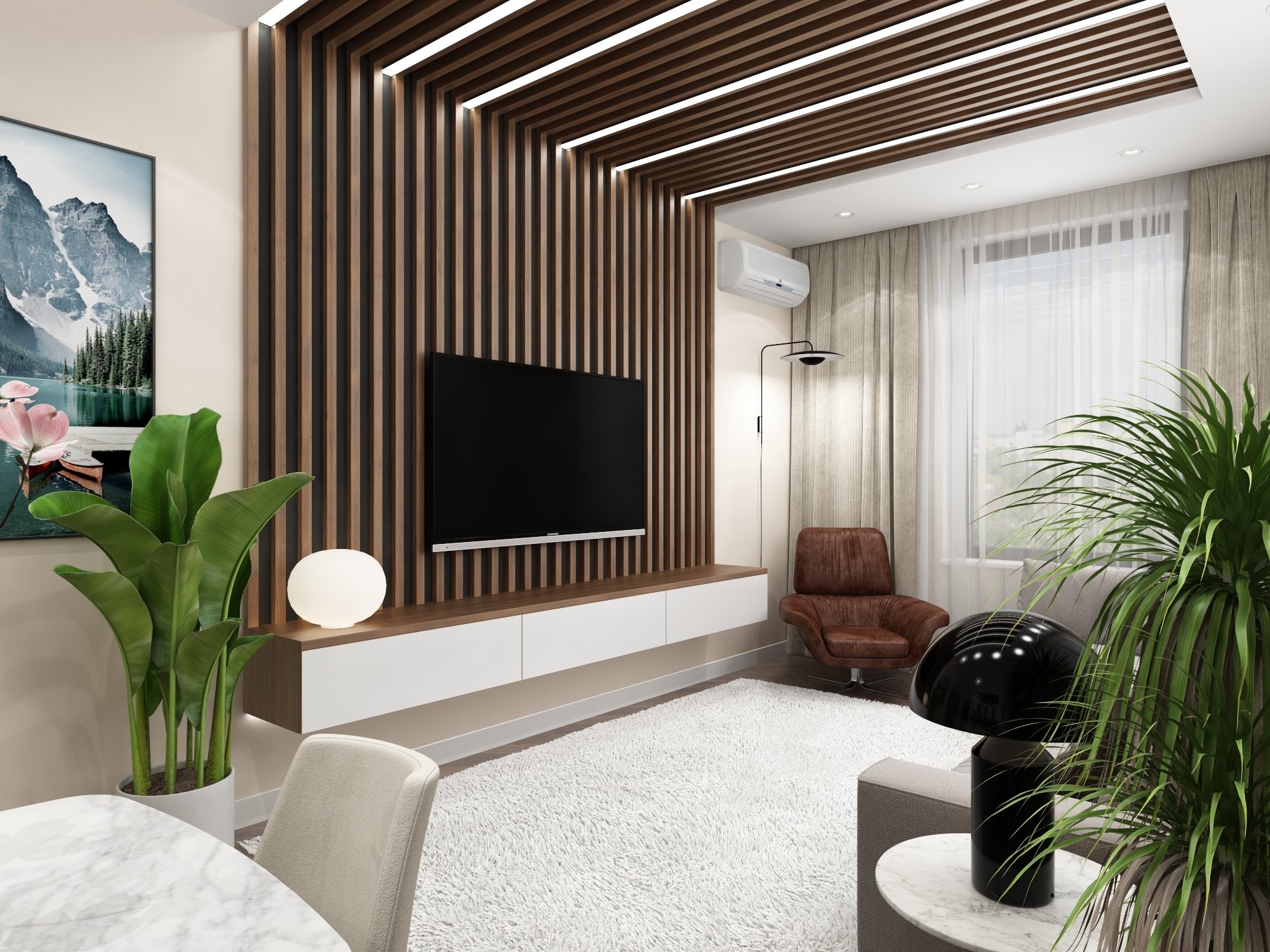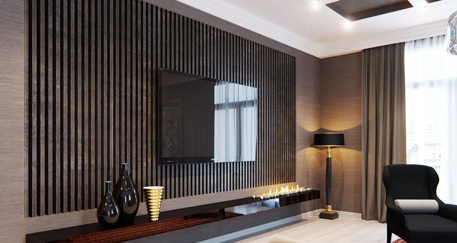 Гостиная в современном стиле с рейками