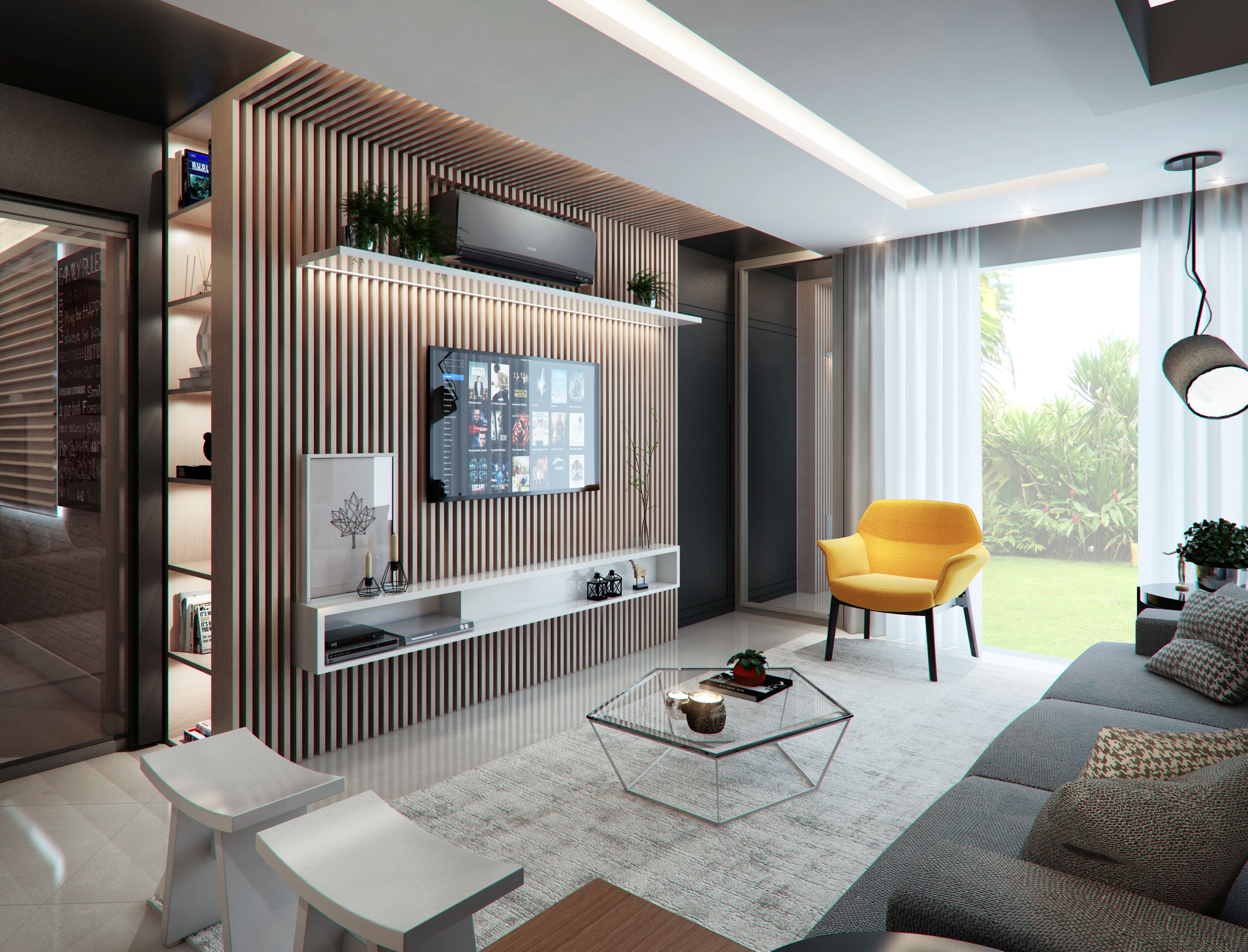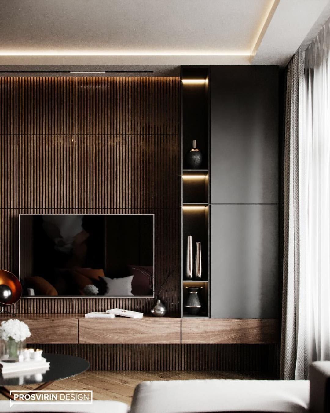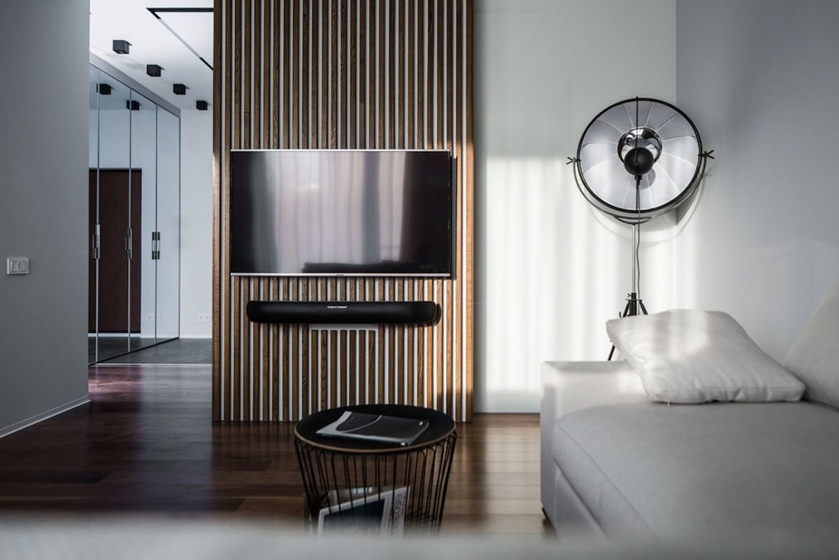 Гостиная в современном стиле с рейками