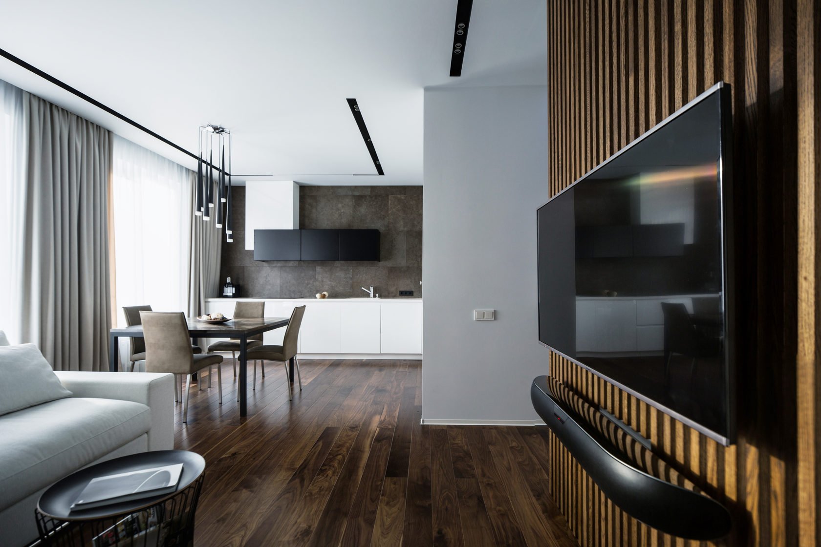 Гостиная с деревянными рейками
