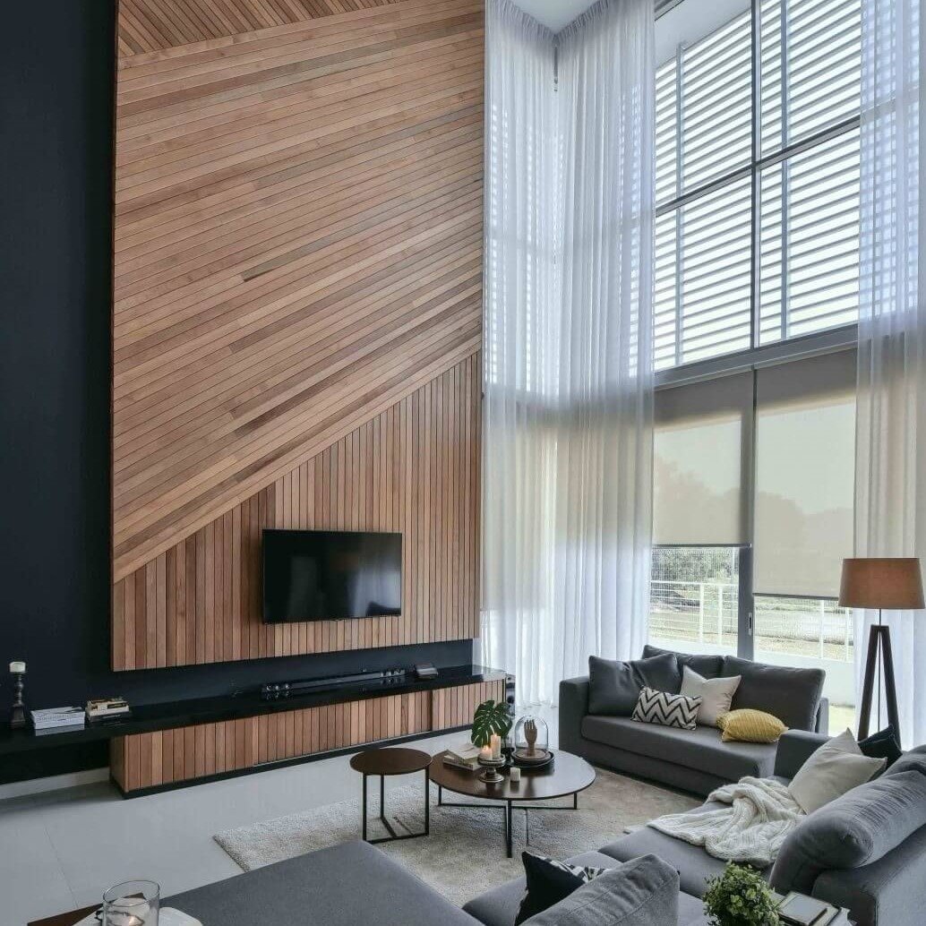 Деревянные рейки на стене в гостиной