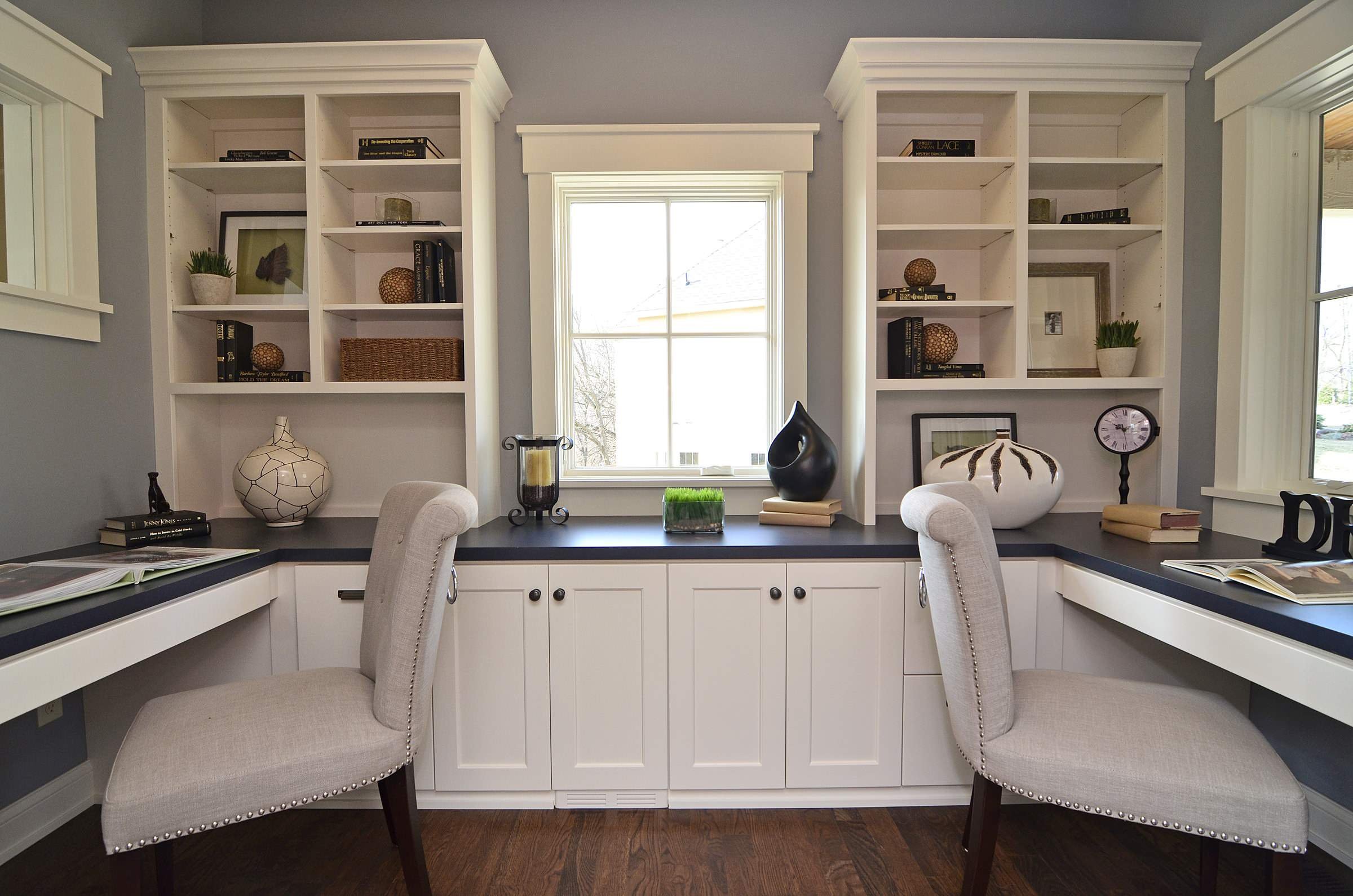 Стол у окна со стеллажами