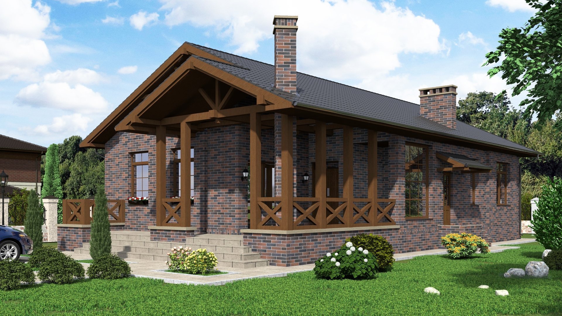 Одноэтажный кирпичный дом с террасой