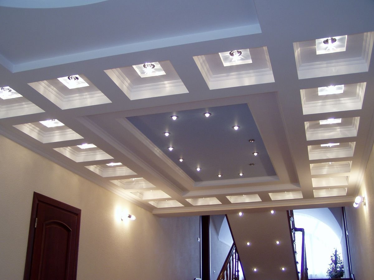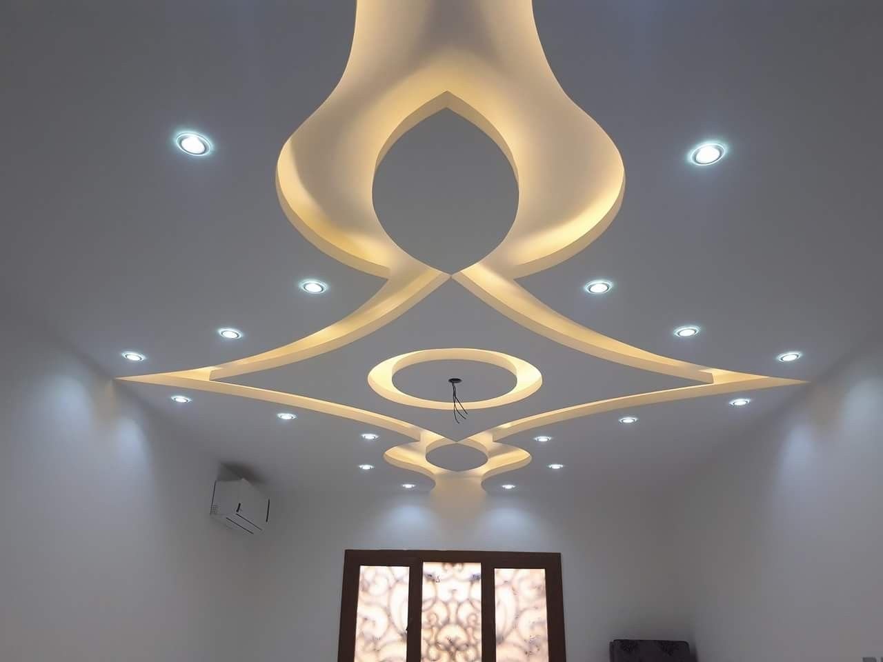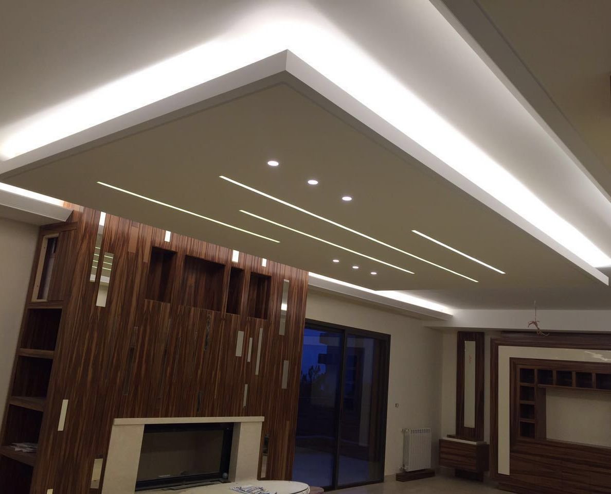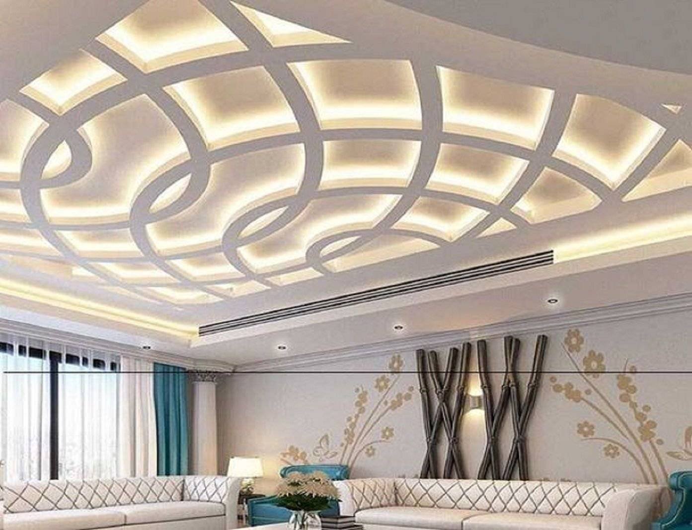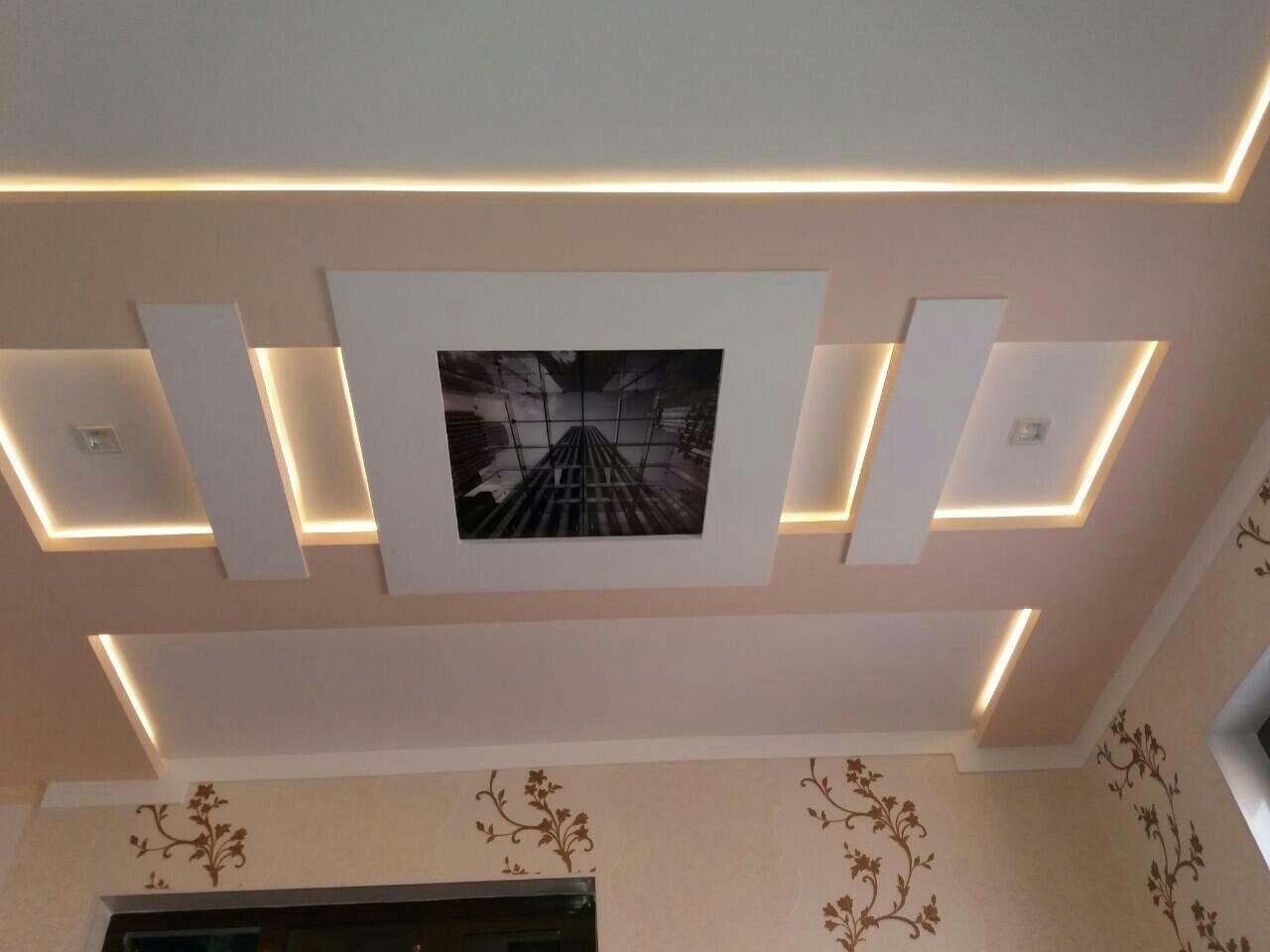 Потолок из гипсокартона для гостиной фигурный с подсветкой