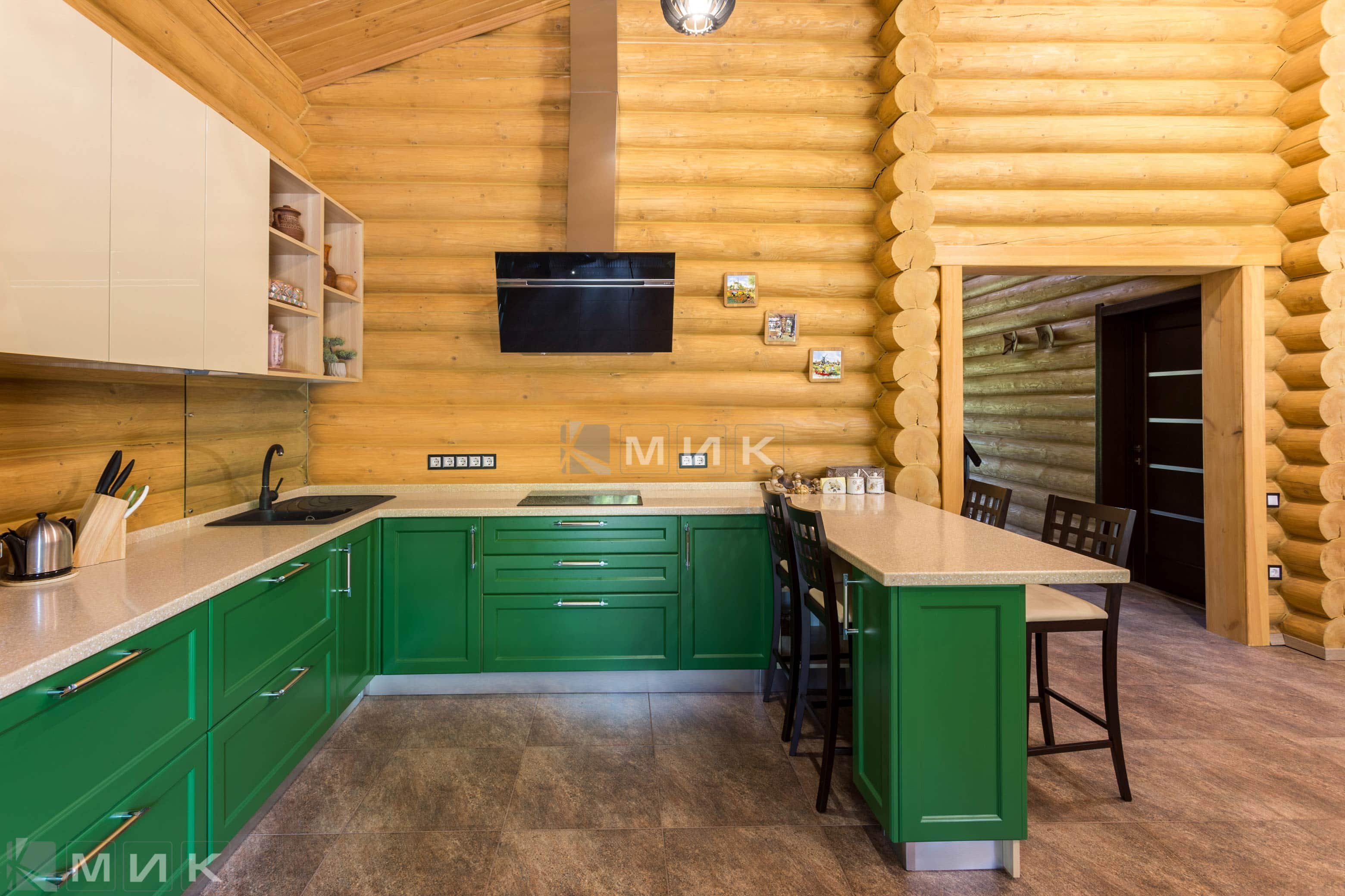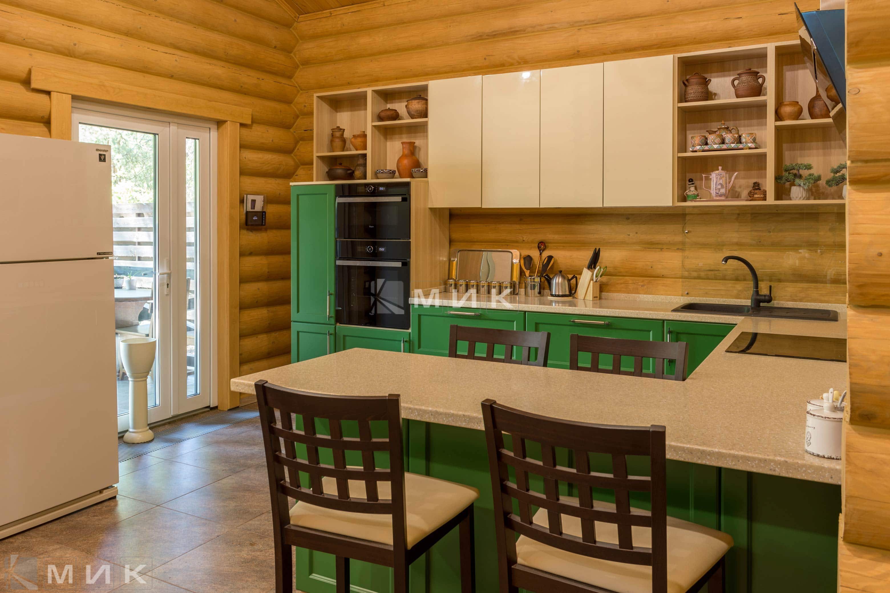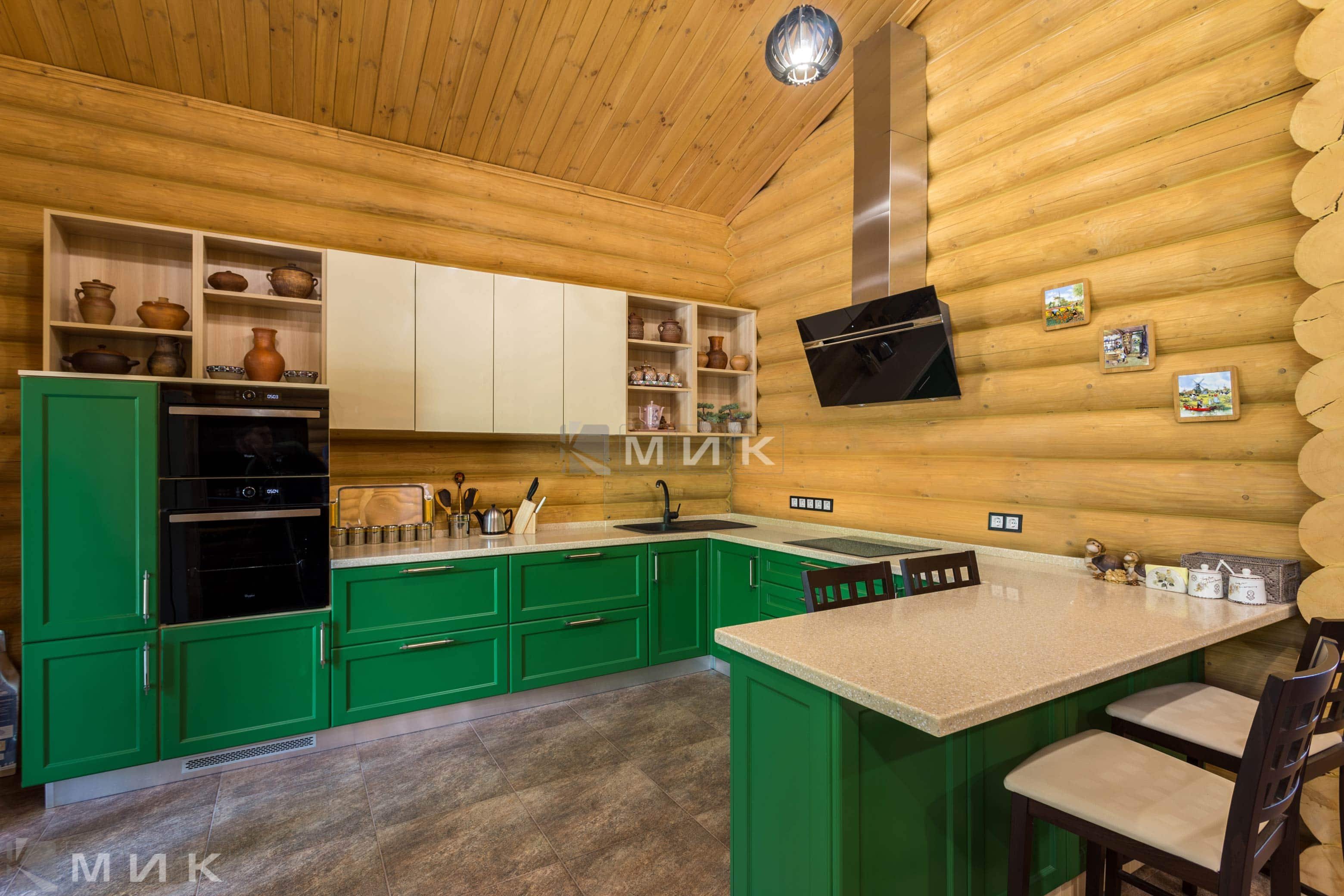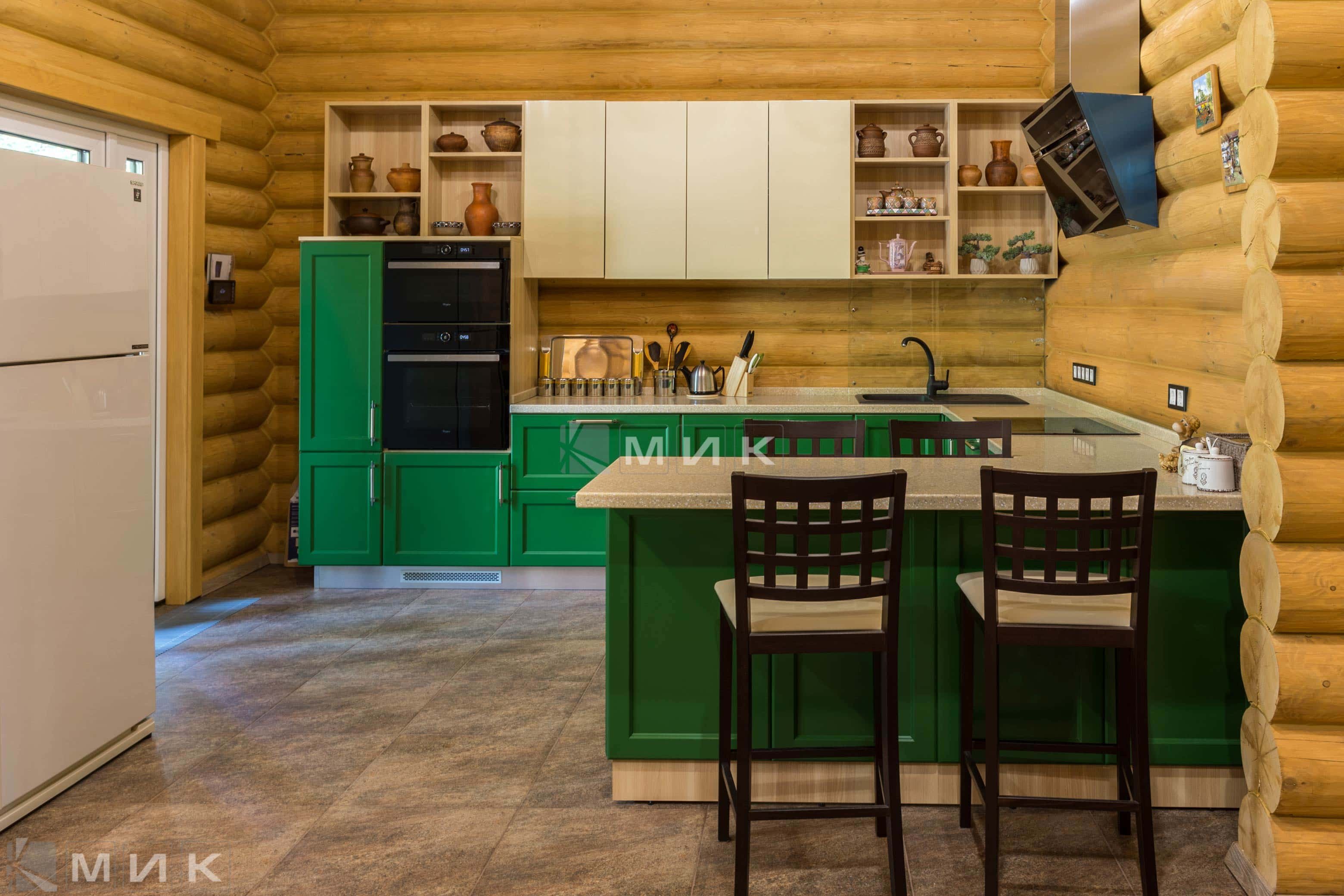 Зеленая кухня в доме из бруса