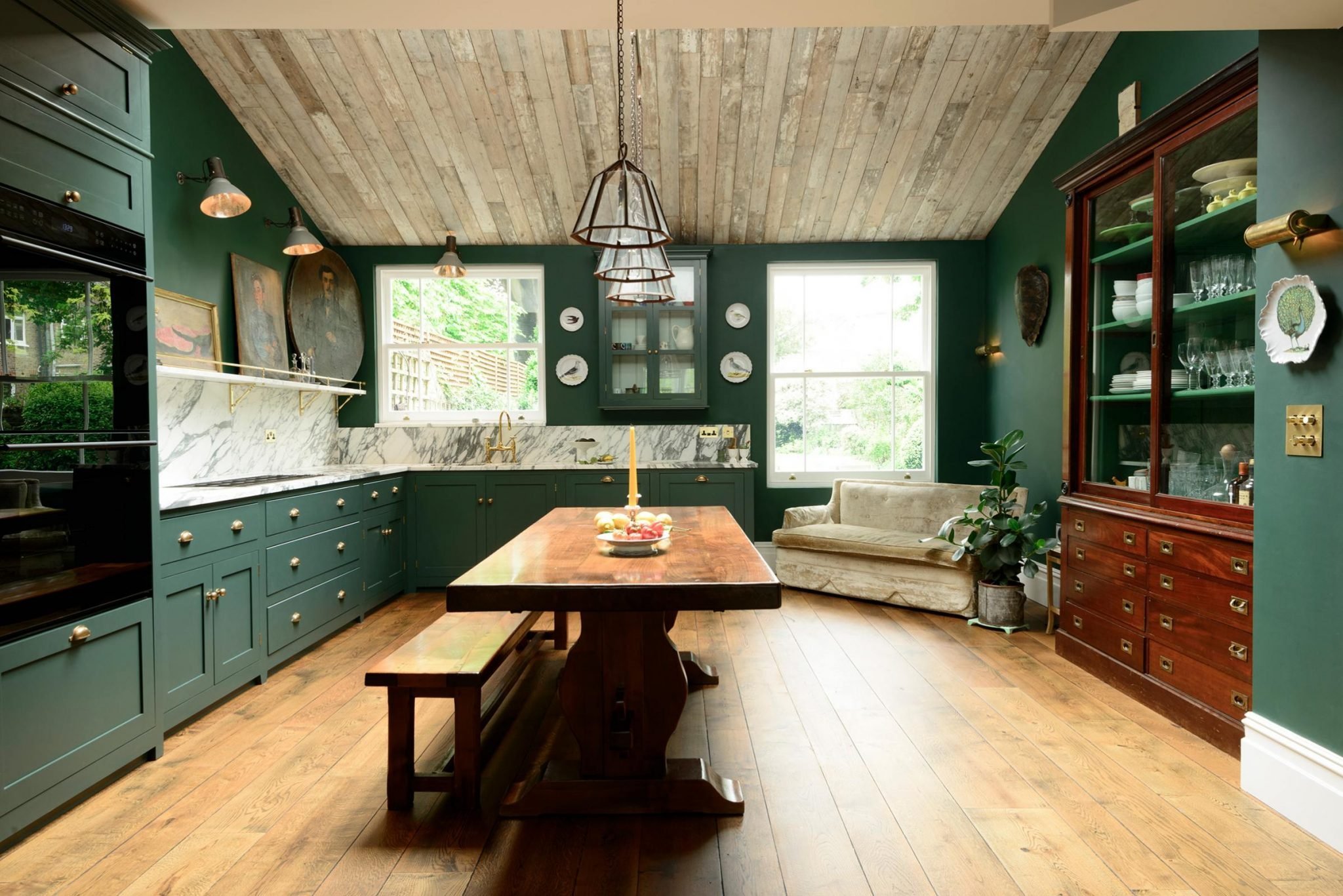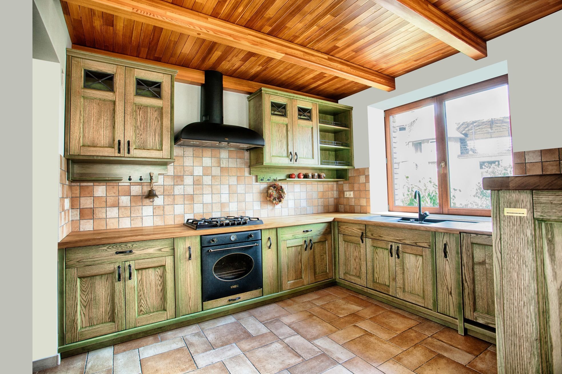 Деревянная кухня с зелеными стенами