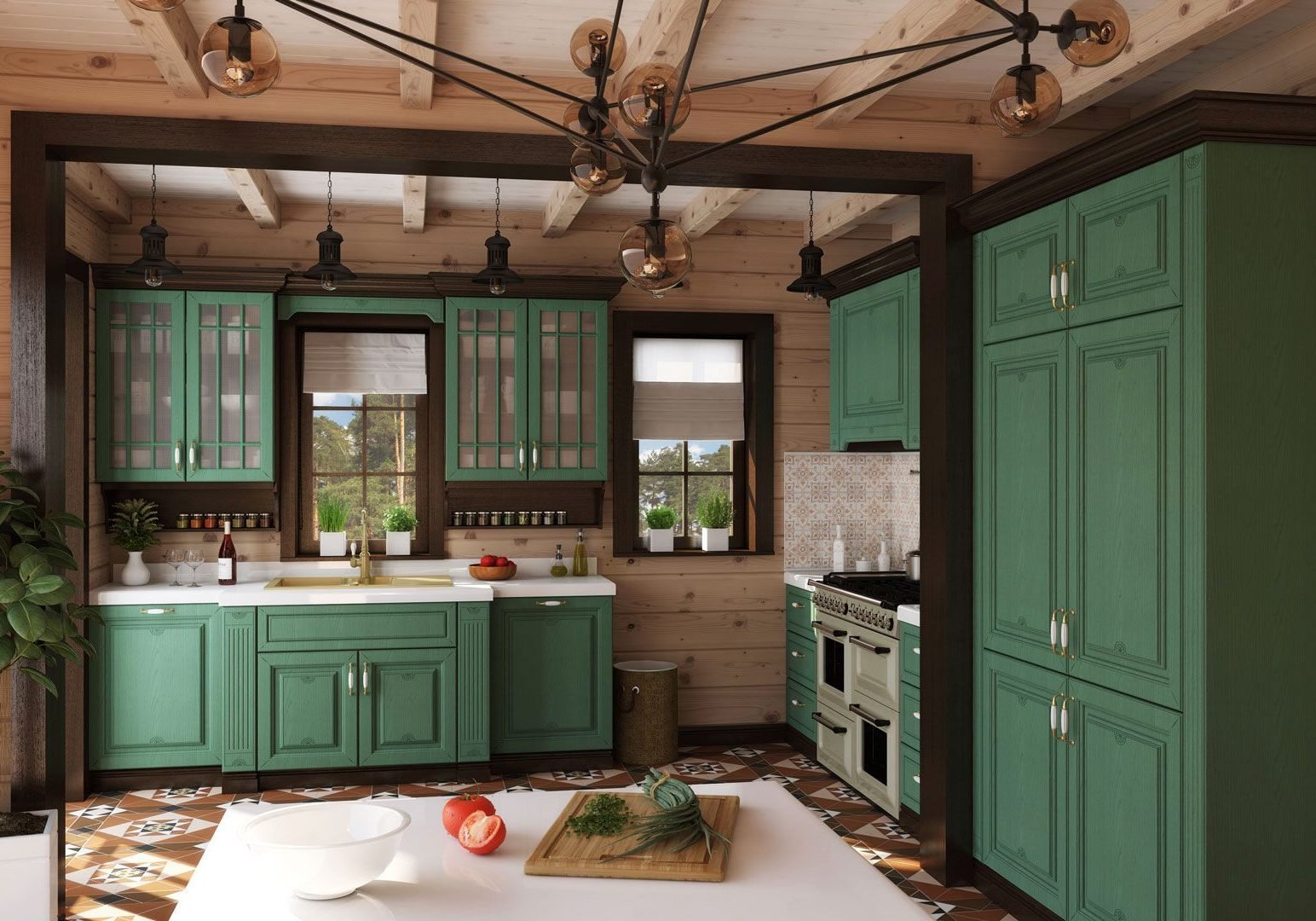 Изумрудная кухня в деревянном доме