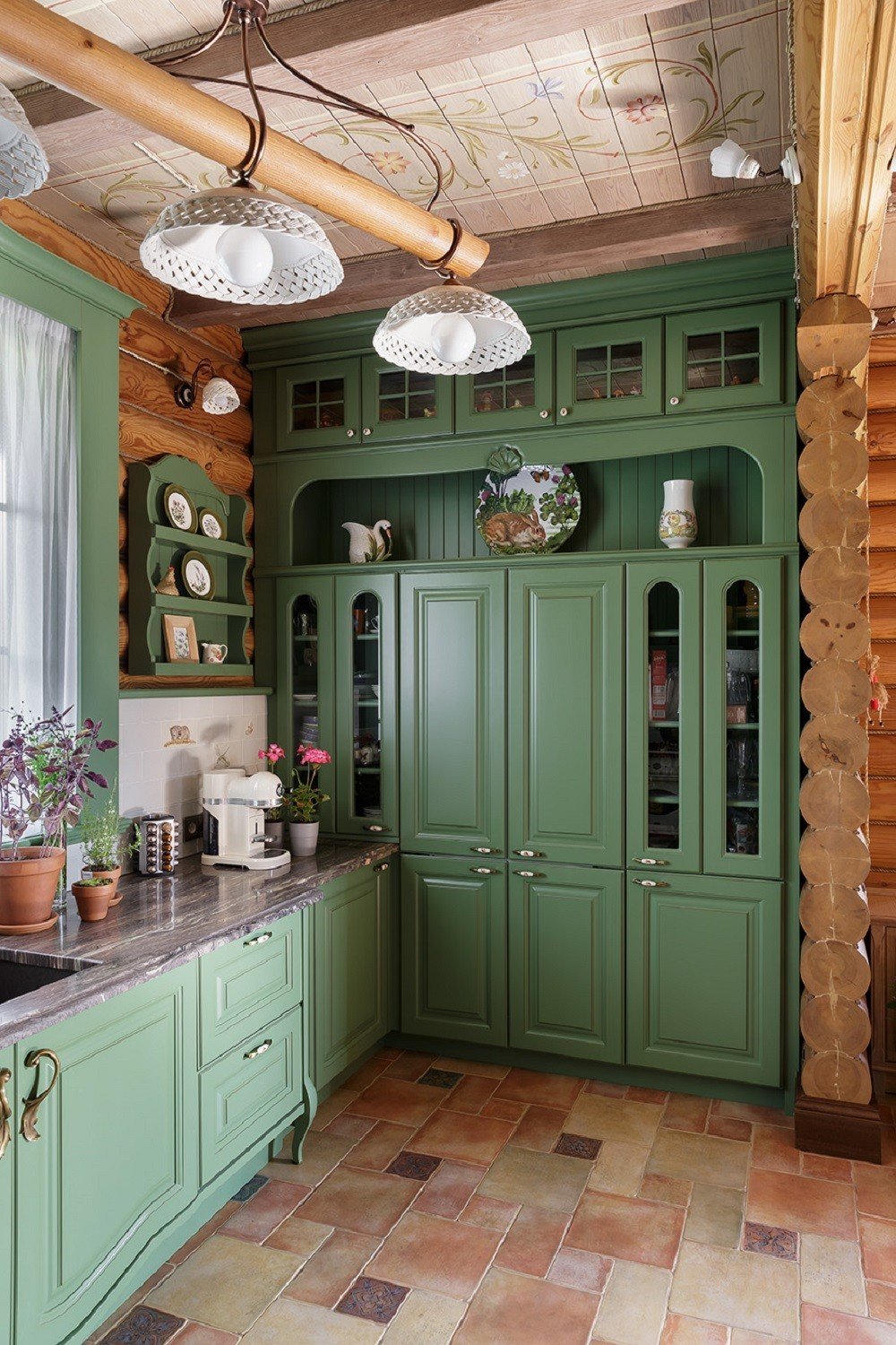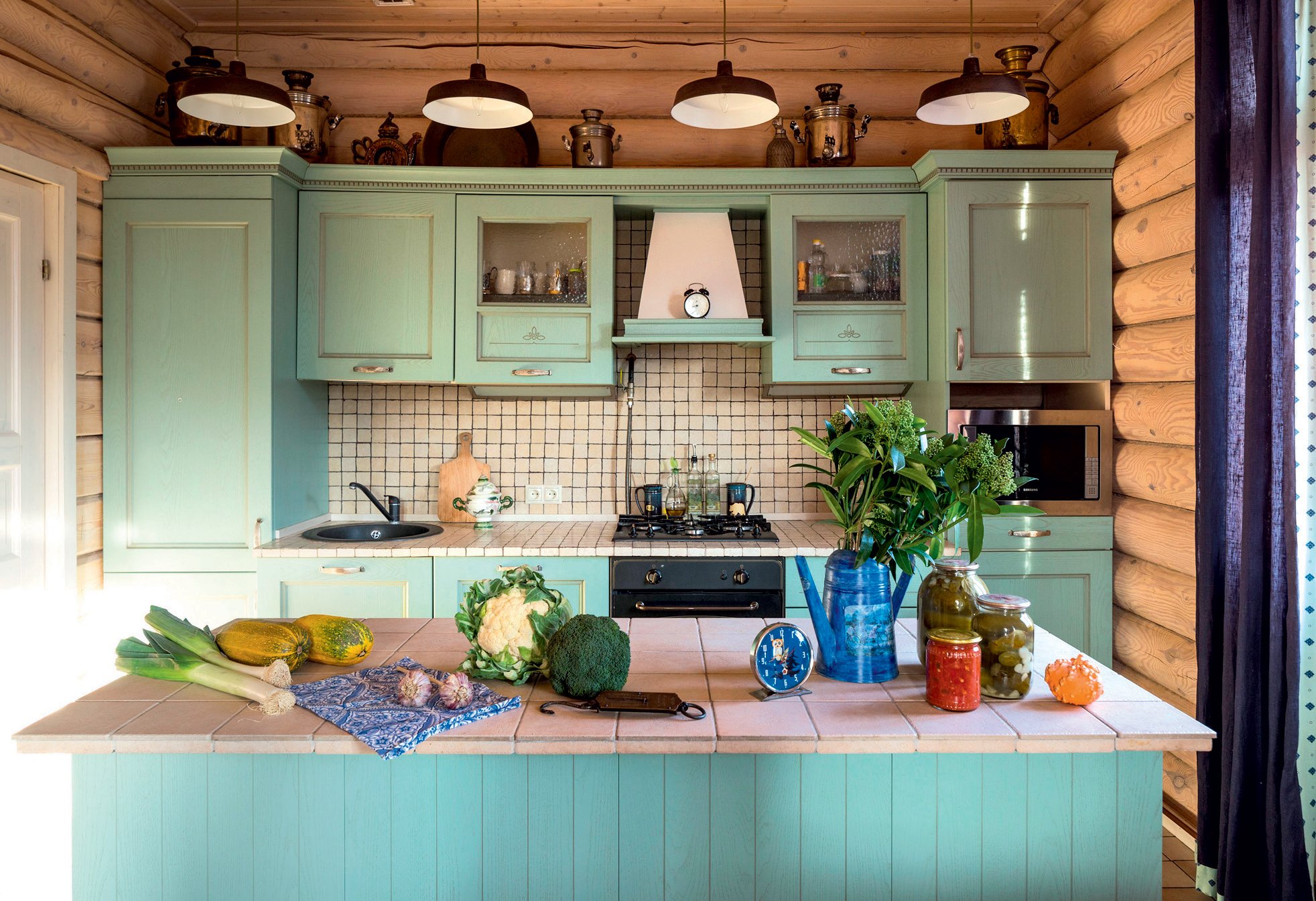 Кухня зеленого цвета в деревянном доме
