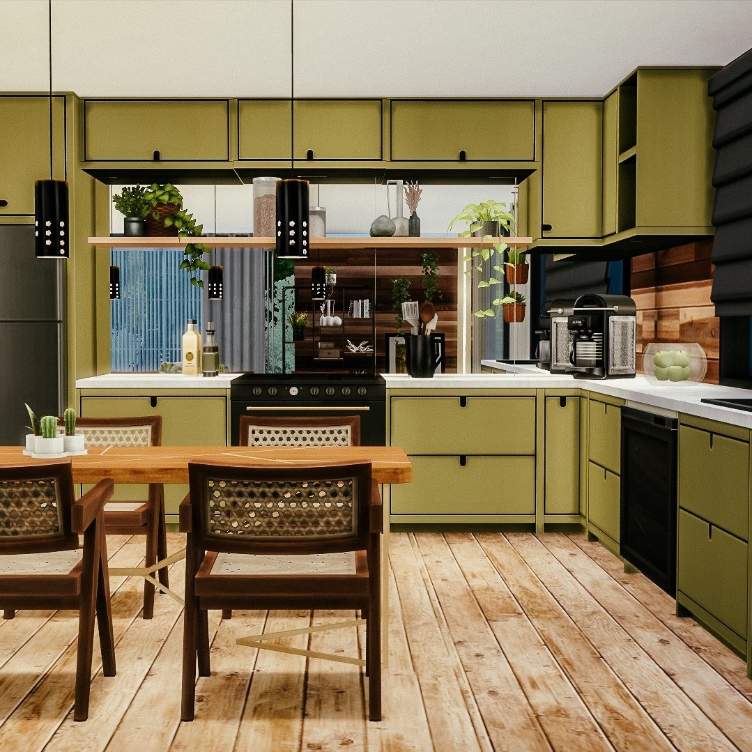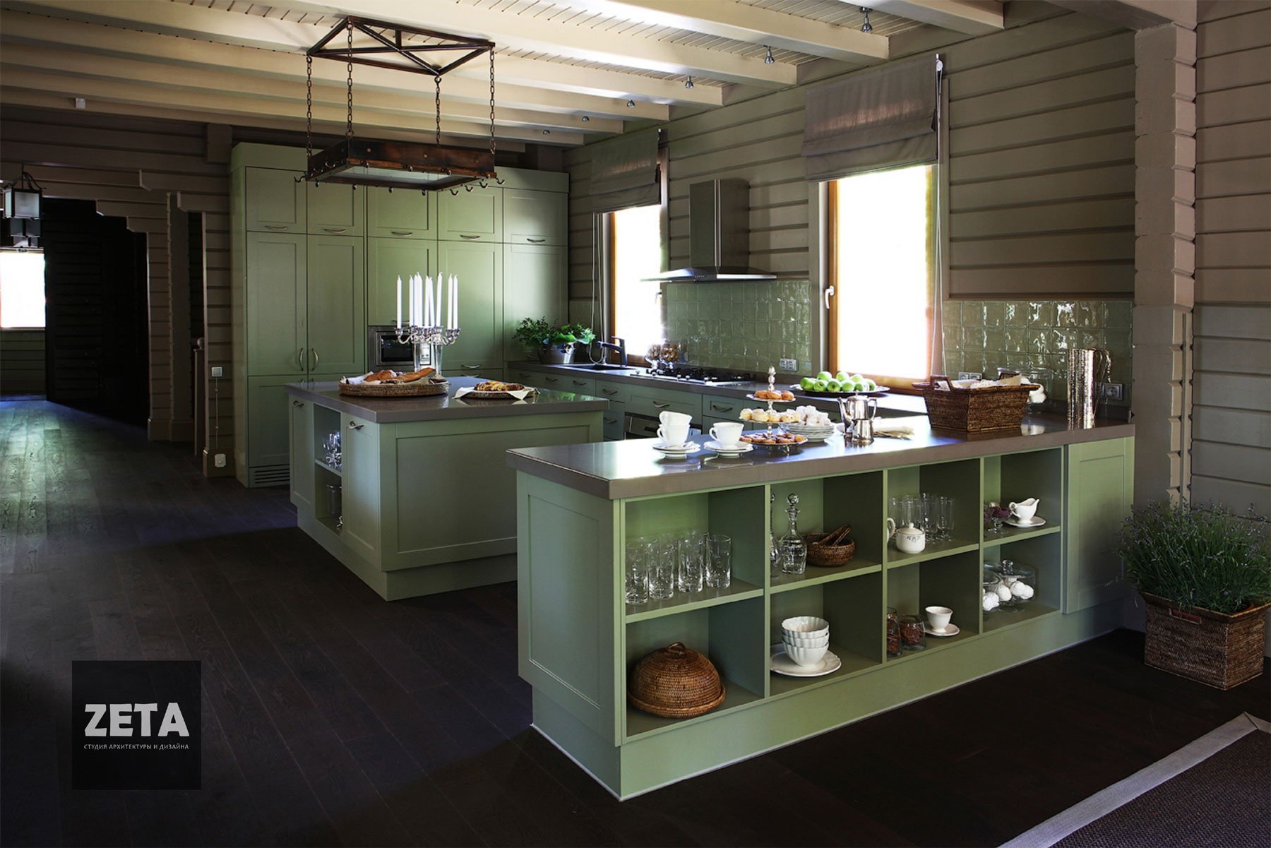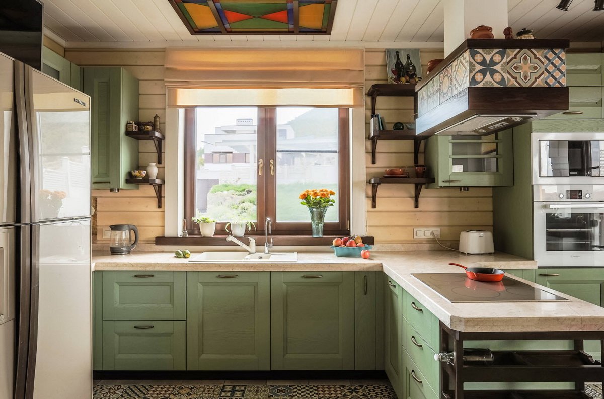 Оливковая кухня в деревянном доме