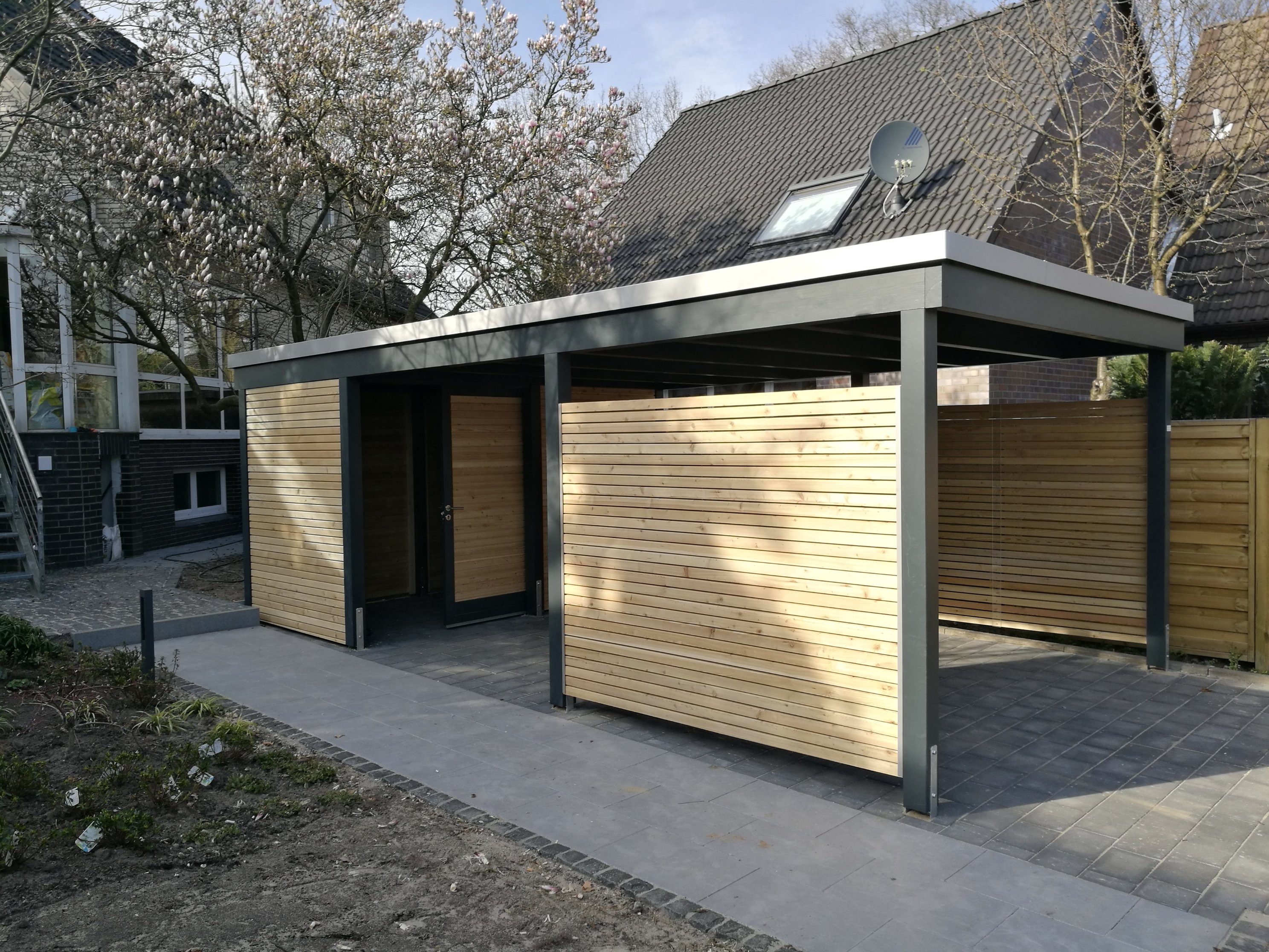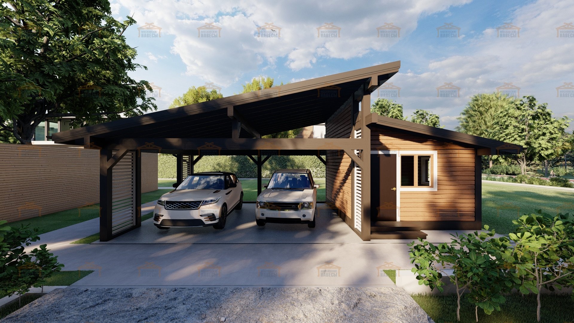 Навес на две машины с хозблоком