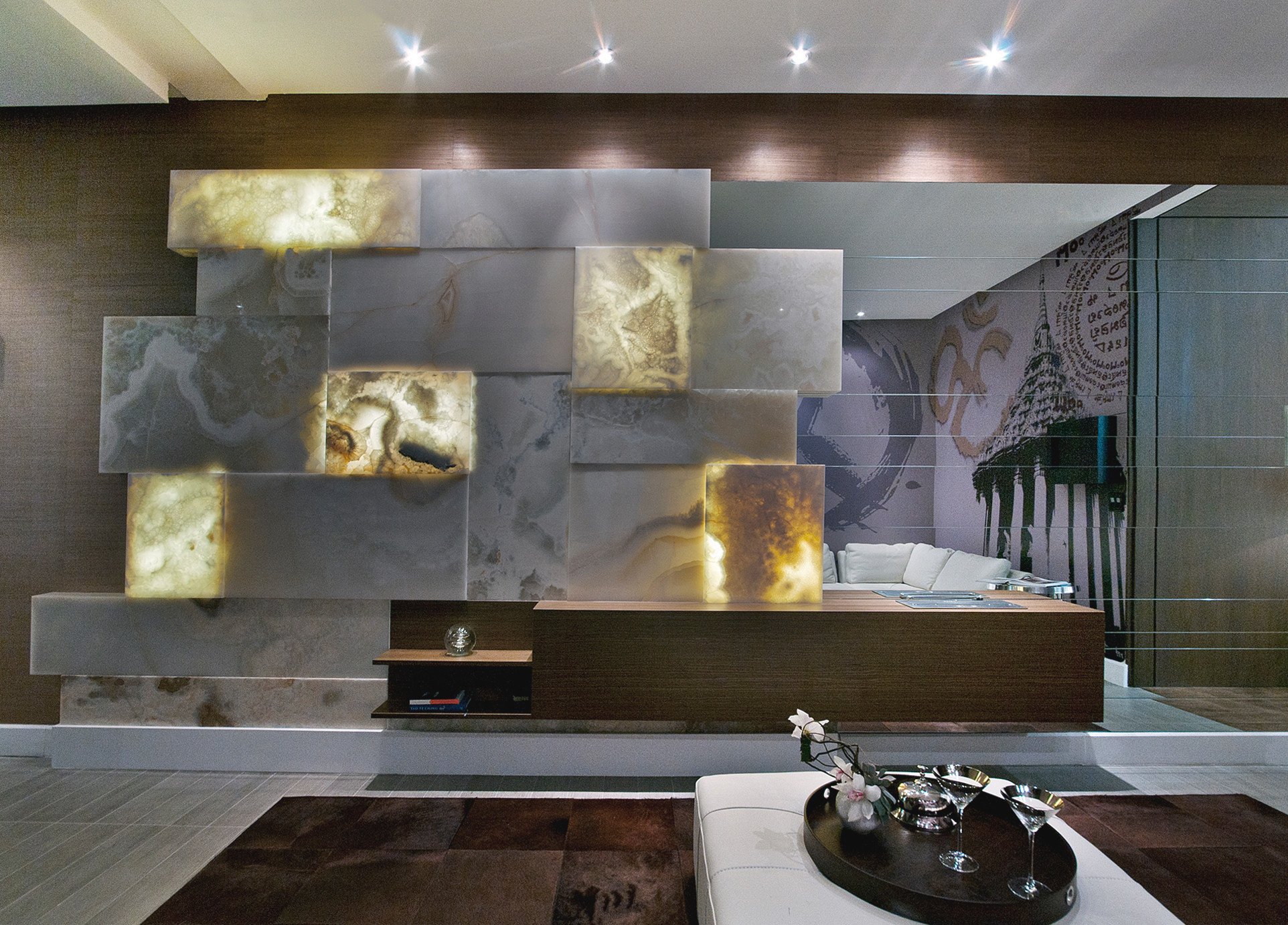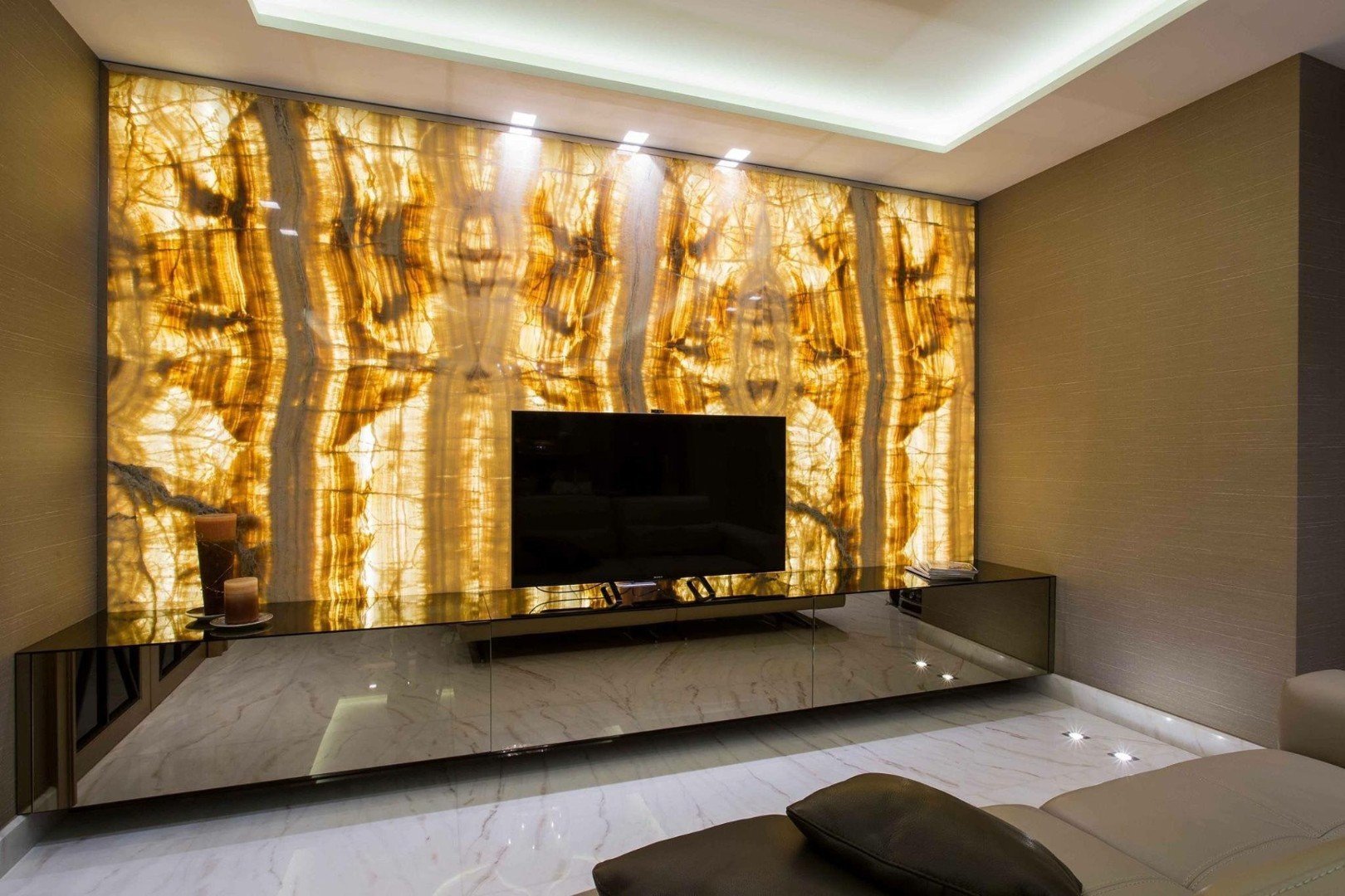 Оникс в интерьере гостиной с подсветкой
