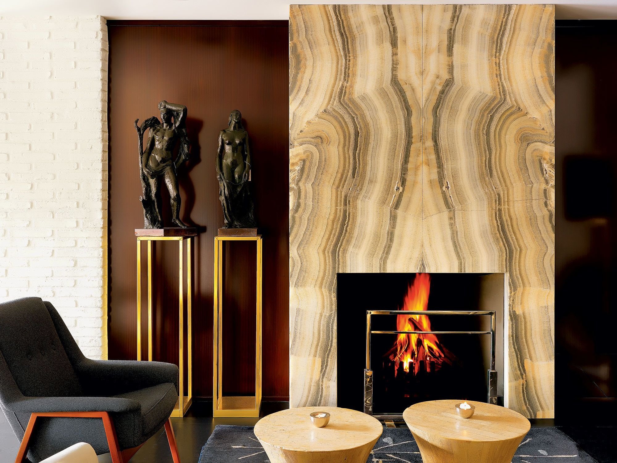 Оникс в интерьере гостиной с камином
