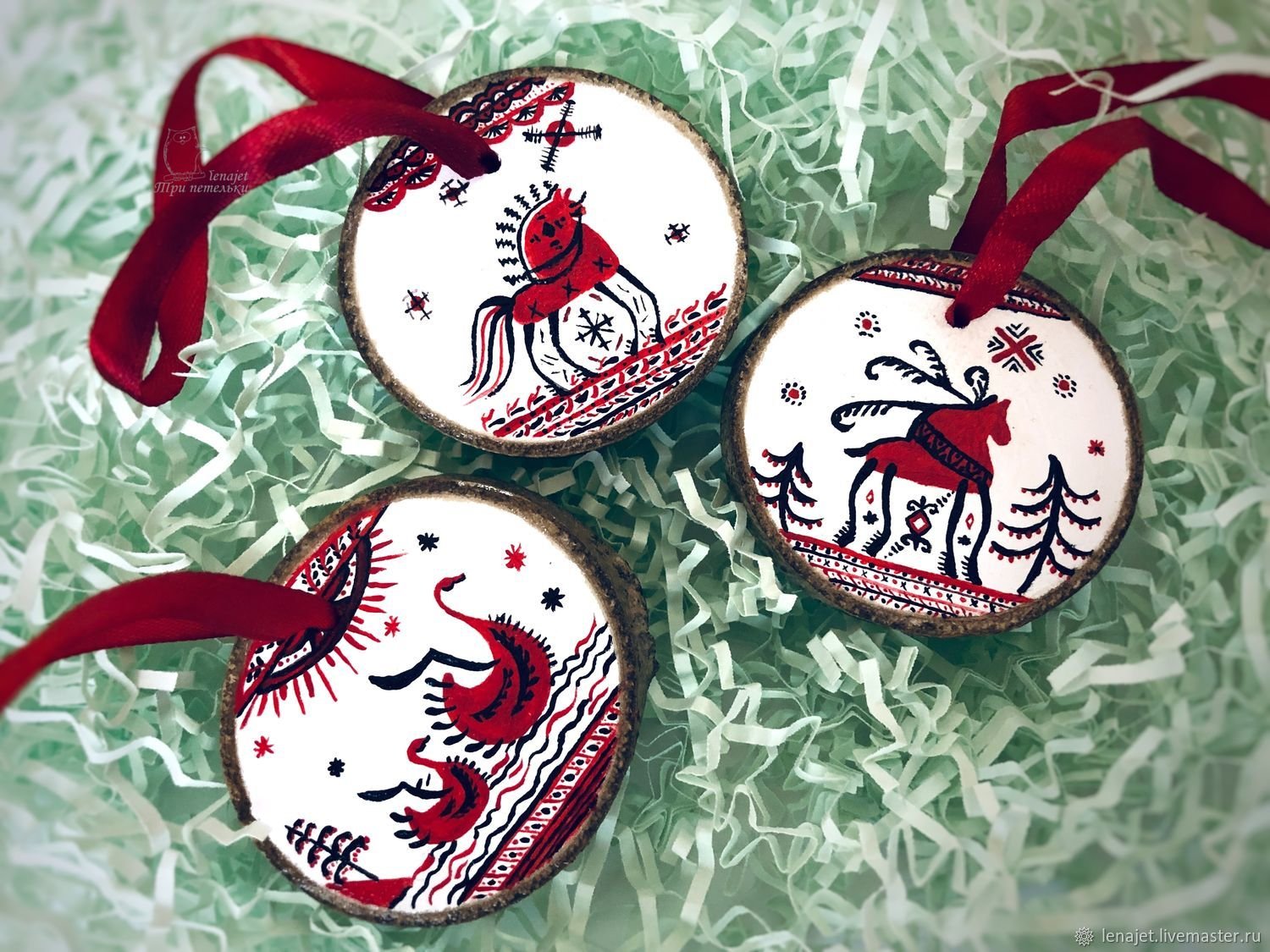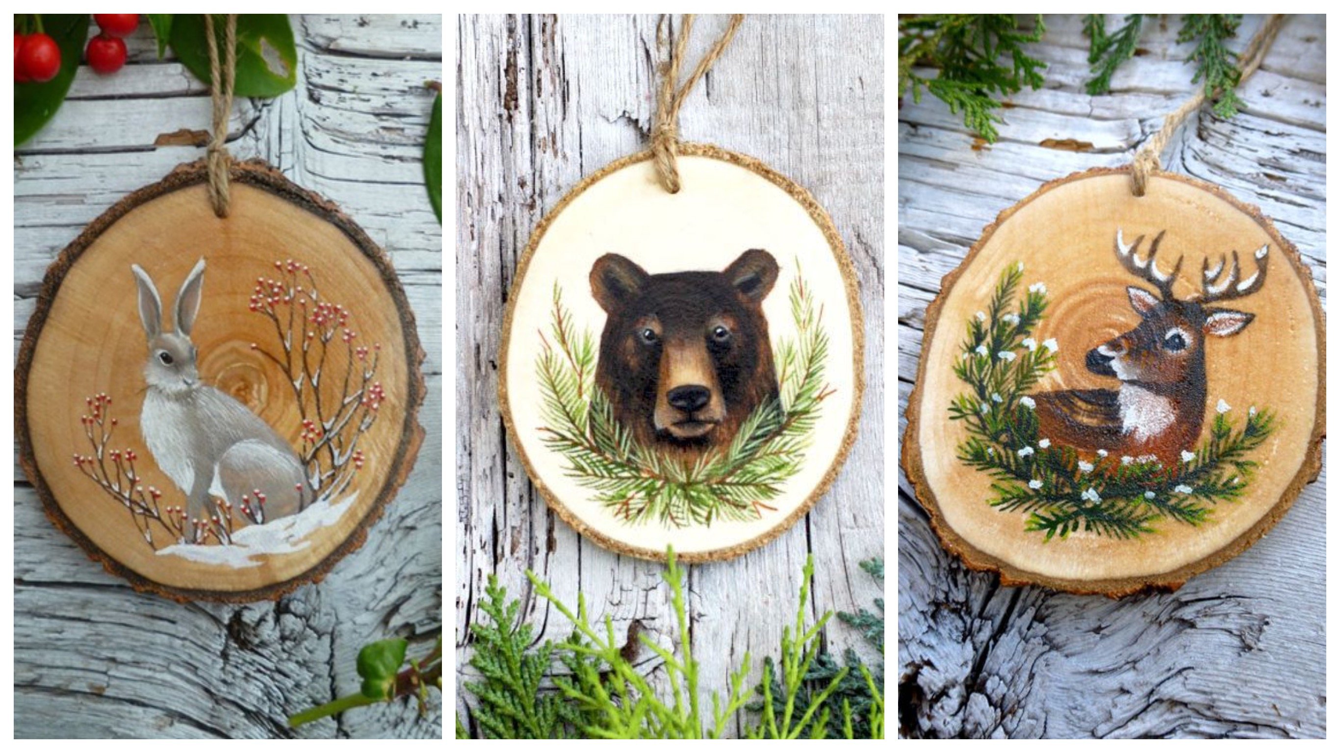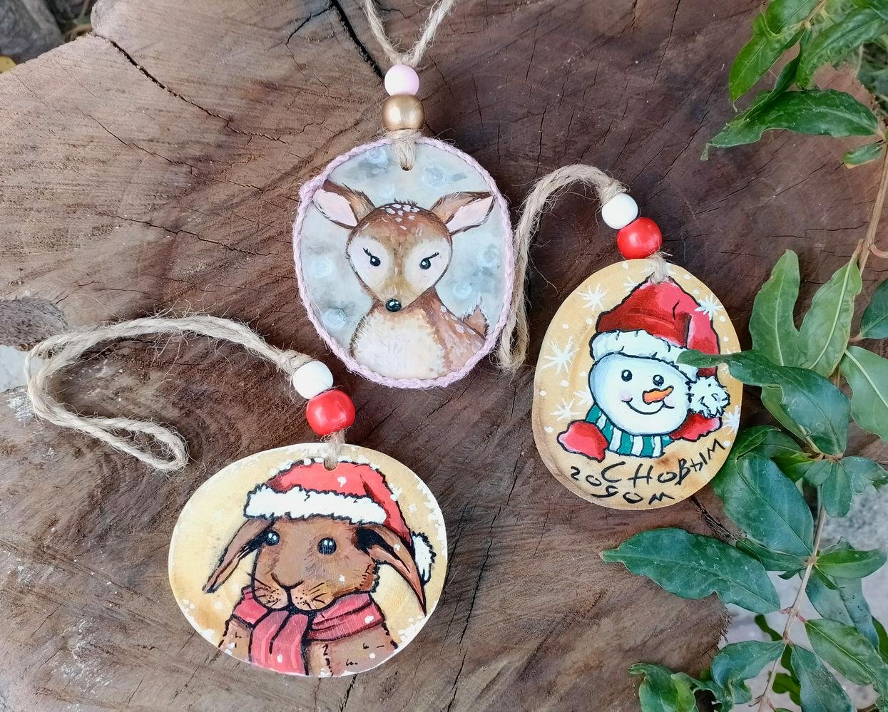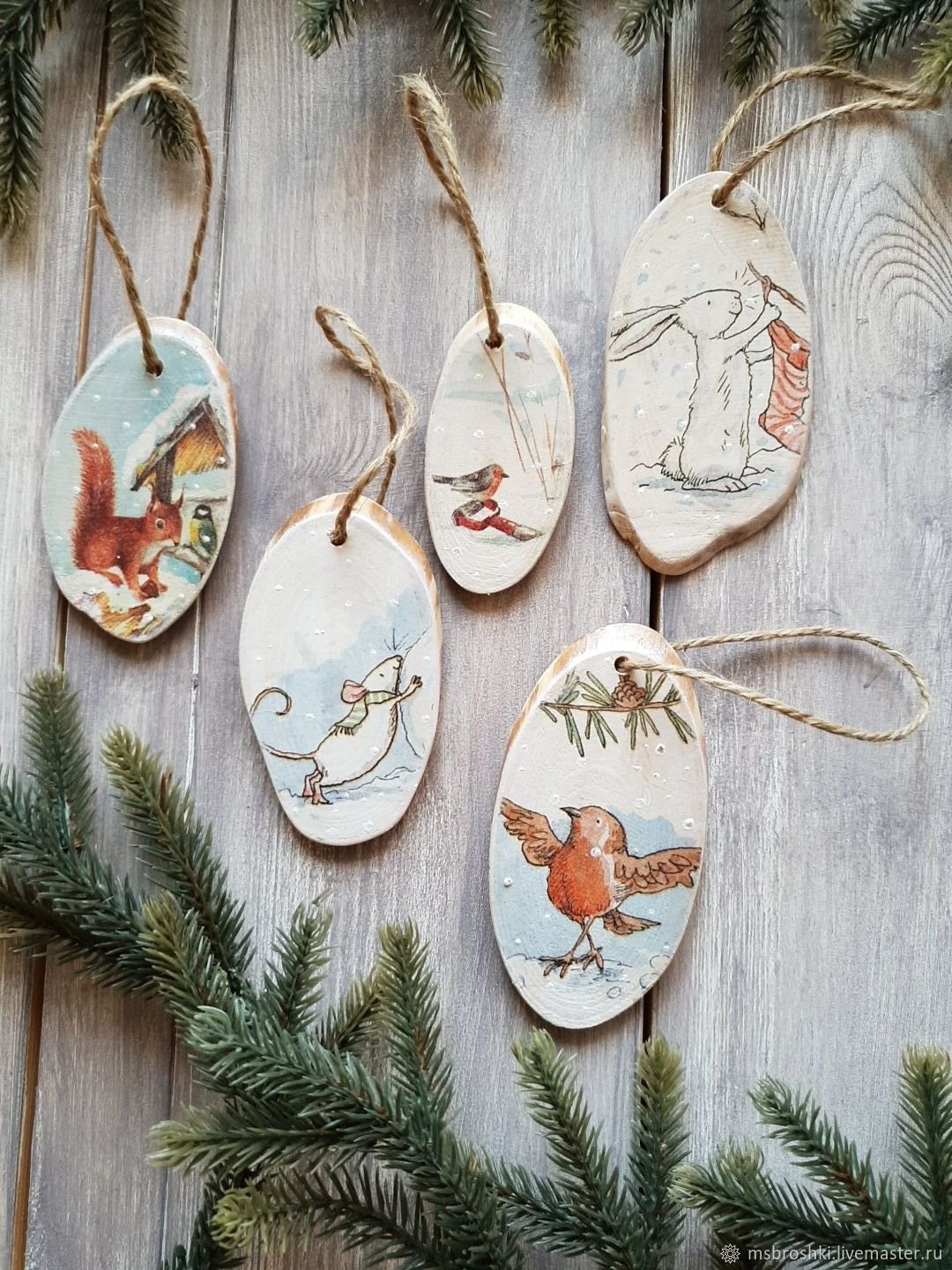 Елочные игрушки на деревянных спилах