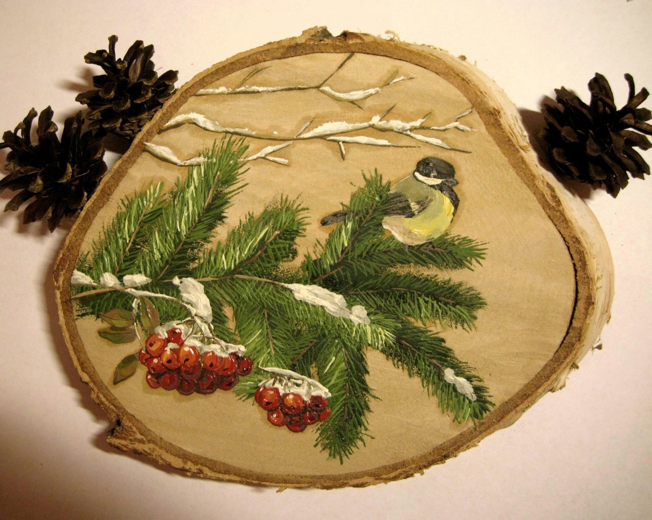 Роспись на спиле дерева новогодняя