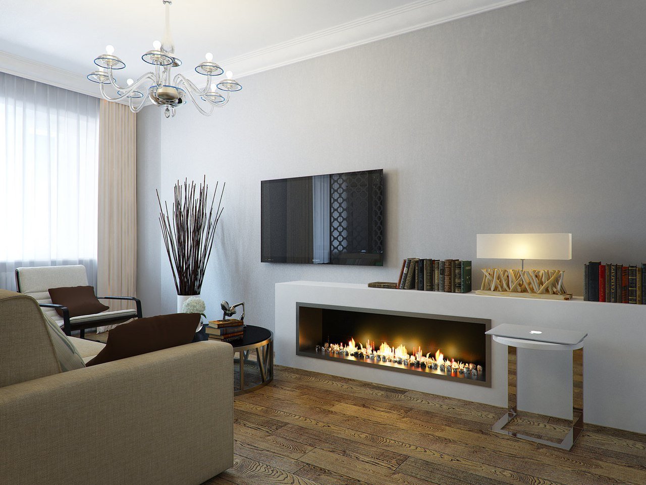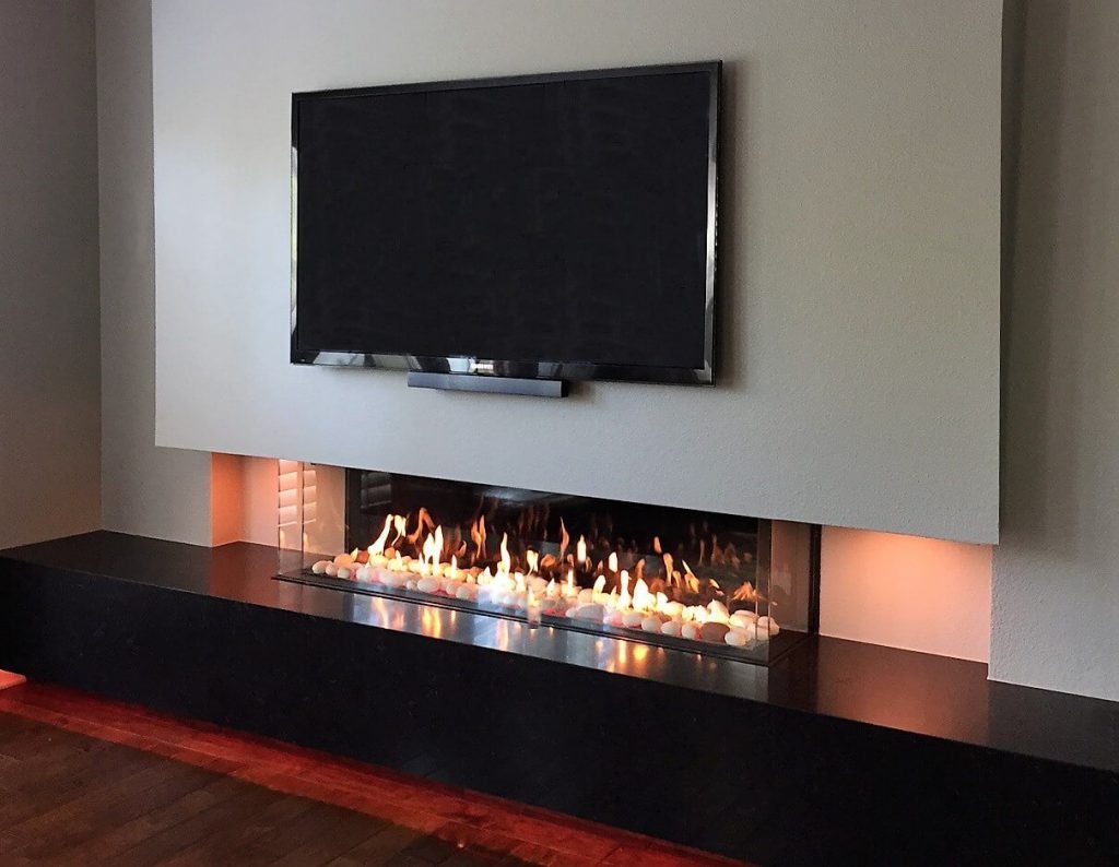 Линейный камин в интерьере гостиной