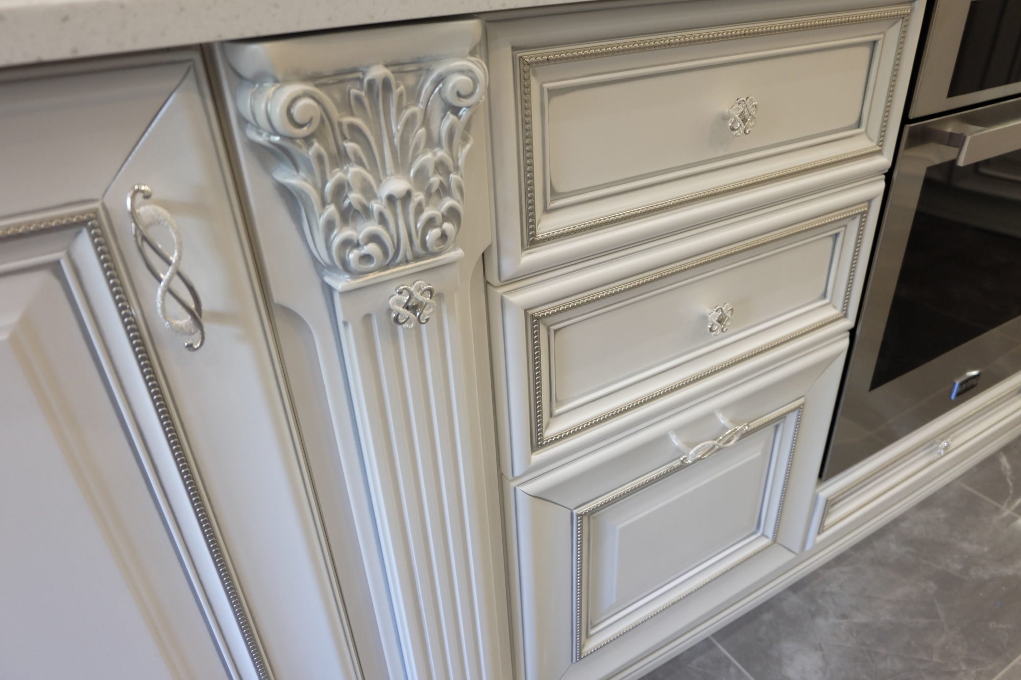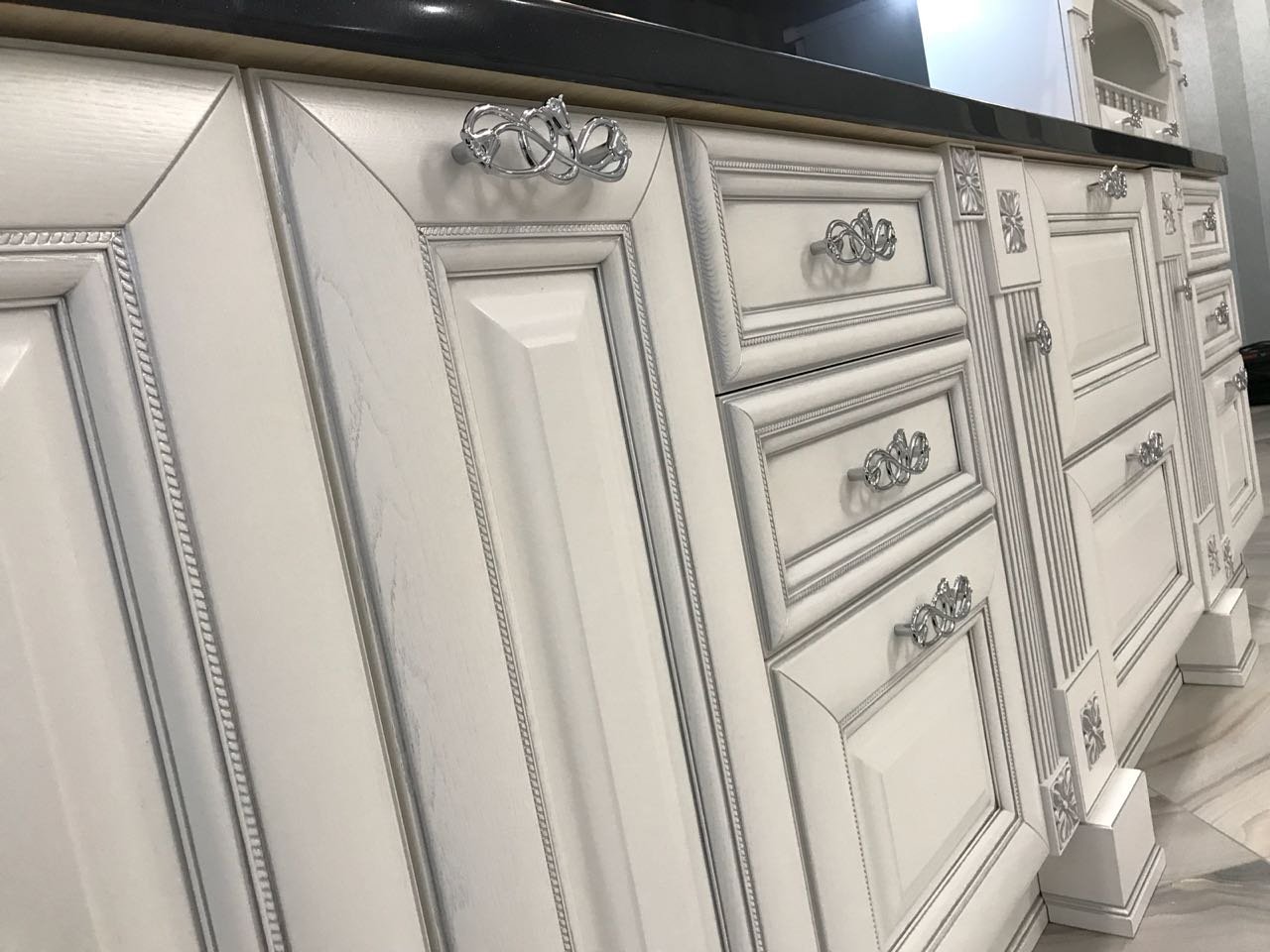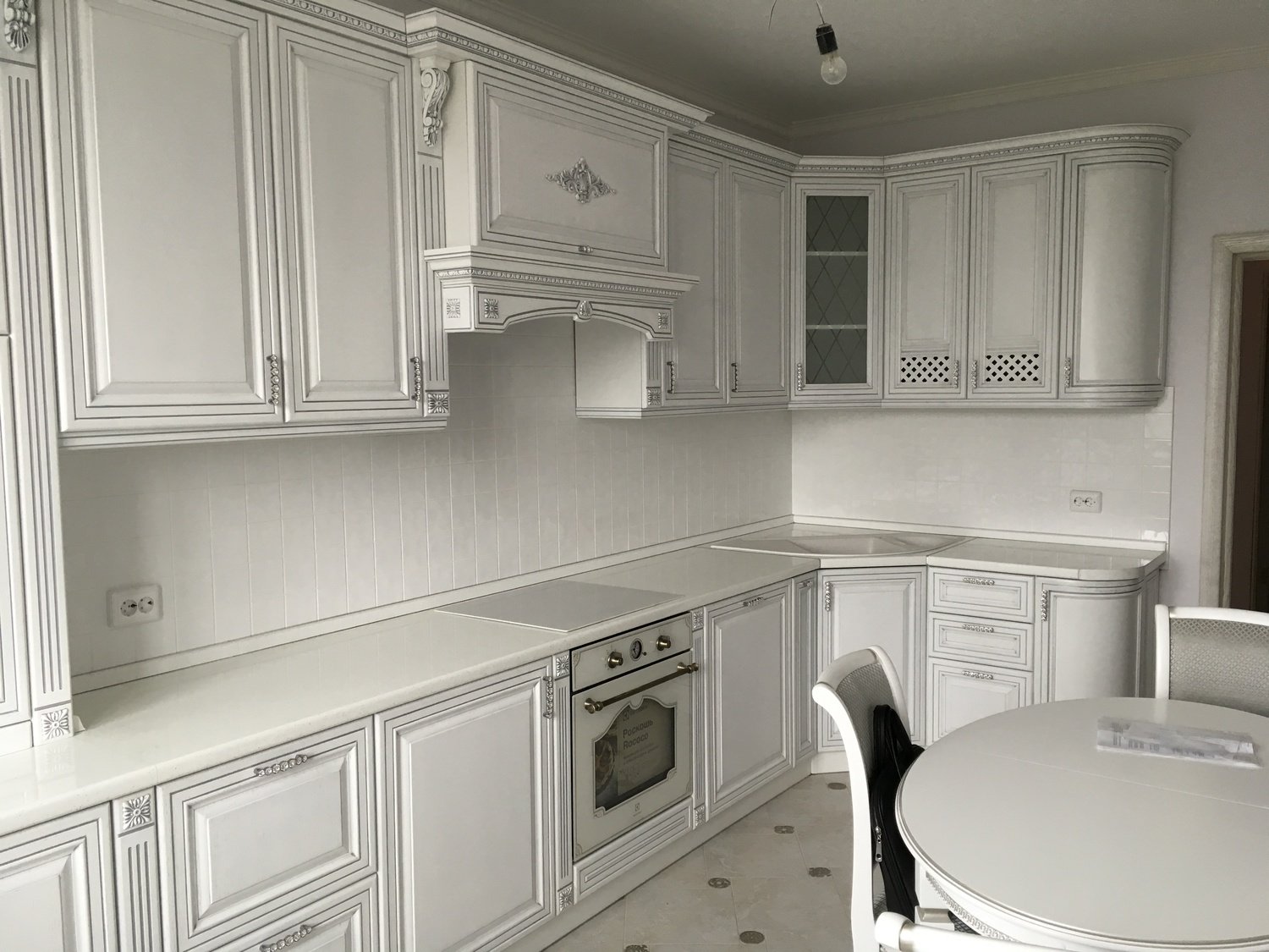Белая кухня Неоклассика патина серебро