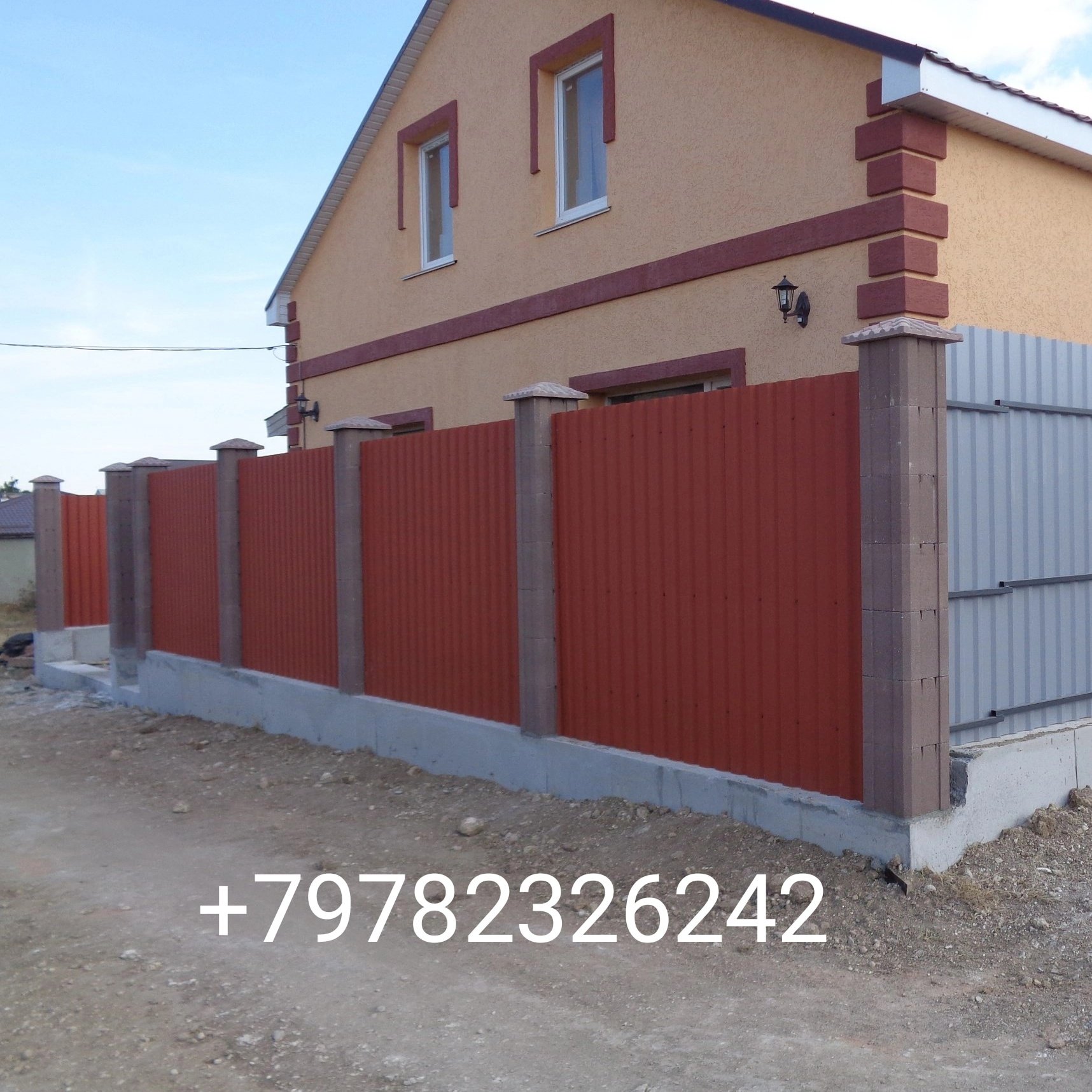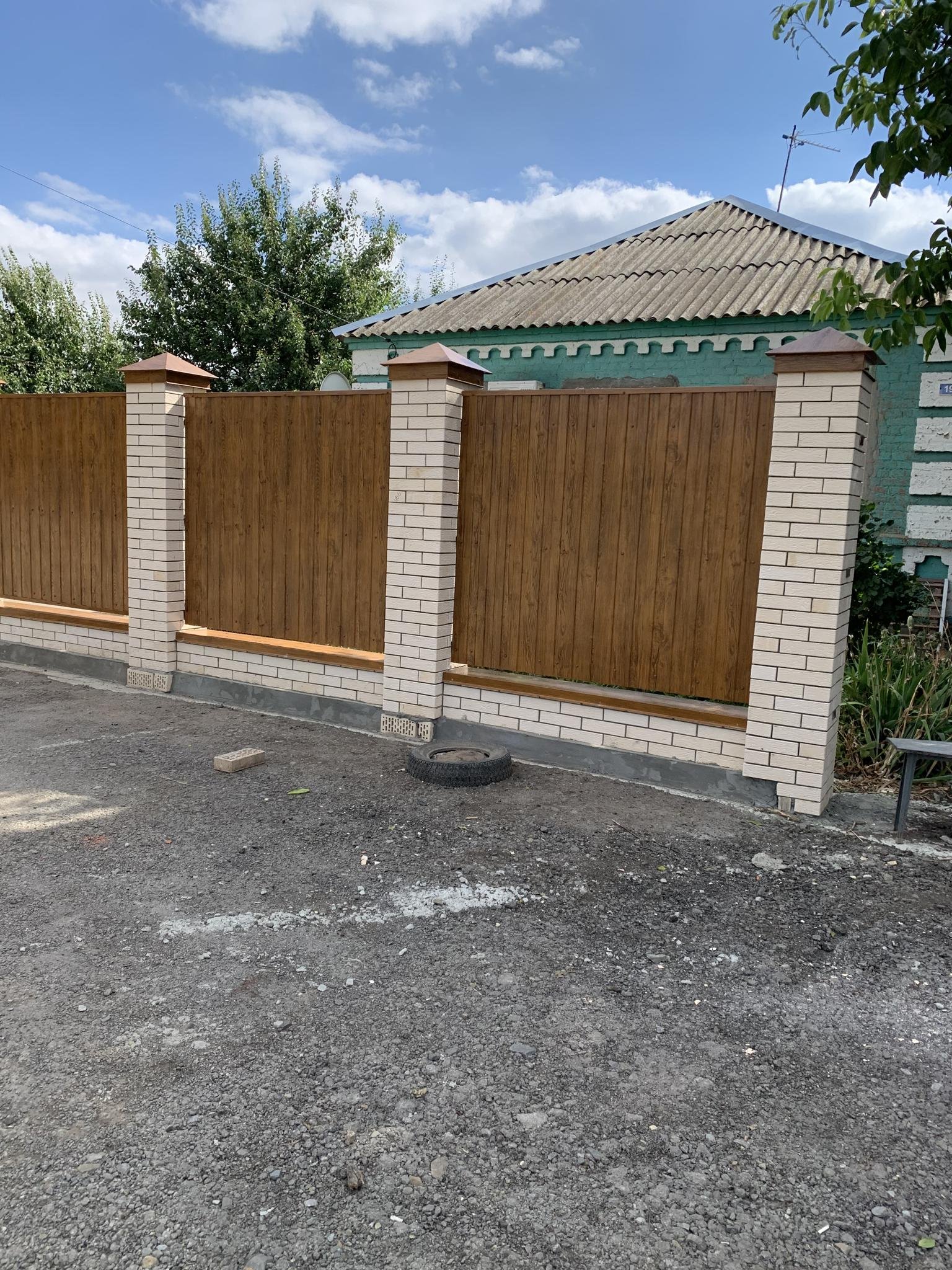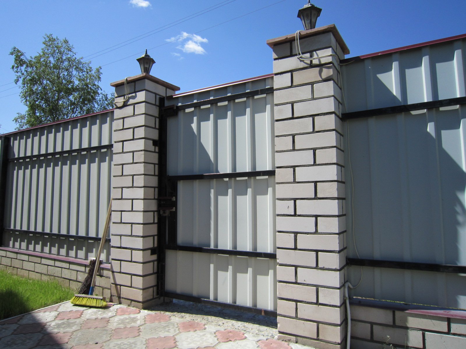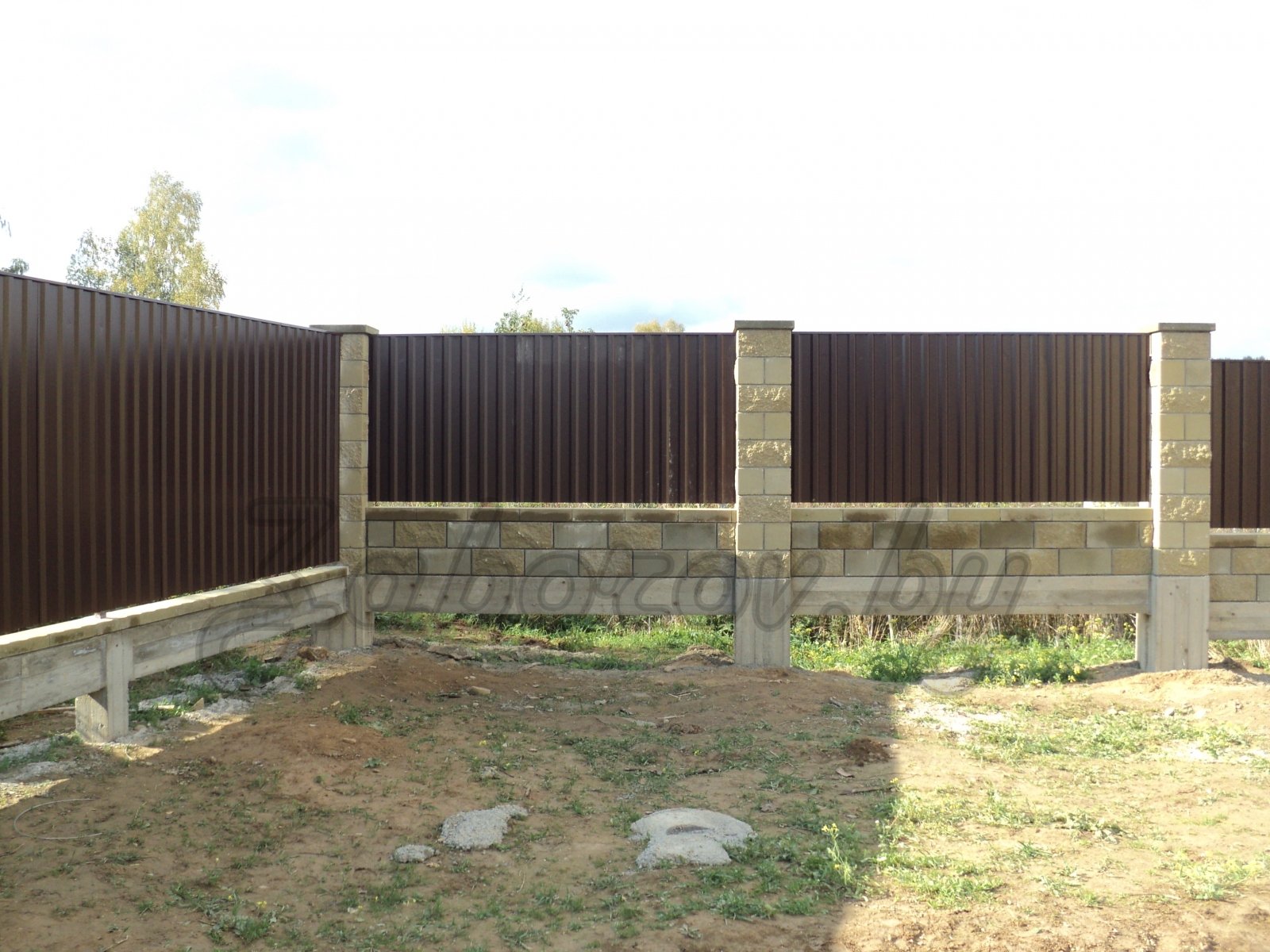 Забор каменные столбы и профлист