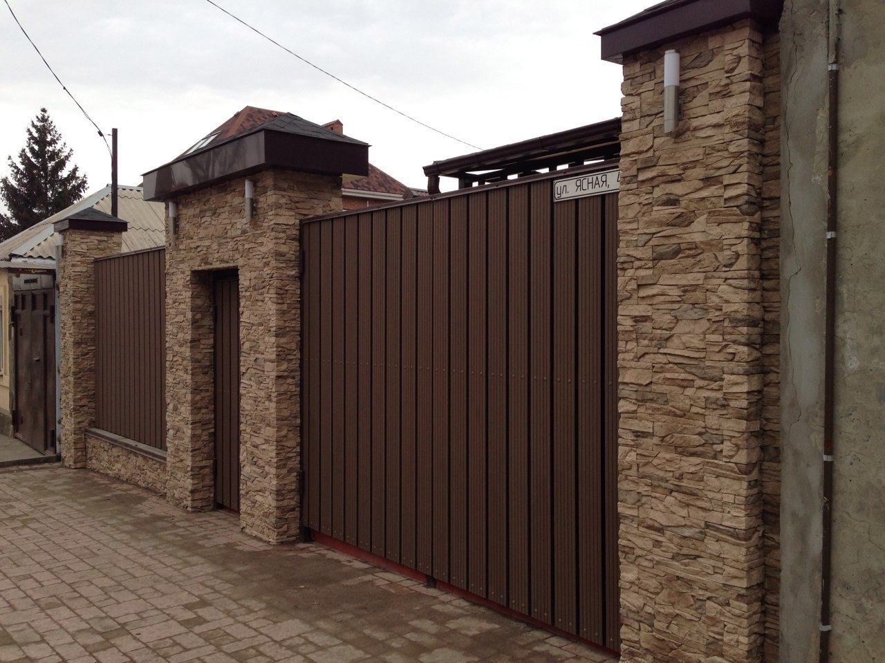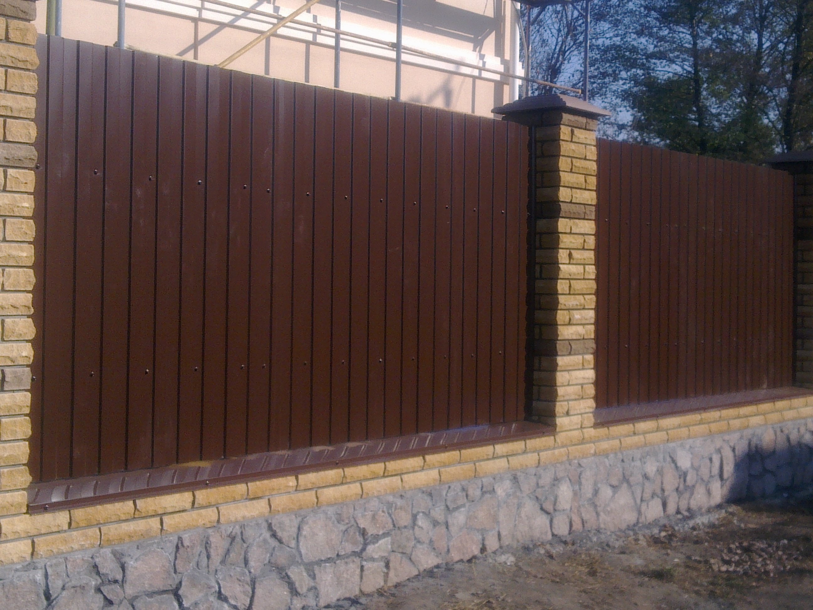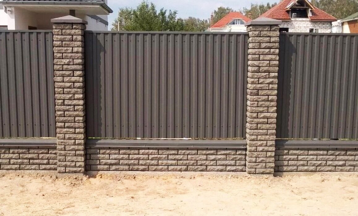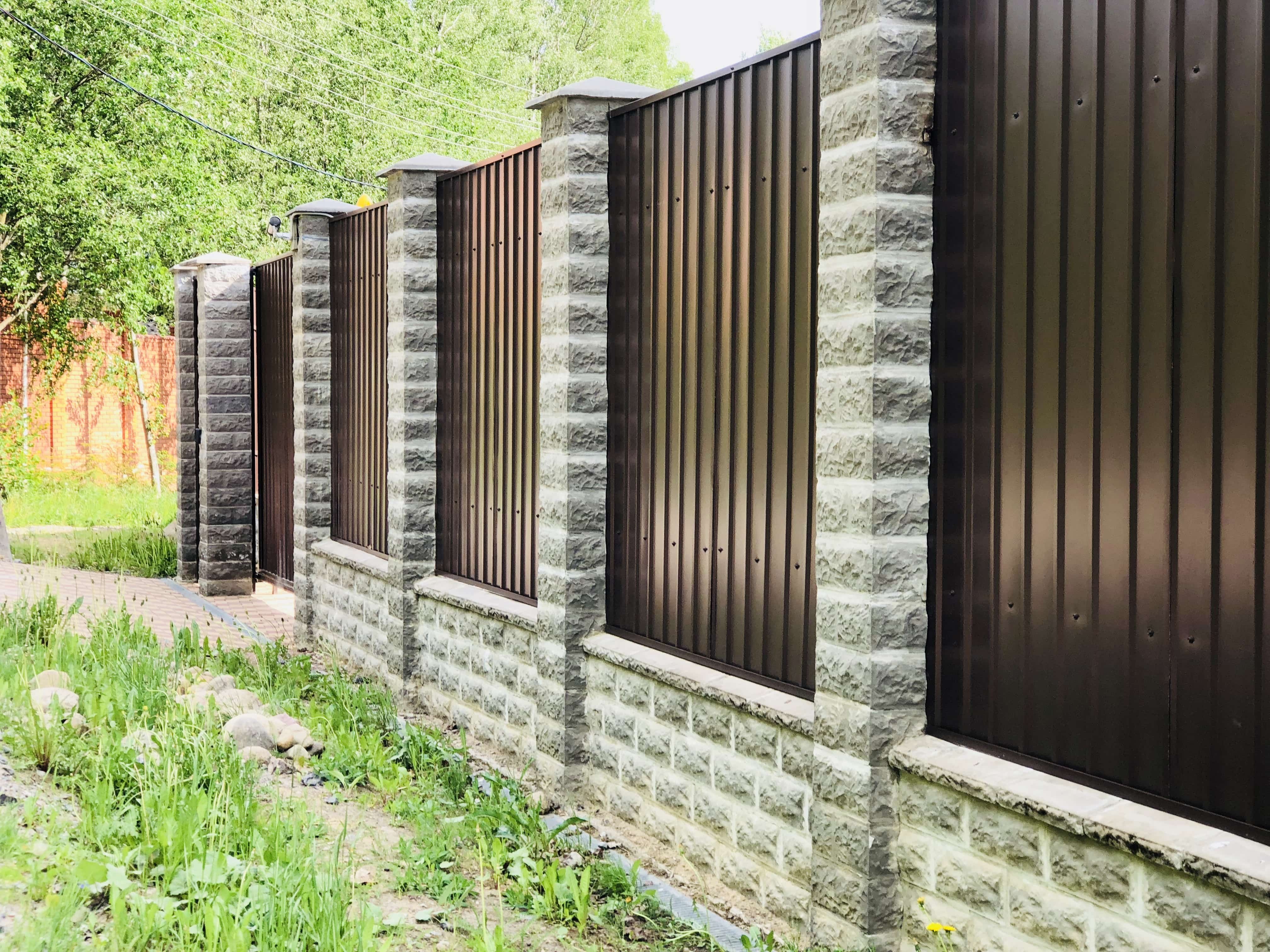 Забор с каменными столбами и профлистом