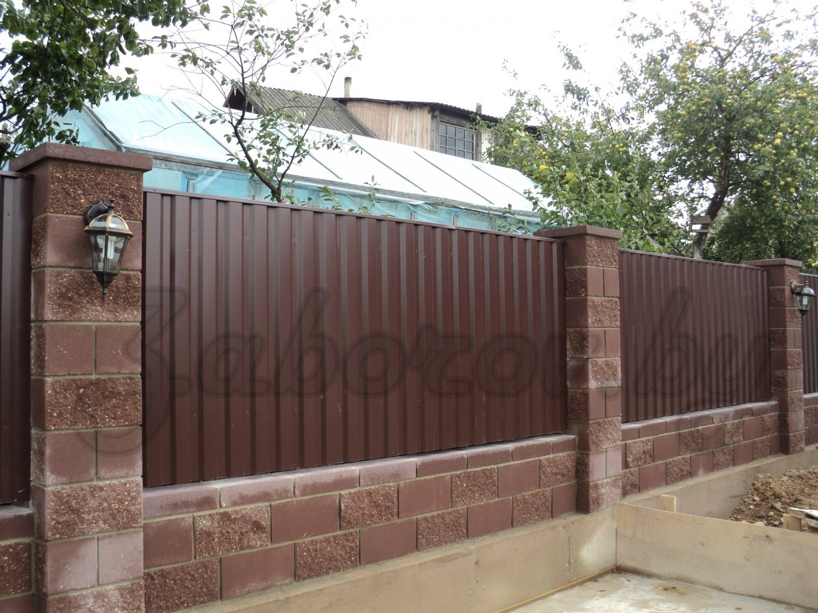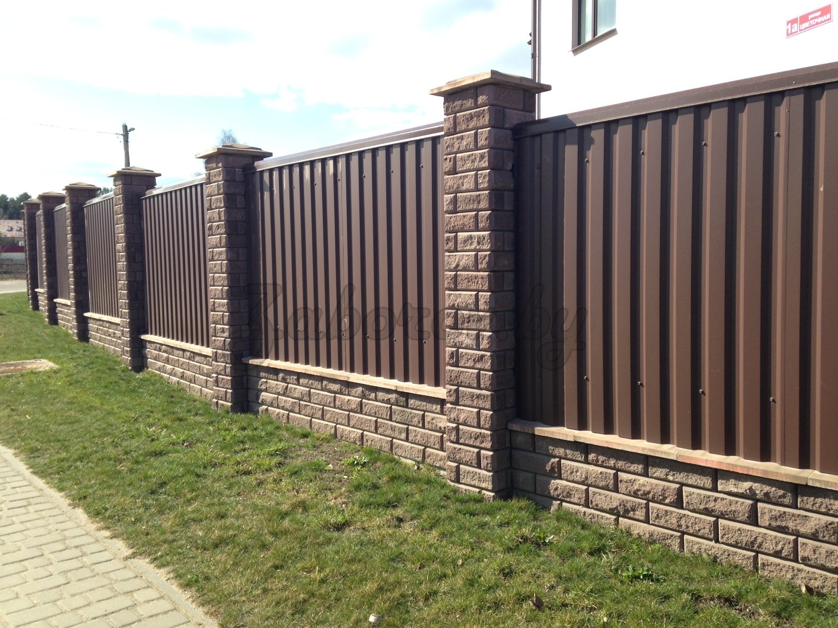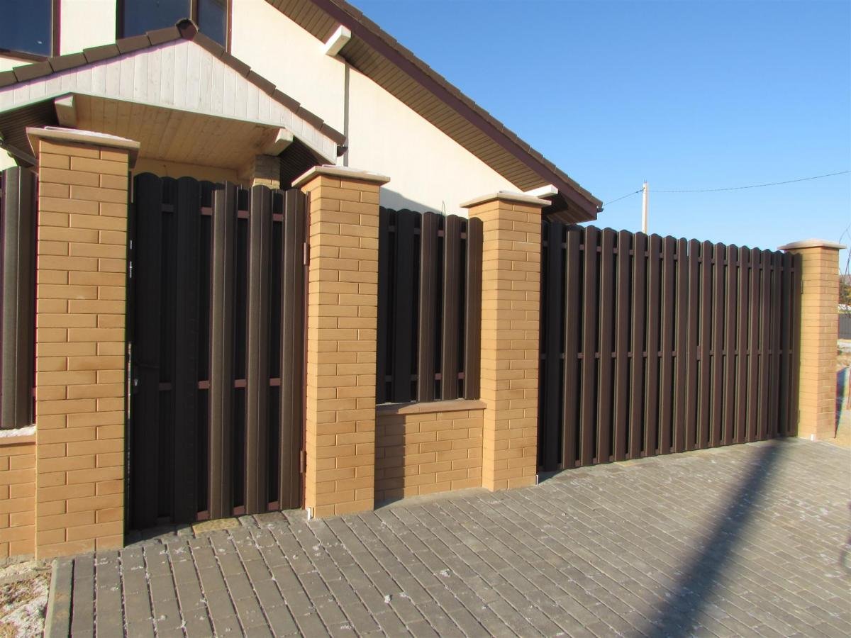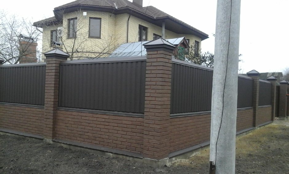 Забор с кирпичными столбами профлиста 7024