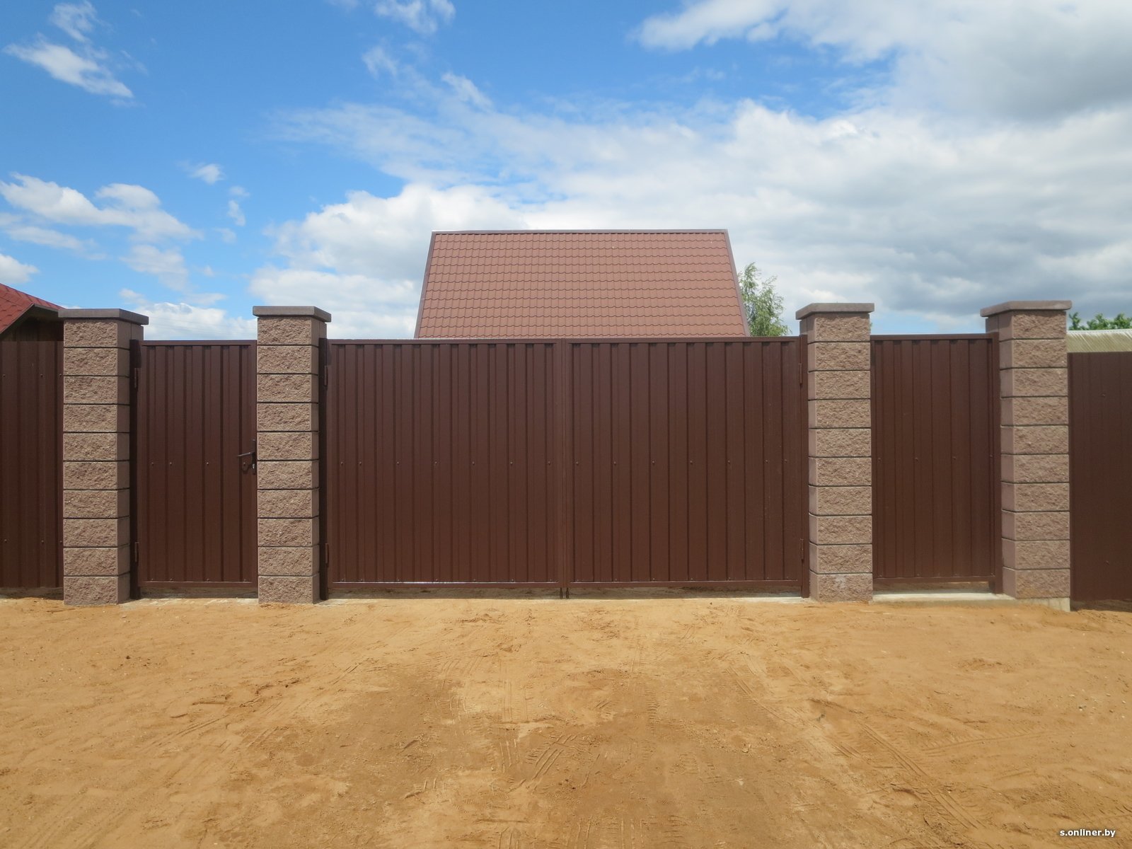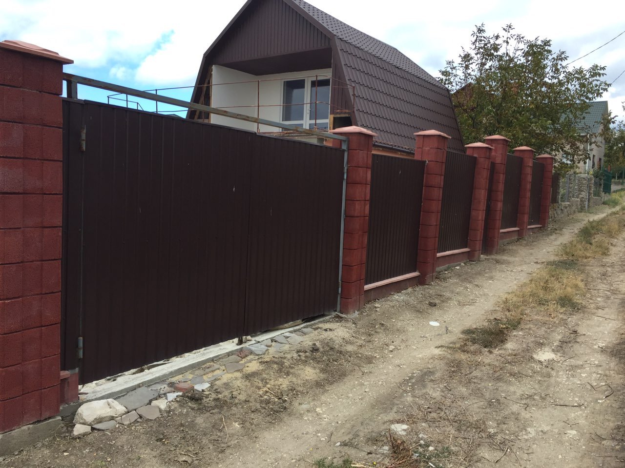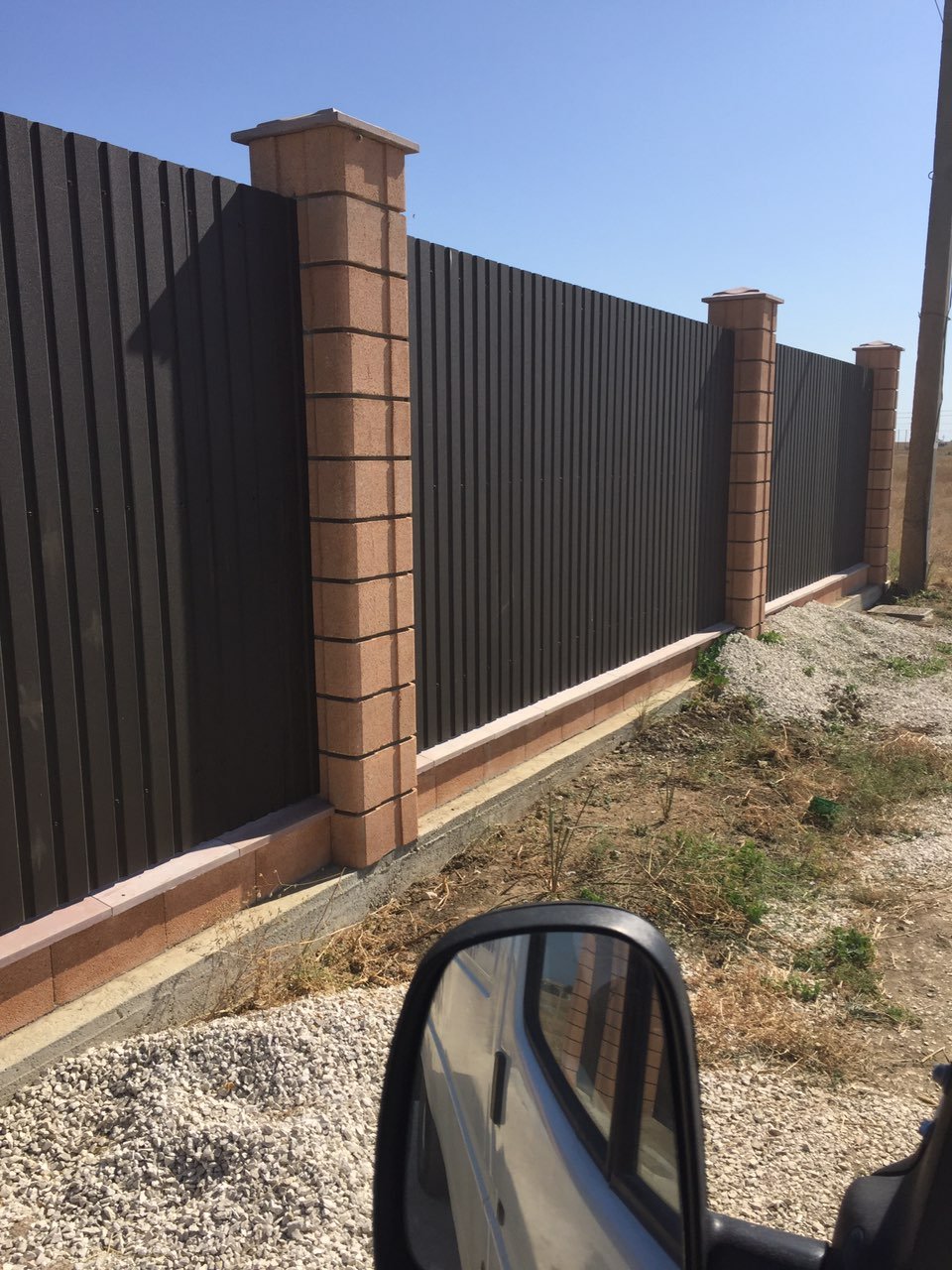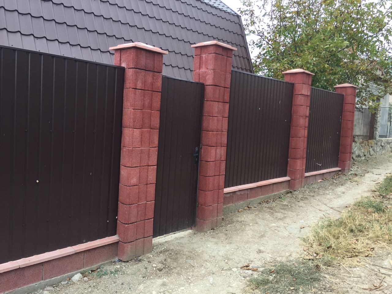 Забор с кирпичными столбами профлиста 7024