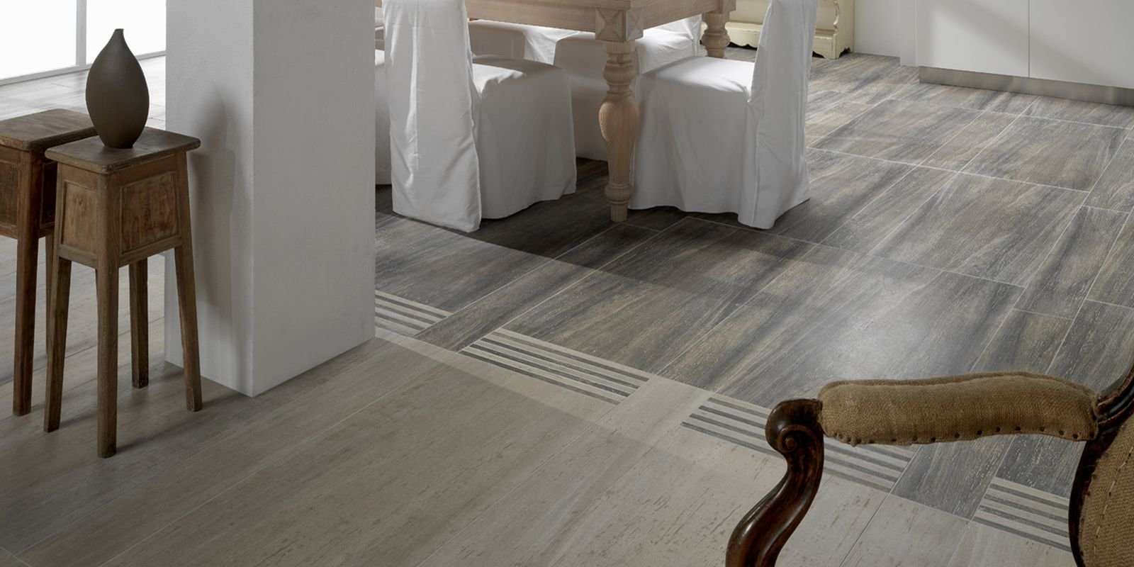 Сочетание светло серой плитки с ламинатом